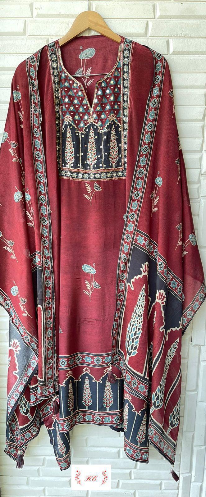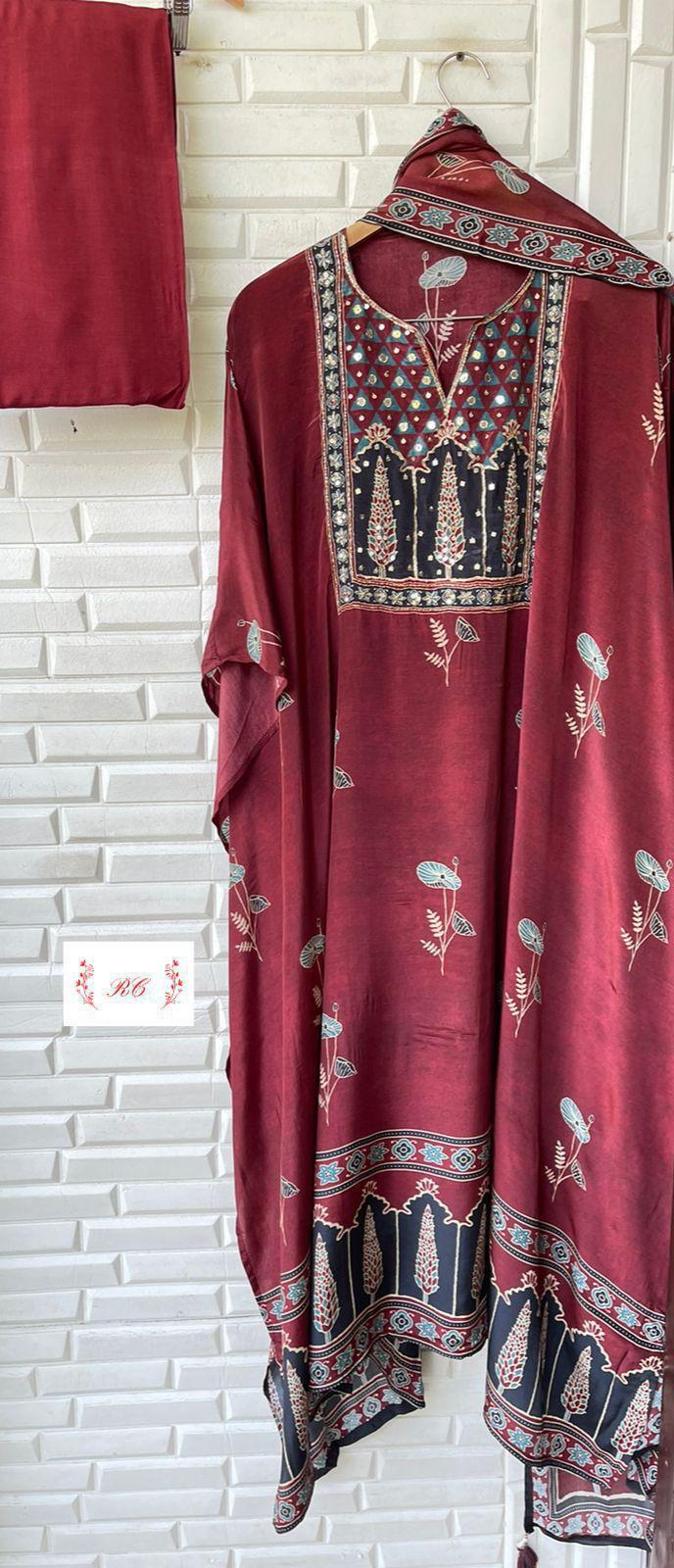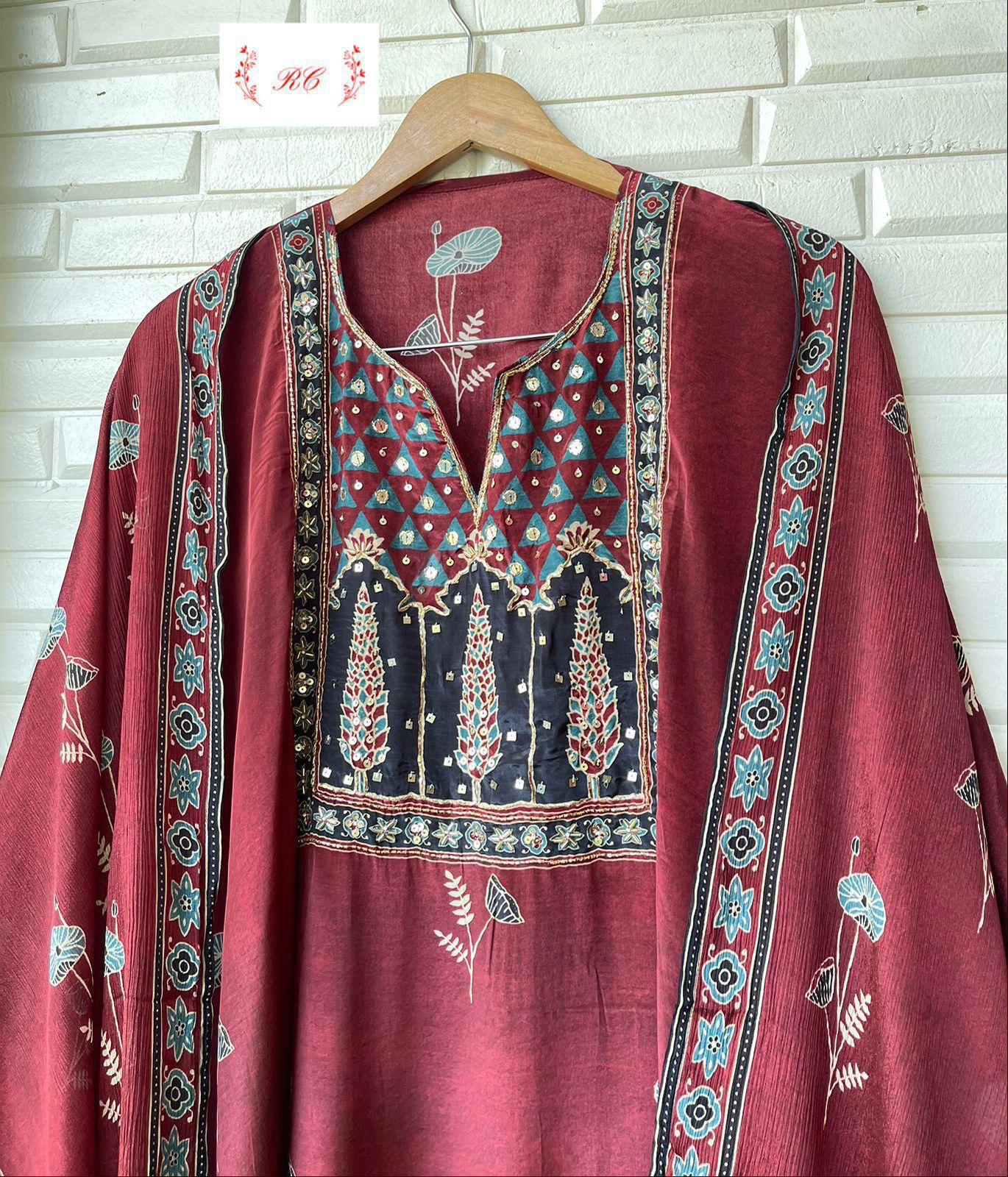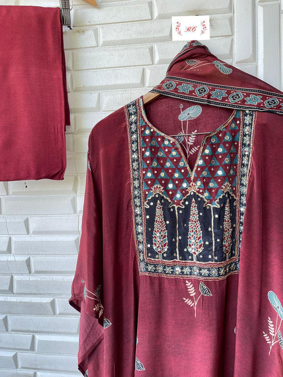 😊 Pure satin silk printed fabric unstitched shirt with sequence kutdanba dabka pearl embroidery