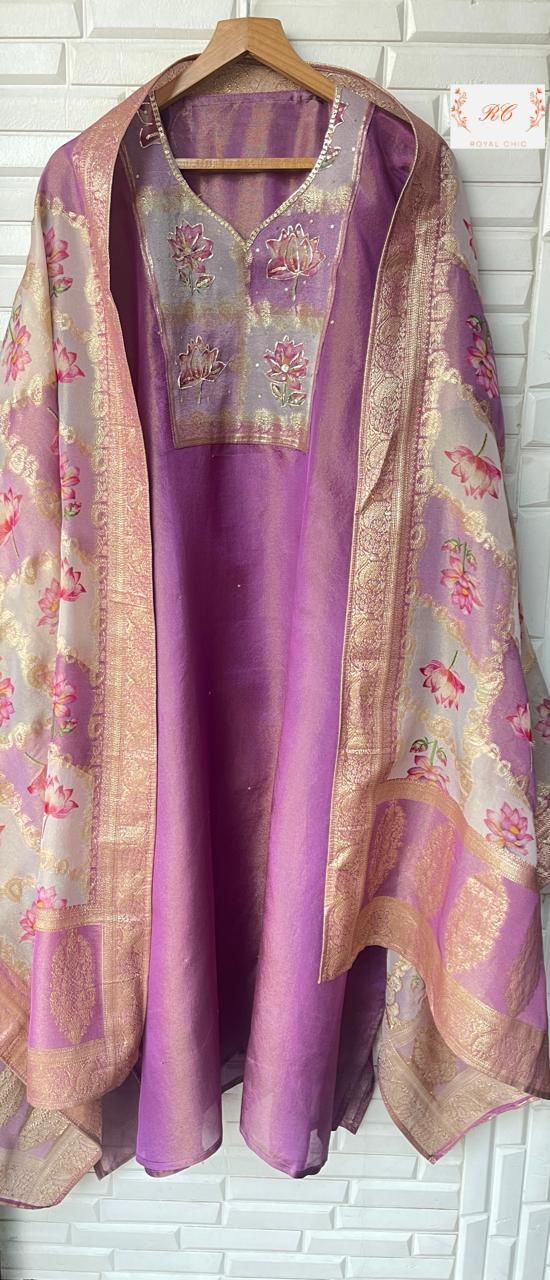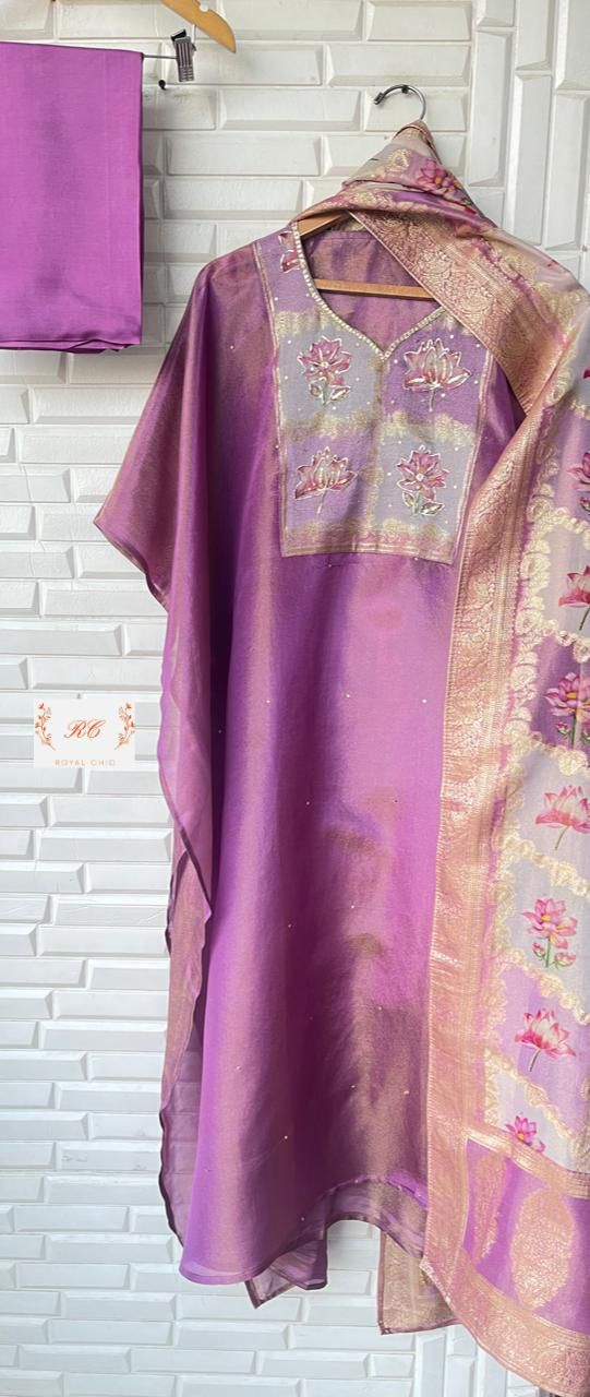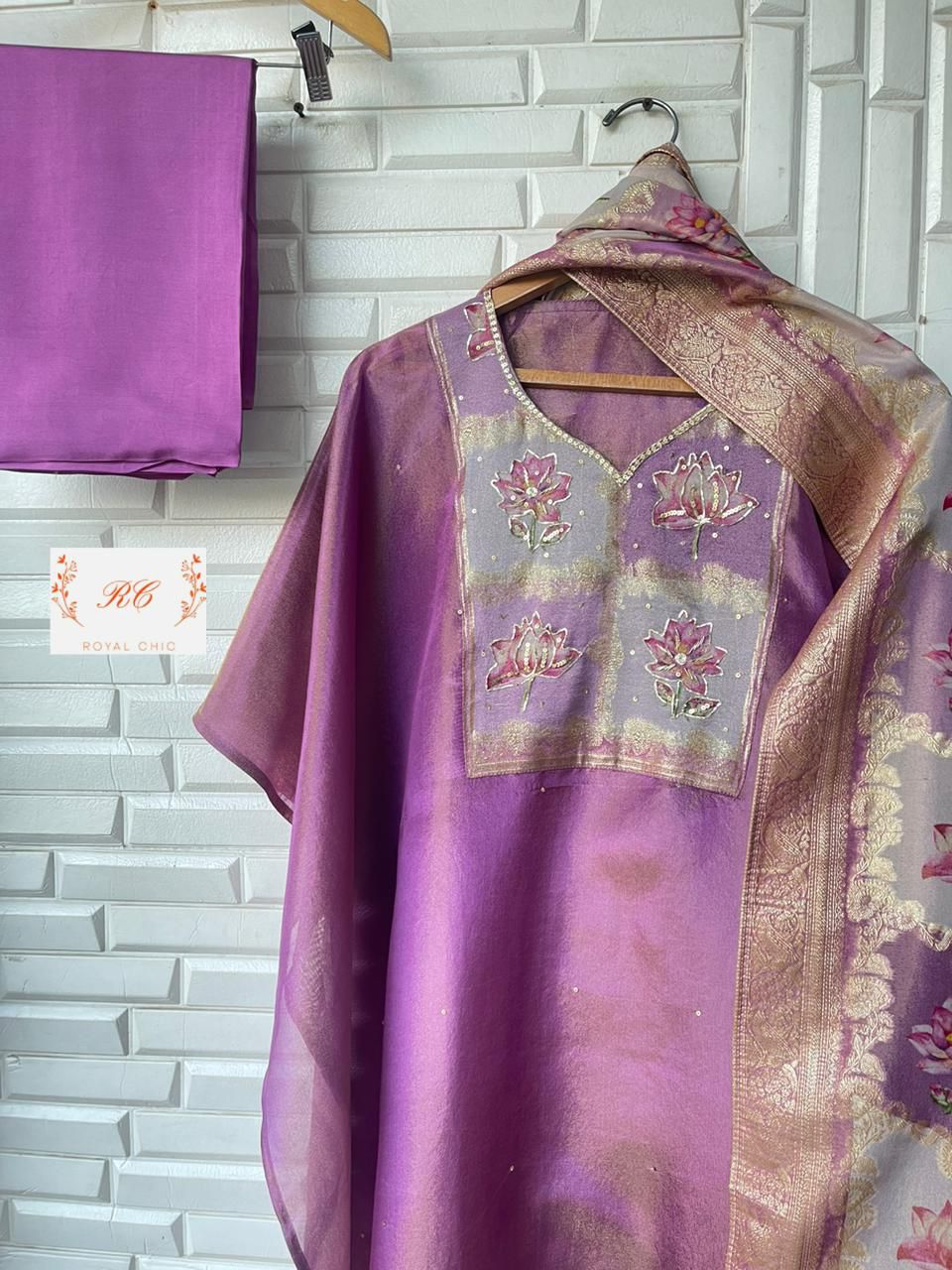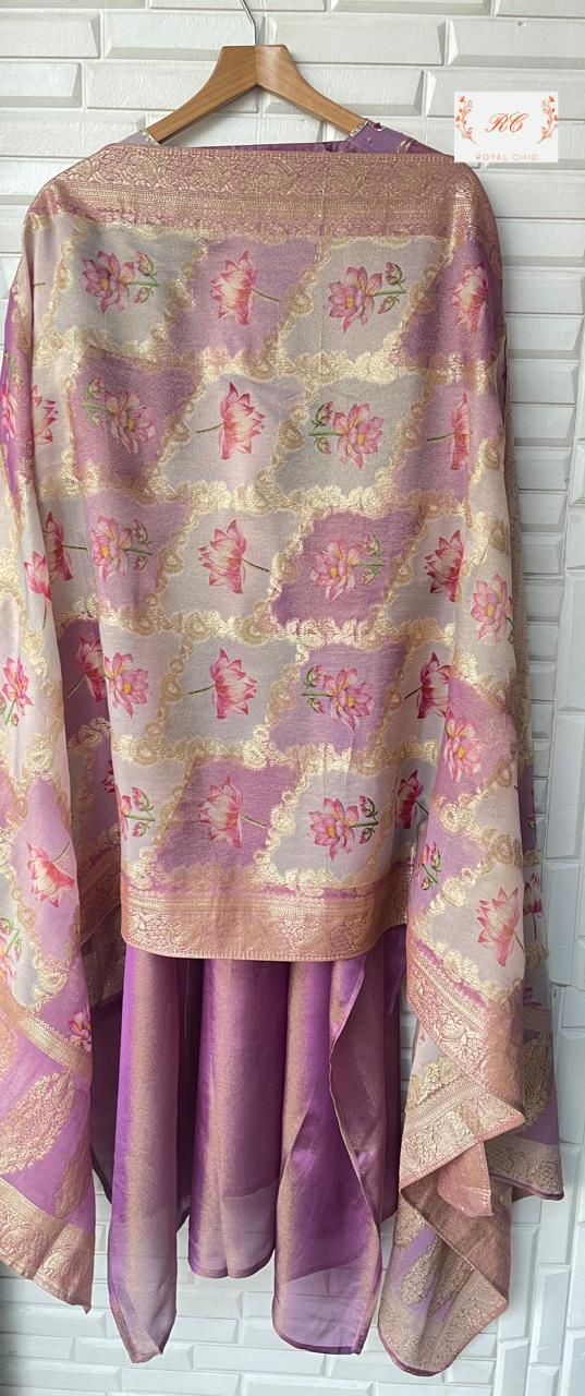 😊 pure shimmer silk printed unstitched shirt with gotta work zari sequence dabka embroidery