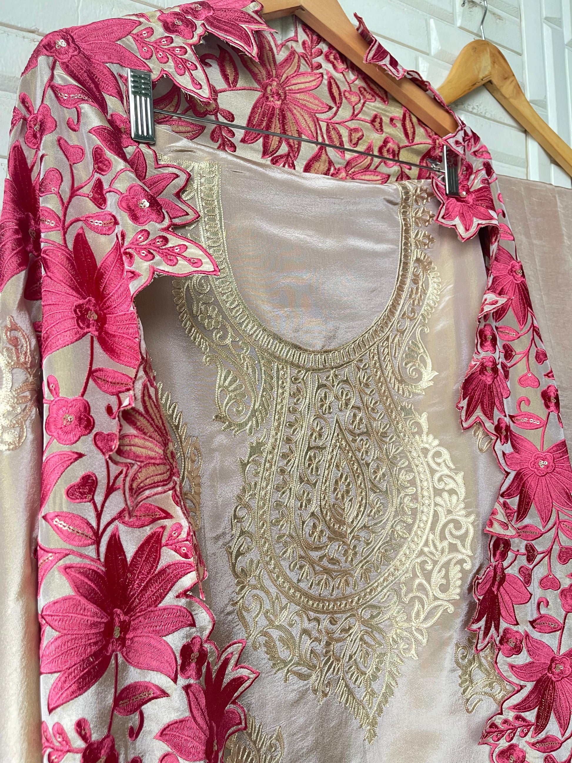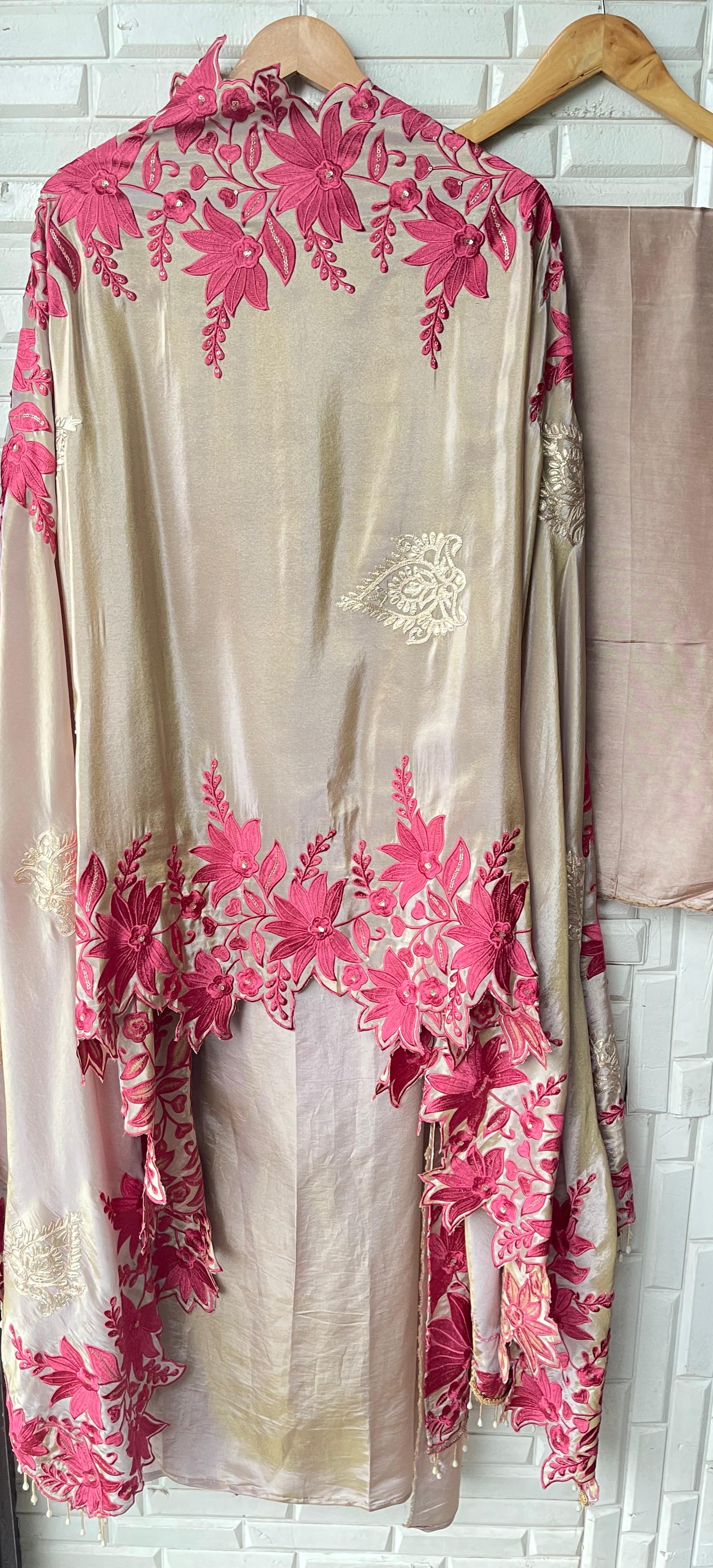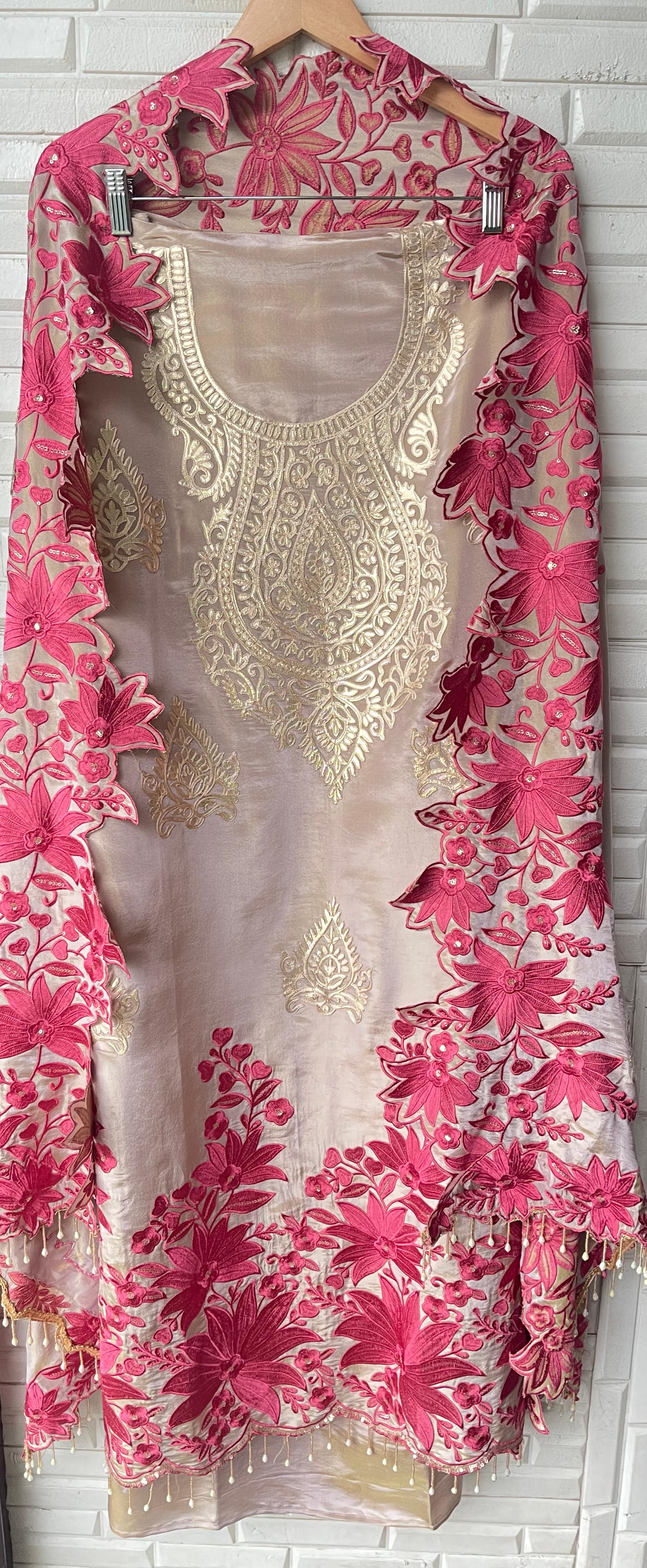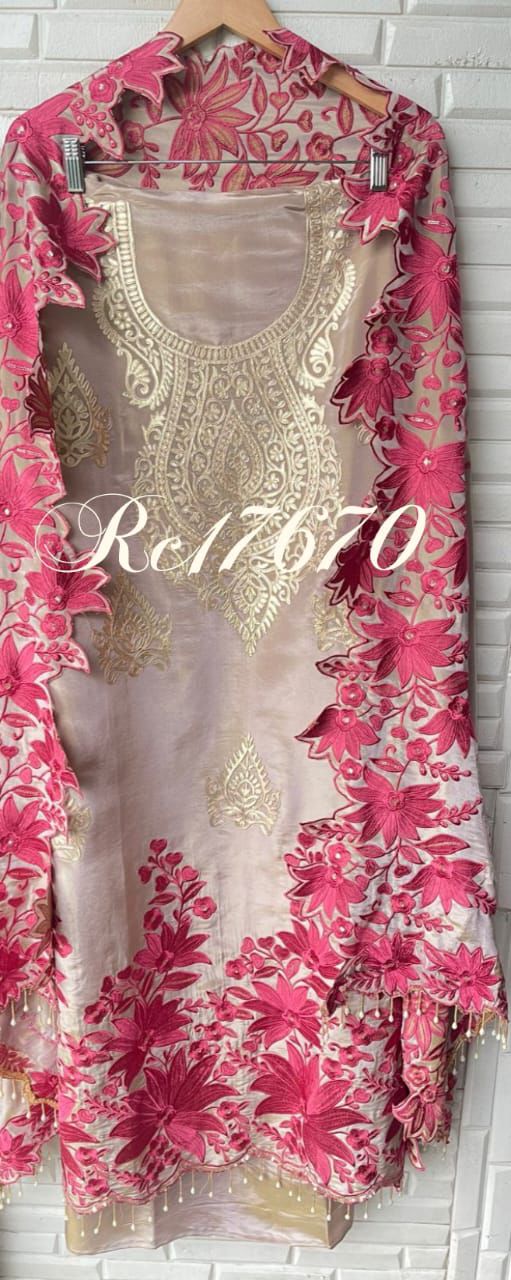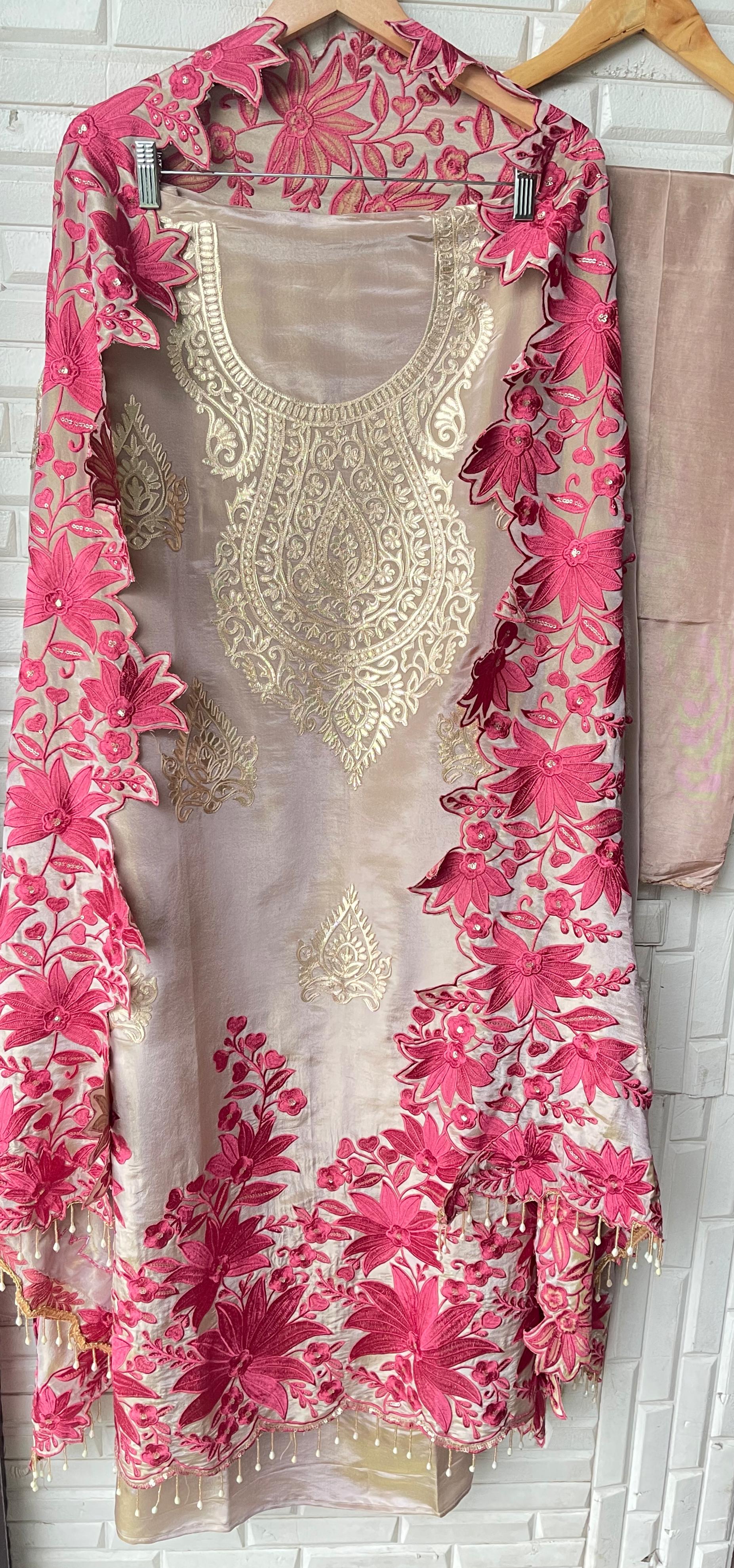๐ pure shimmer silk fabric unstitched shirt with leather work embroidery resham sequence embroidery and scalping and hanging pearl ghera laceย