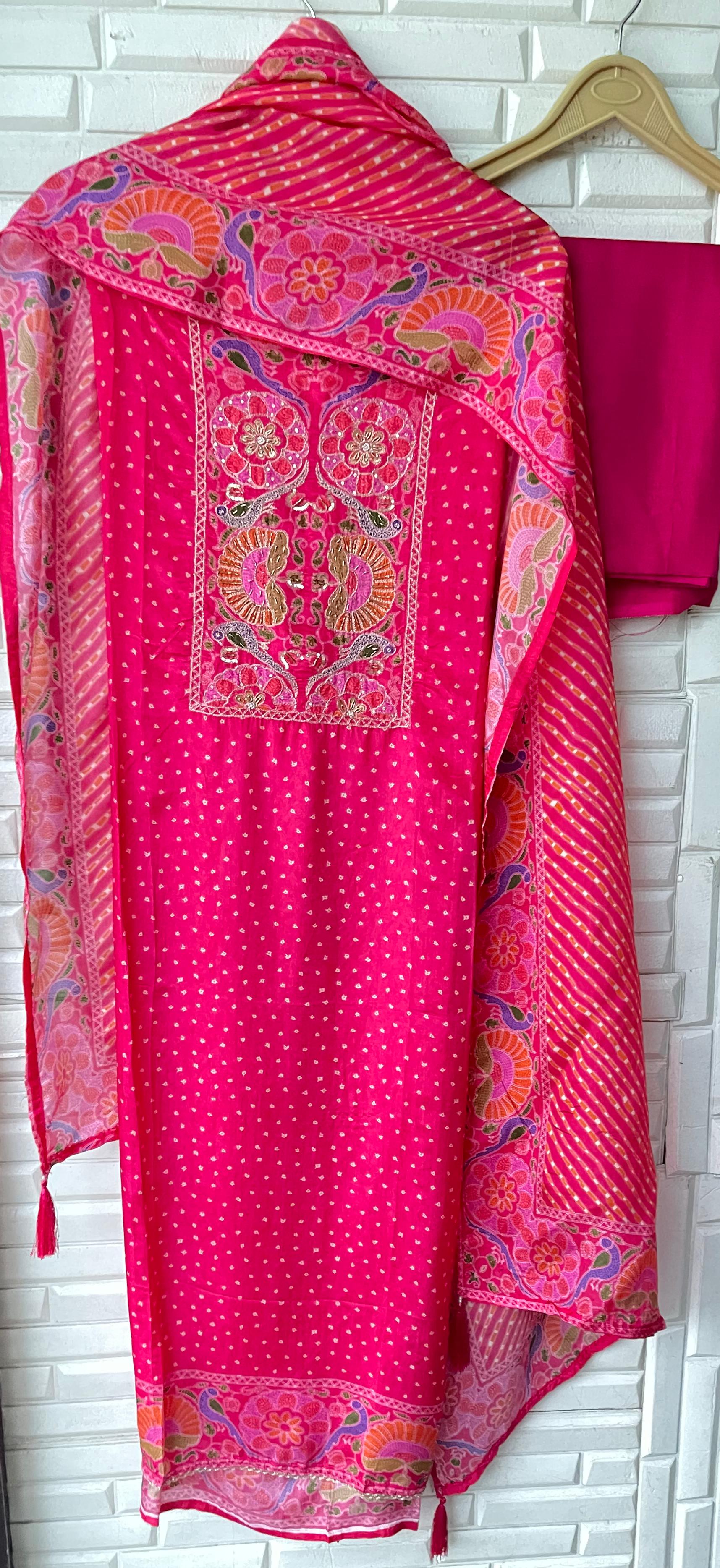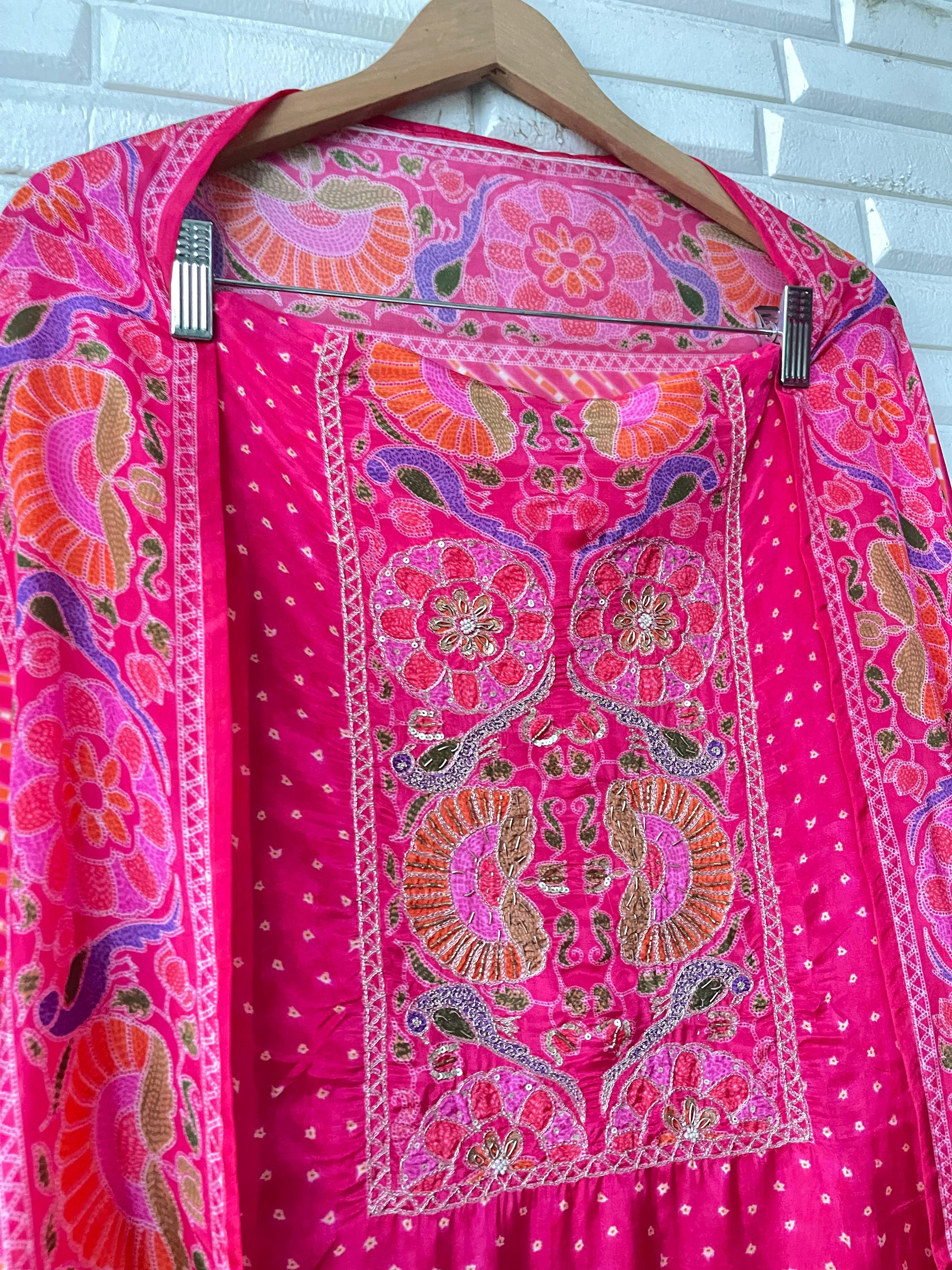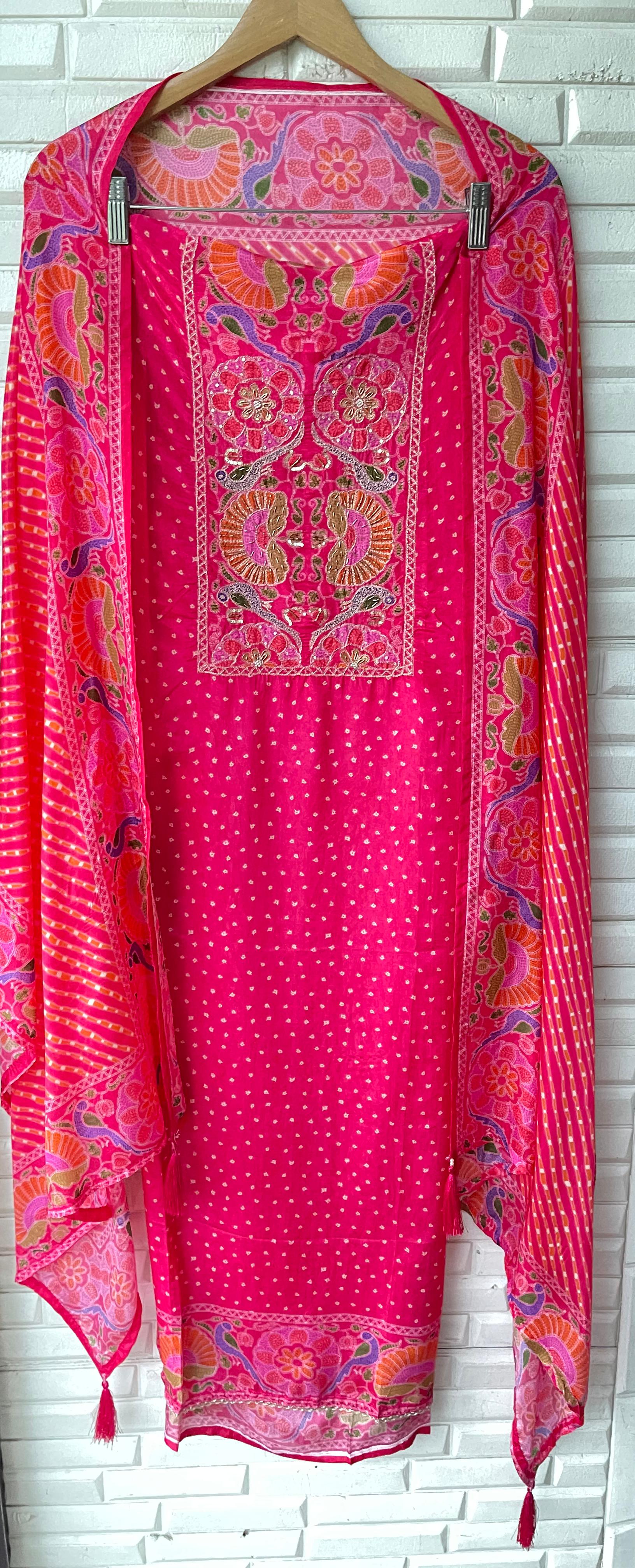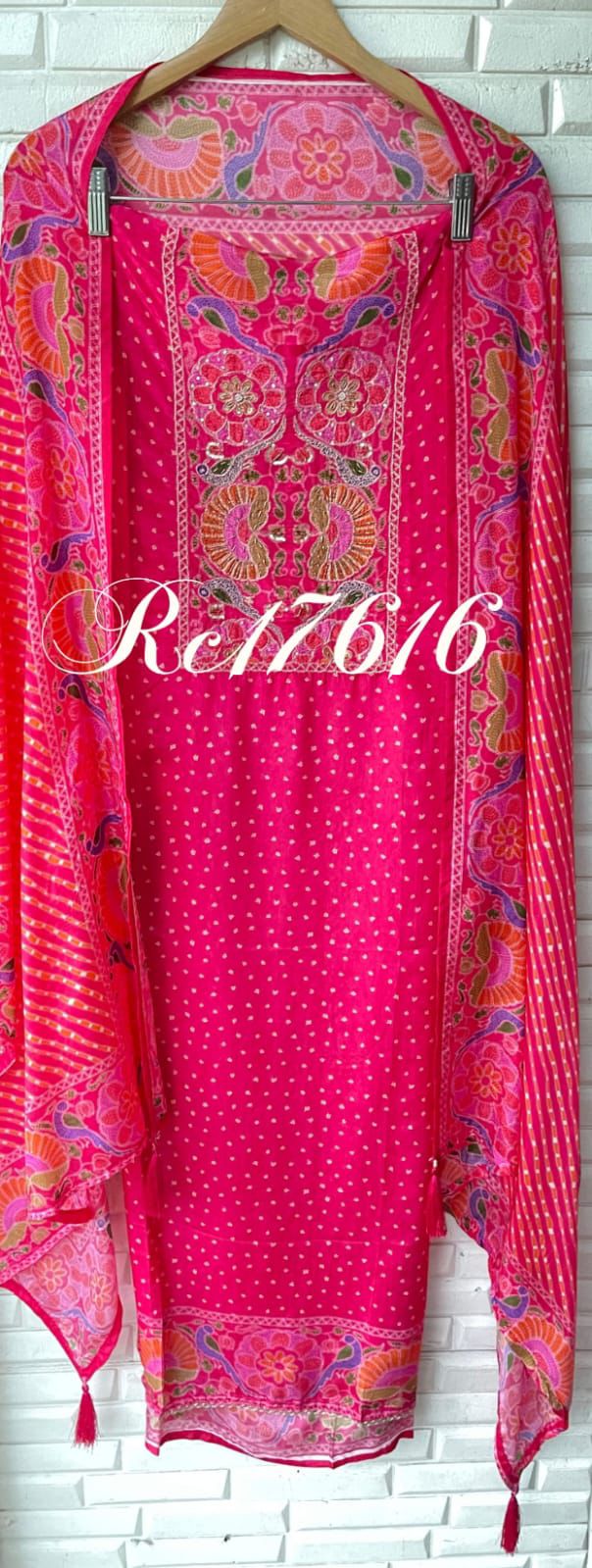 π pure silk printed fabric unstitched shirt with sequence dabka resham embroidery
