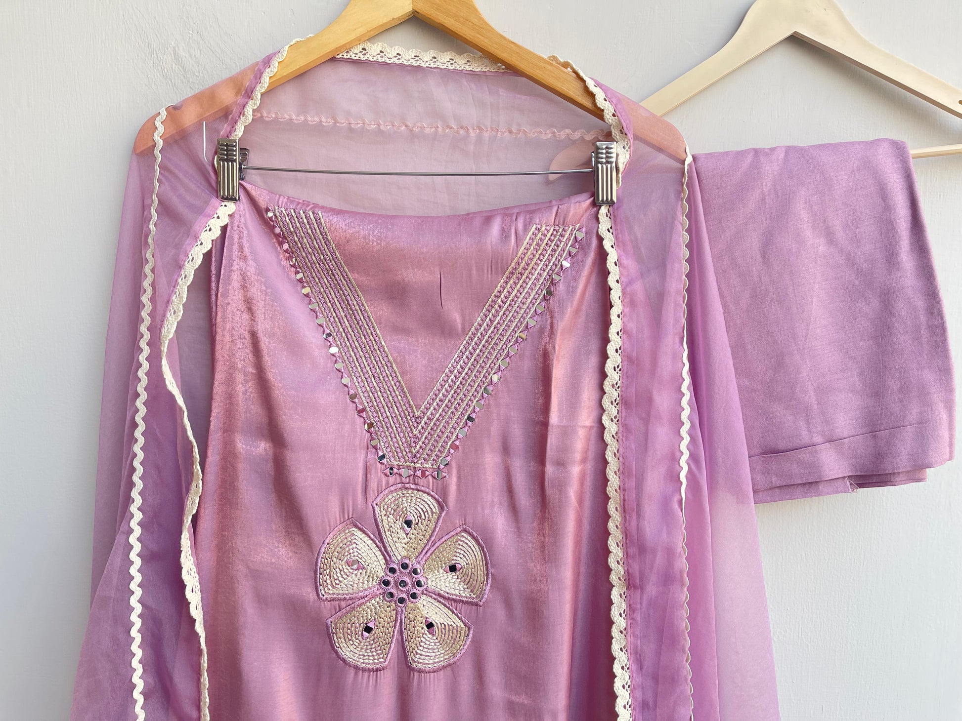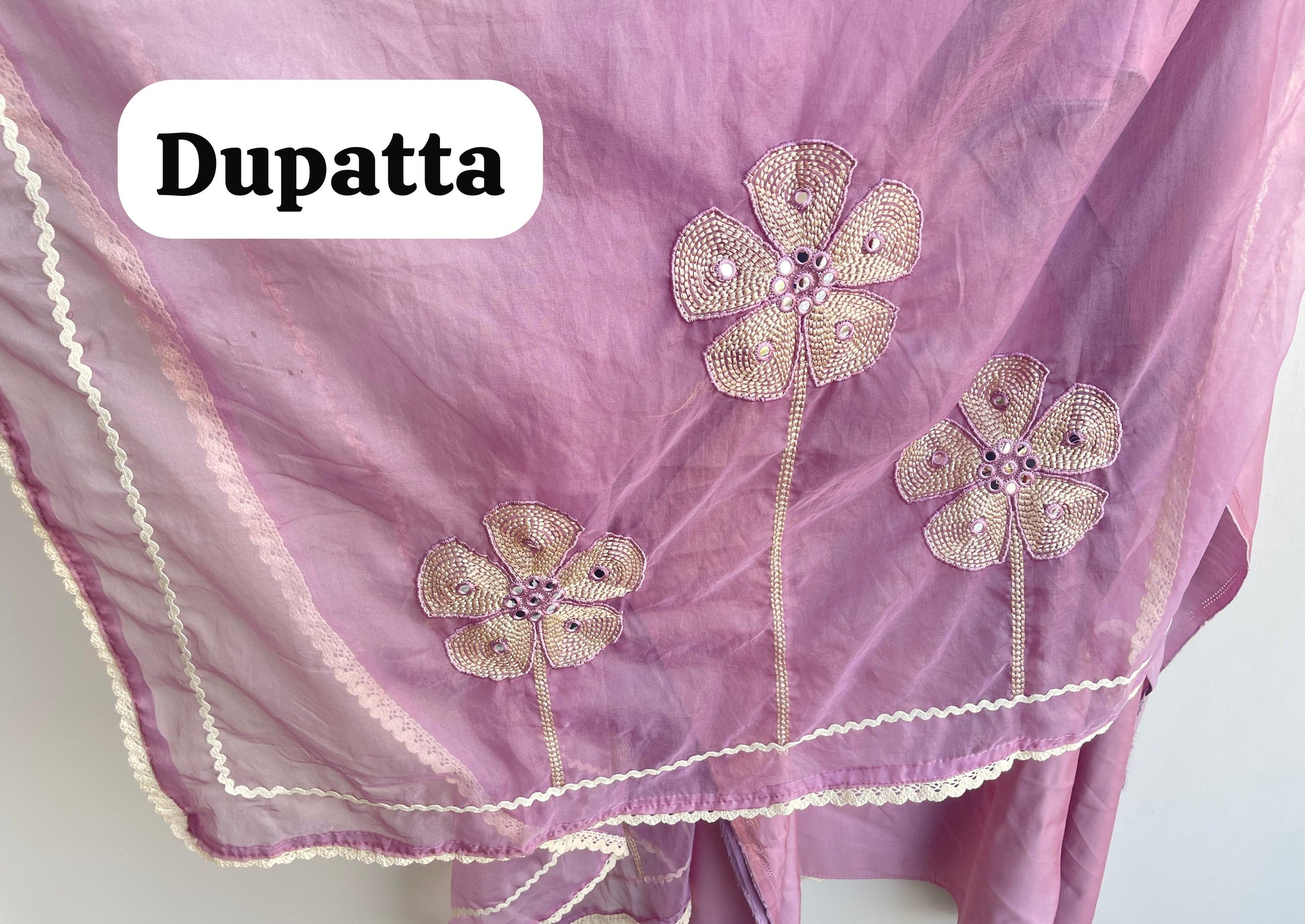 π shimmer organza fabric dupatta with mirror pathri work resham embroidery and crotia border lace