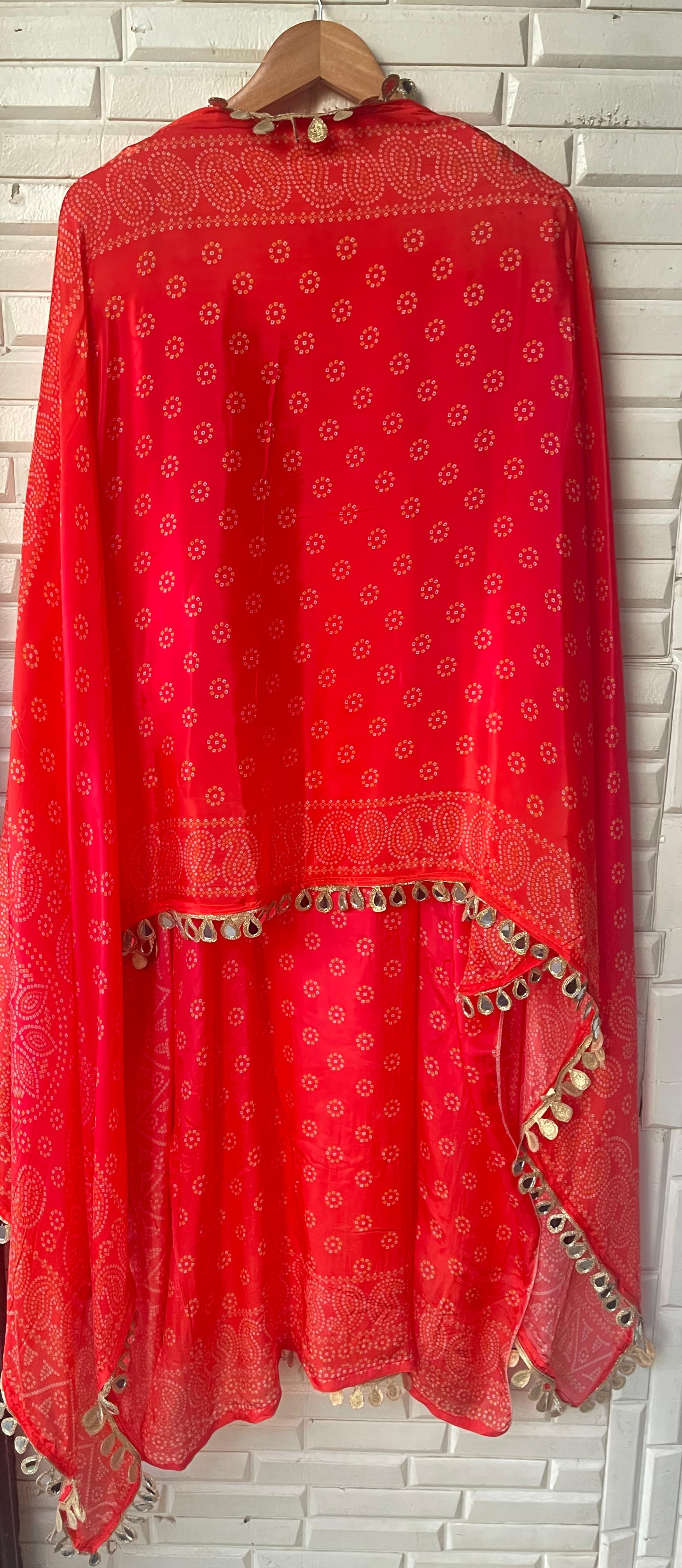 π satin crepe shaded bhandni printed fabric unstitched shirt with actual mirror highlighting on zari patchwork lace on ghera and neck
