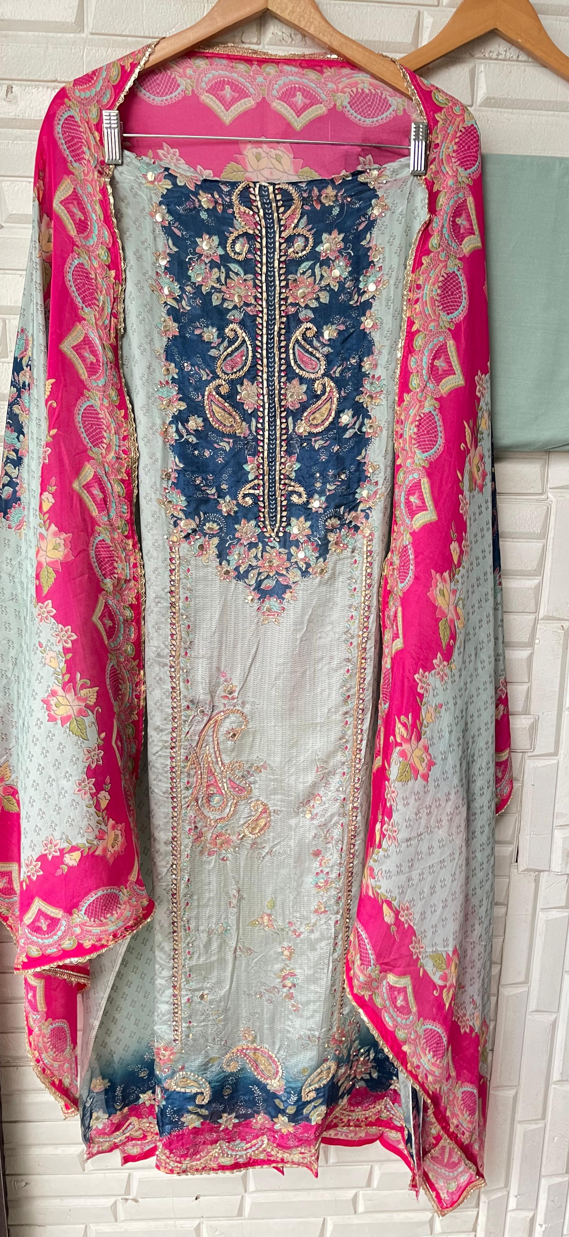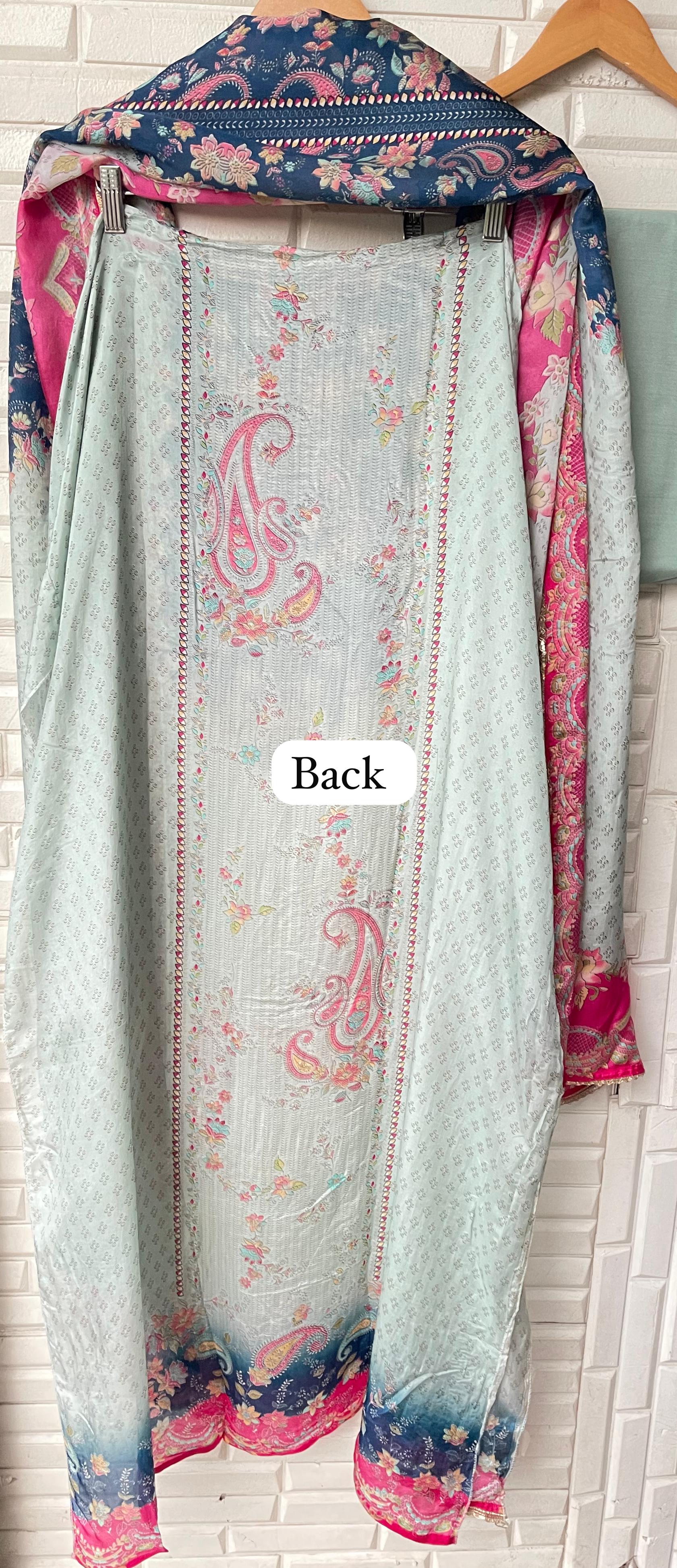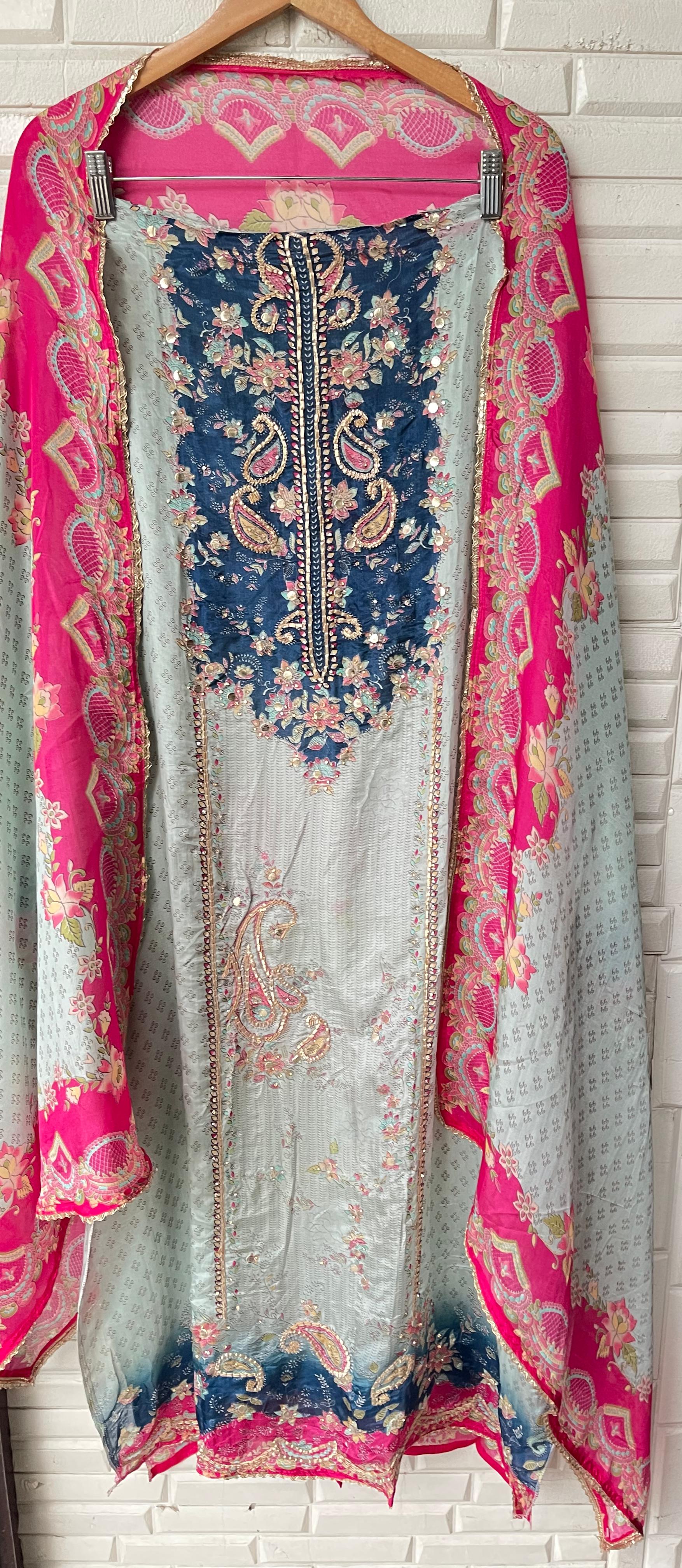 😊 Satan crape printed fabric unstitched shirt with leather mirror gotta lace work and swarowski highlighting