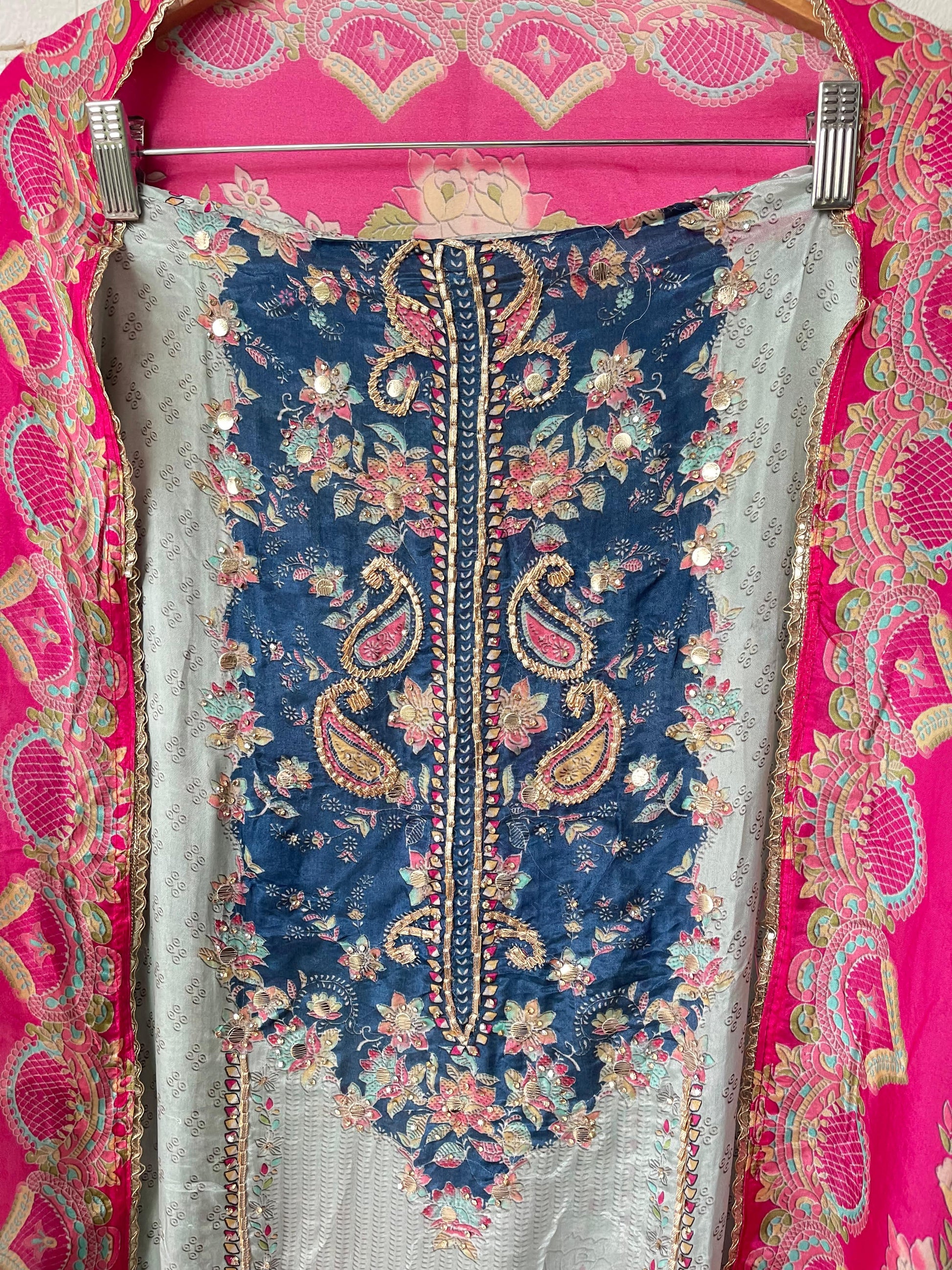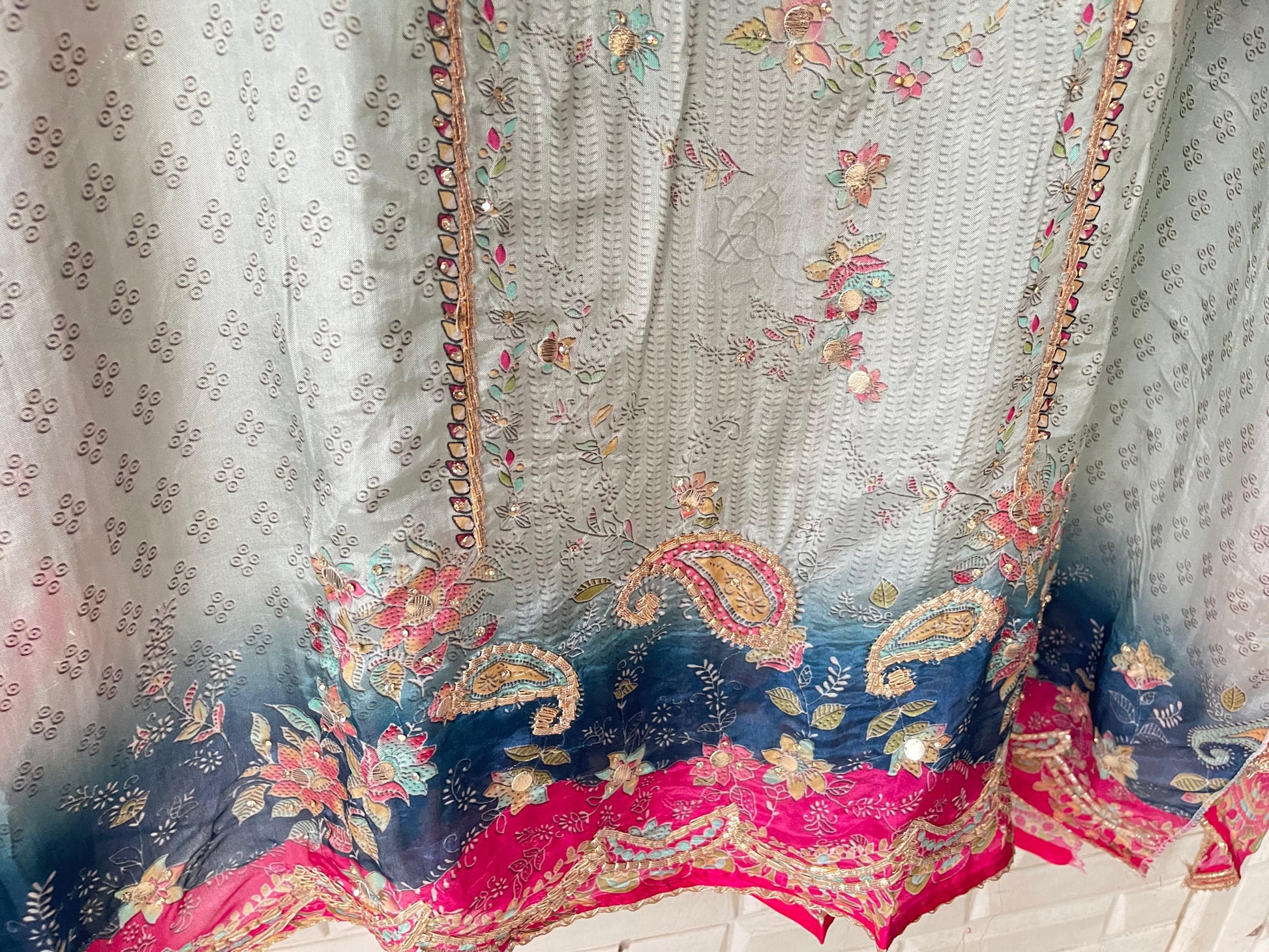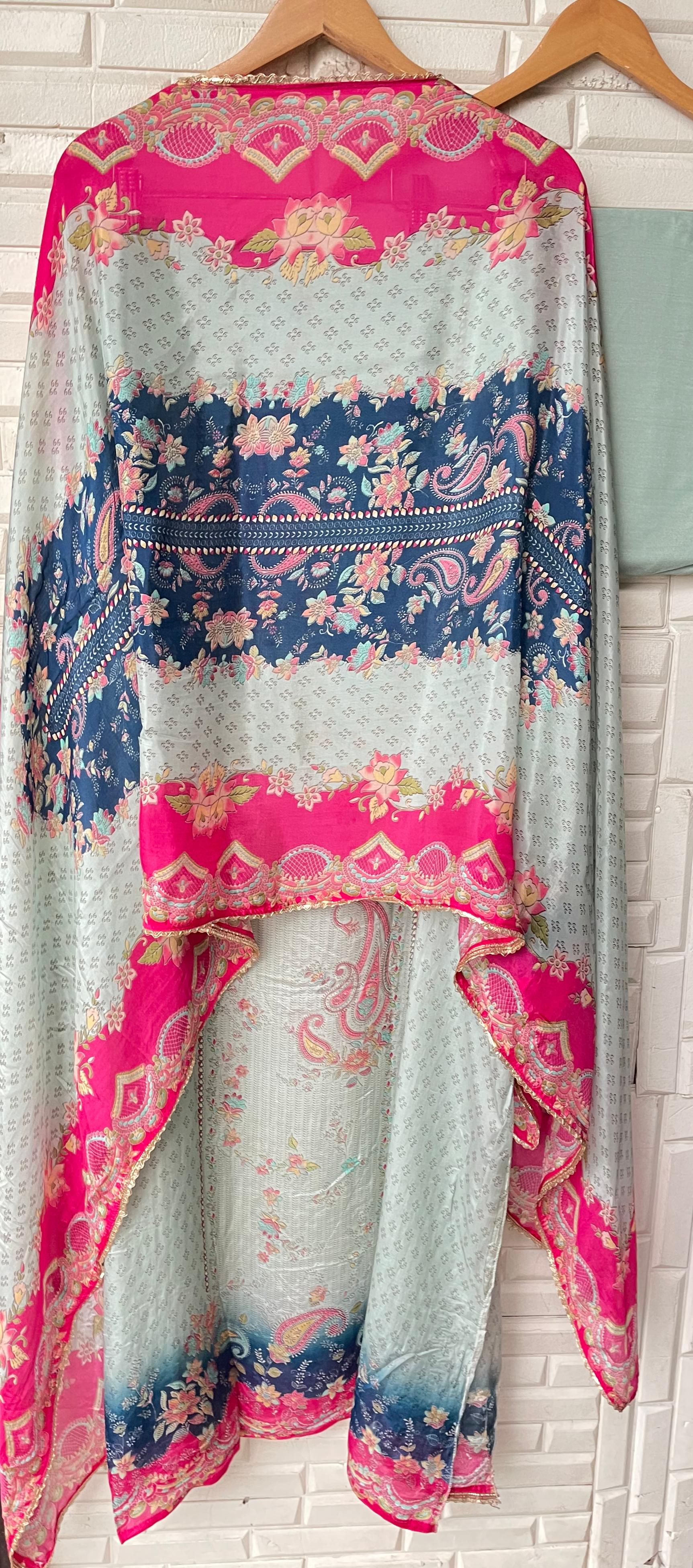 😊 Satan crape printed fabric unstitched shirt with leather mirror gotta lace work and swarowski highlighting