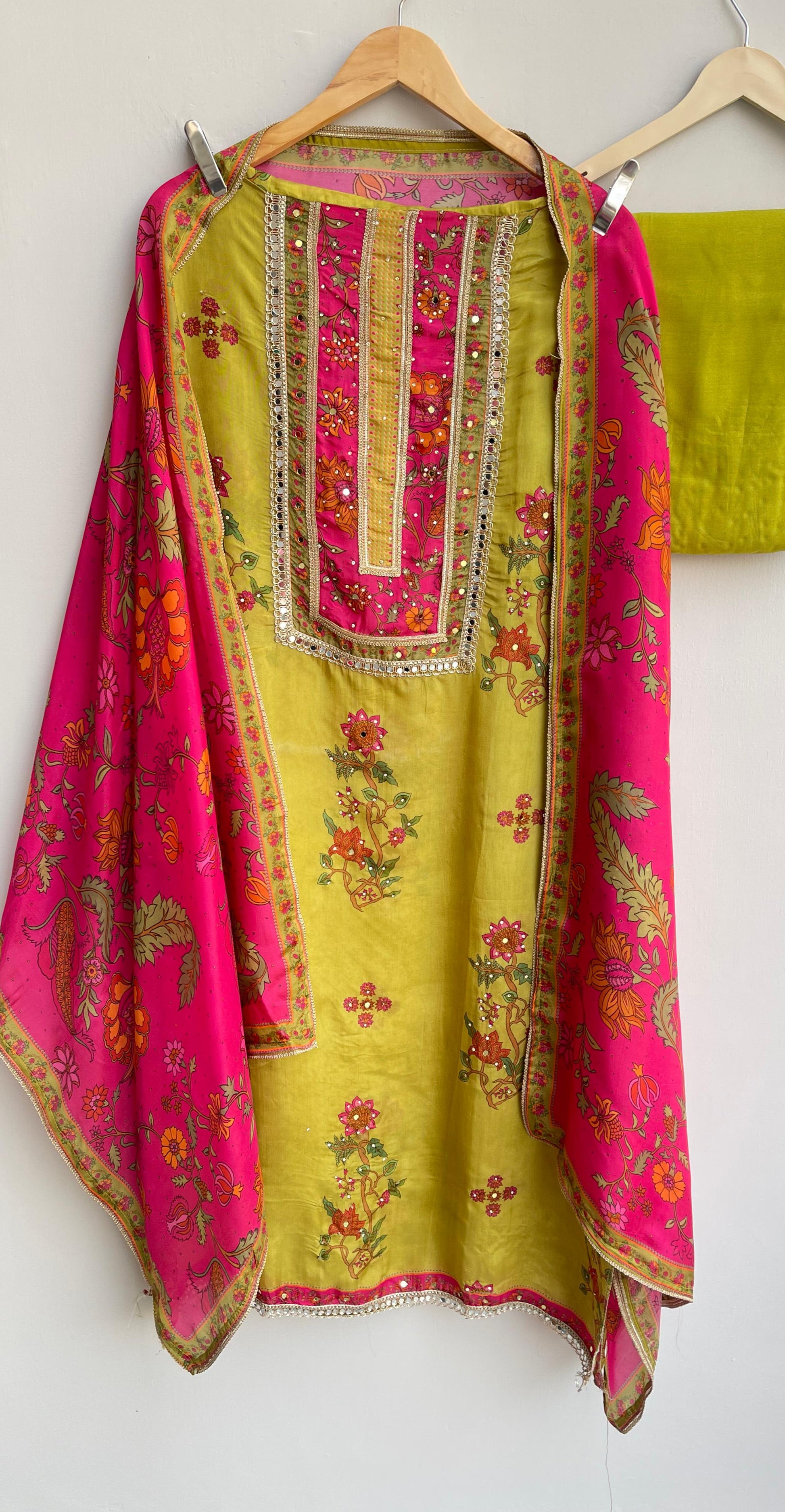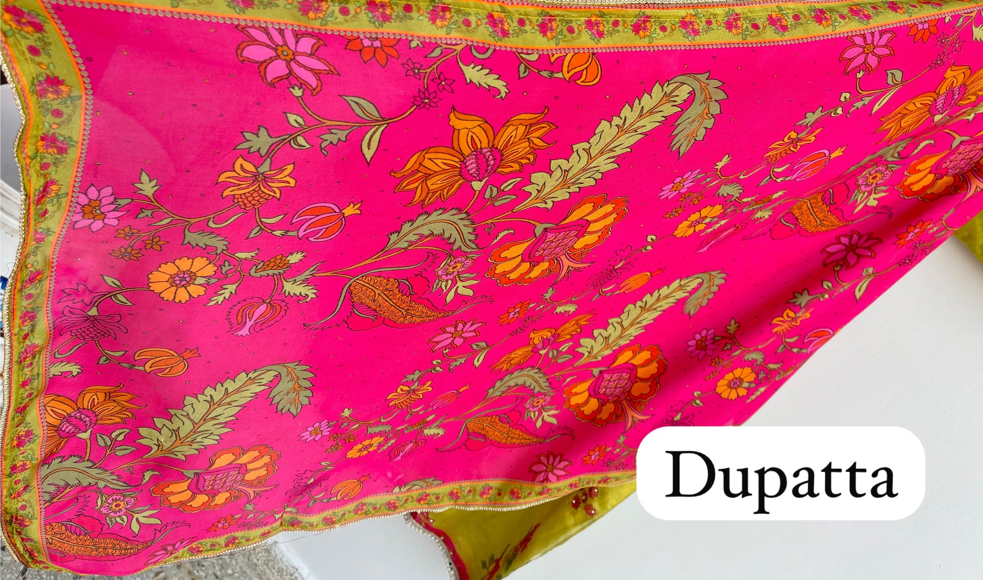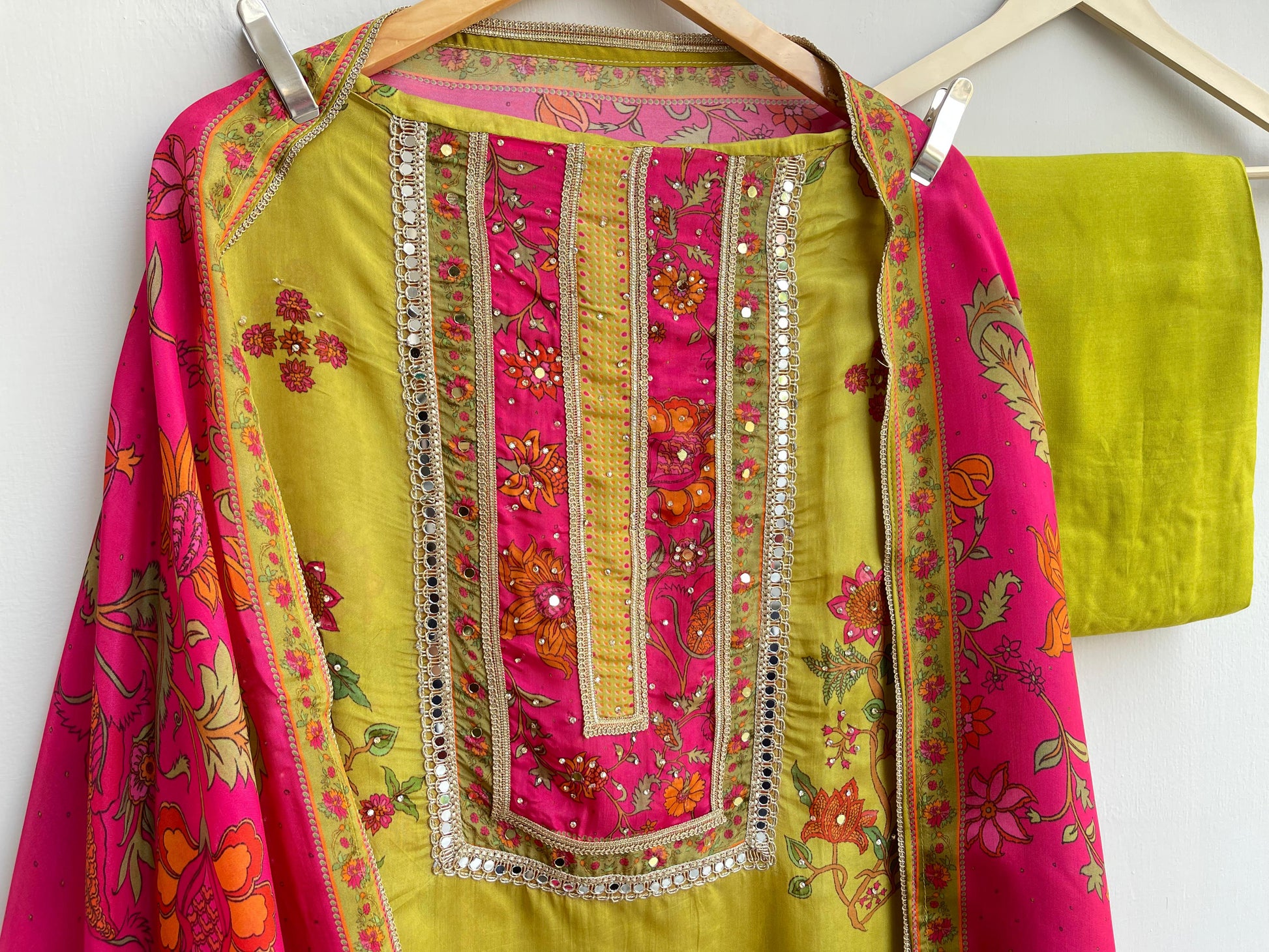 😊 satin crape printed fabric unstitched shirt with mirror highlighting on zari lace insertions and mirror work swarowski highlighting