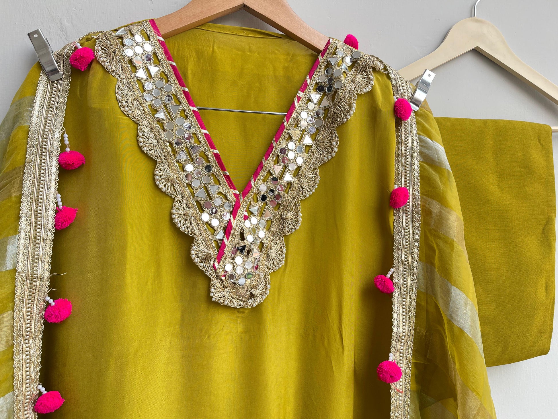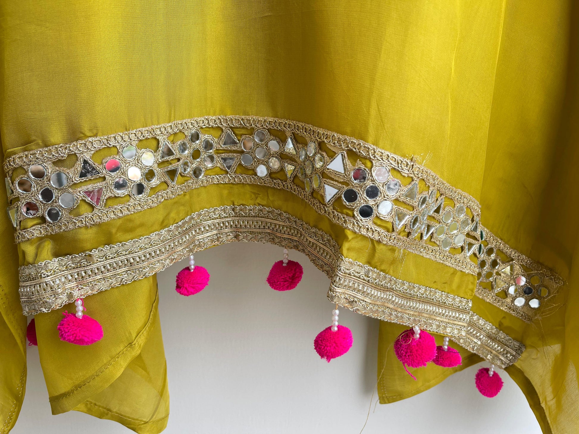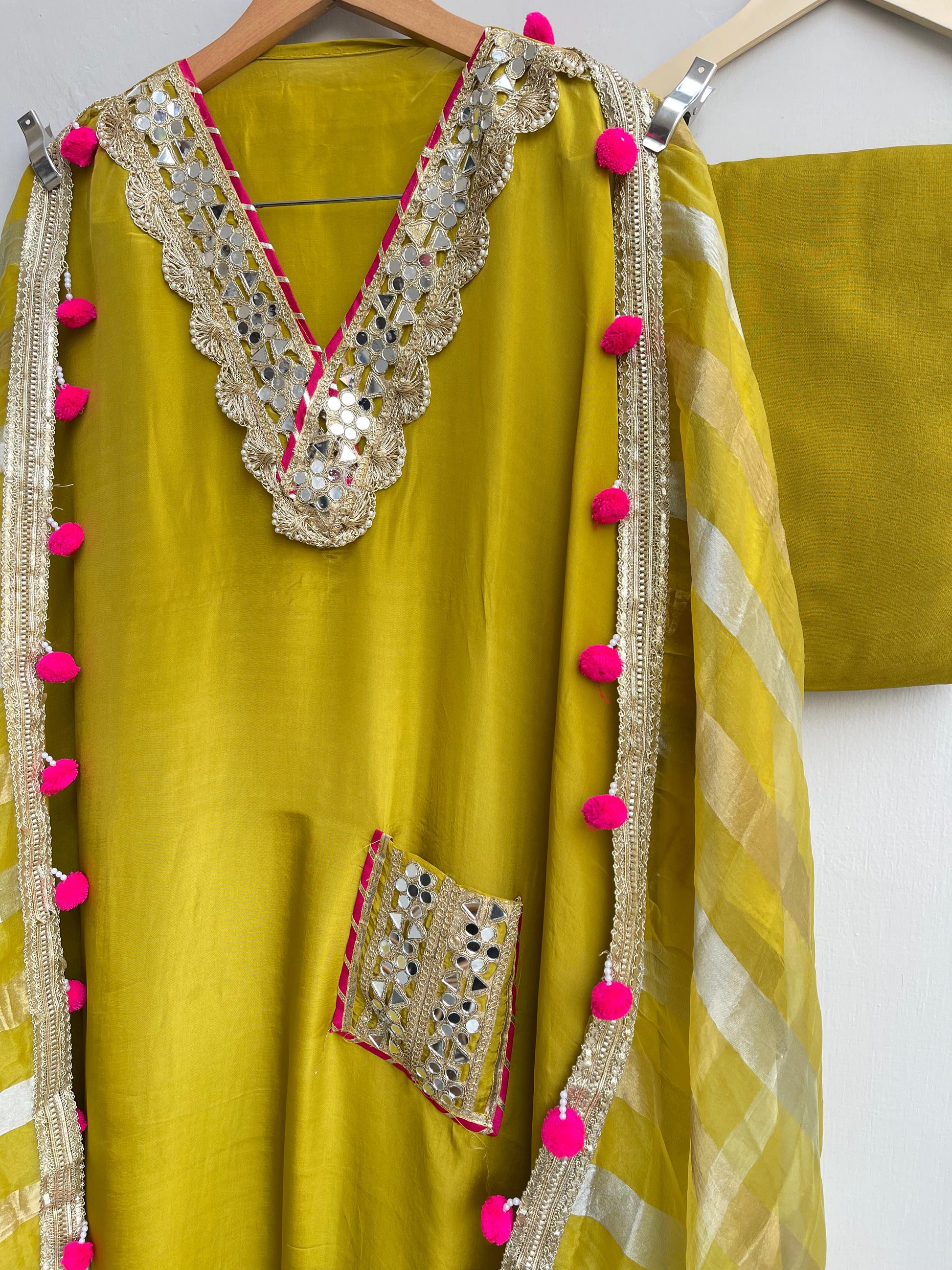 π satin crape fabric unstitched shirt with zari lace on neck ghera pocket with actual mirror all over highlighting and pom pom ghera lace