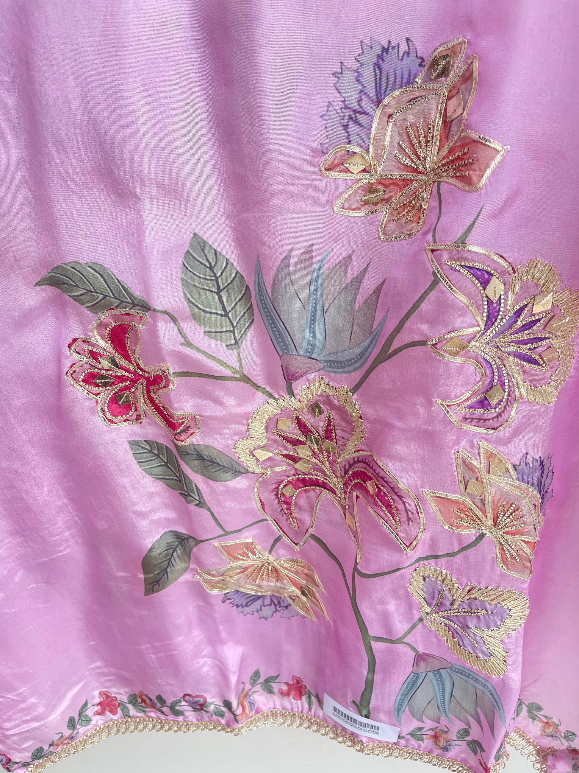 π satin crepe printed fabric unstitched shirt with pita gotta and leather work and ghera lace