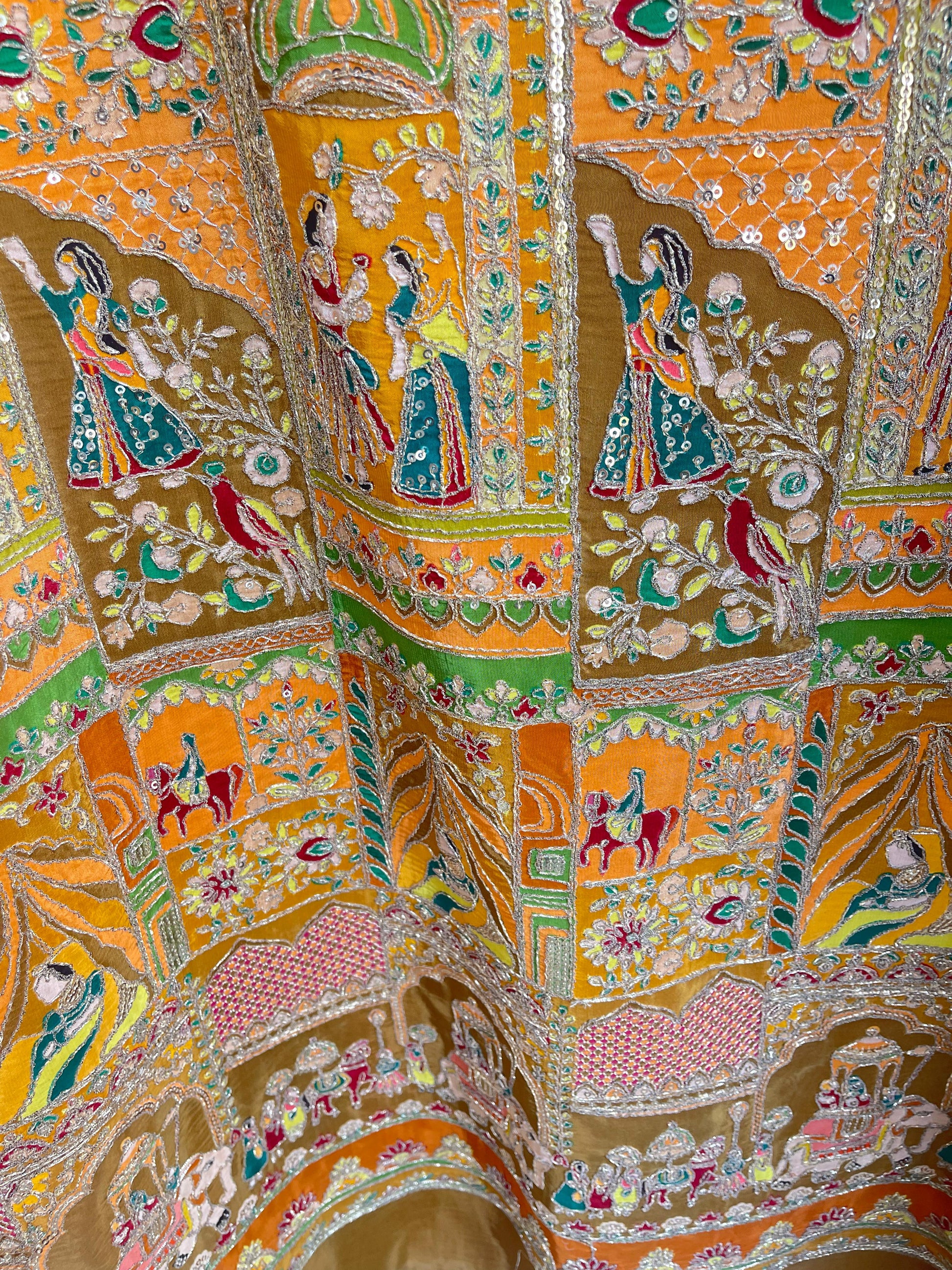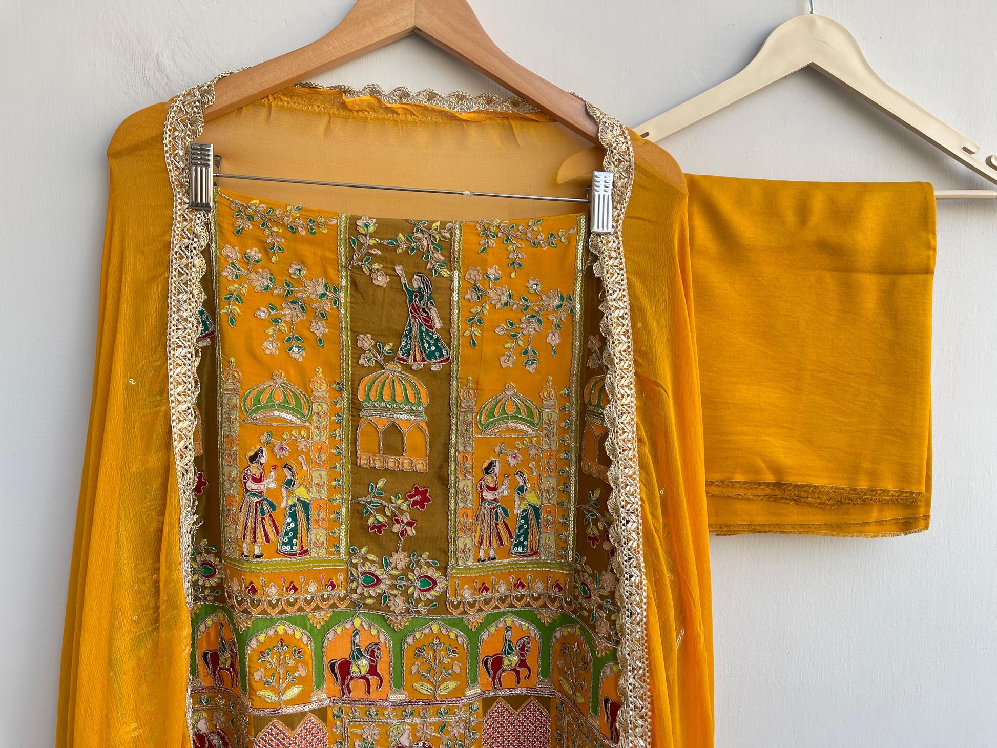 π satin crepe fabric unstitched shirt with resham zari sequence embroidery and kingri ghera lace