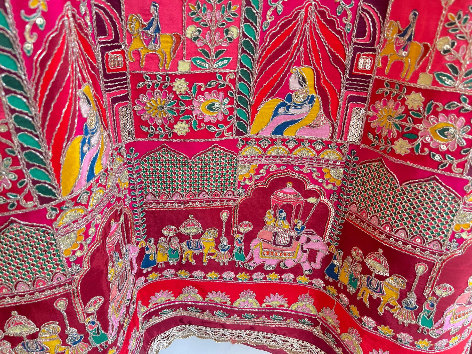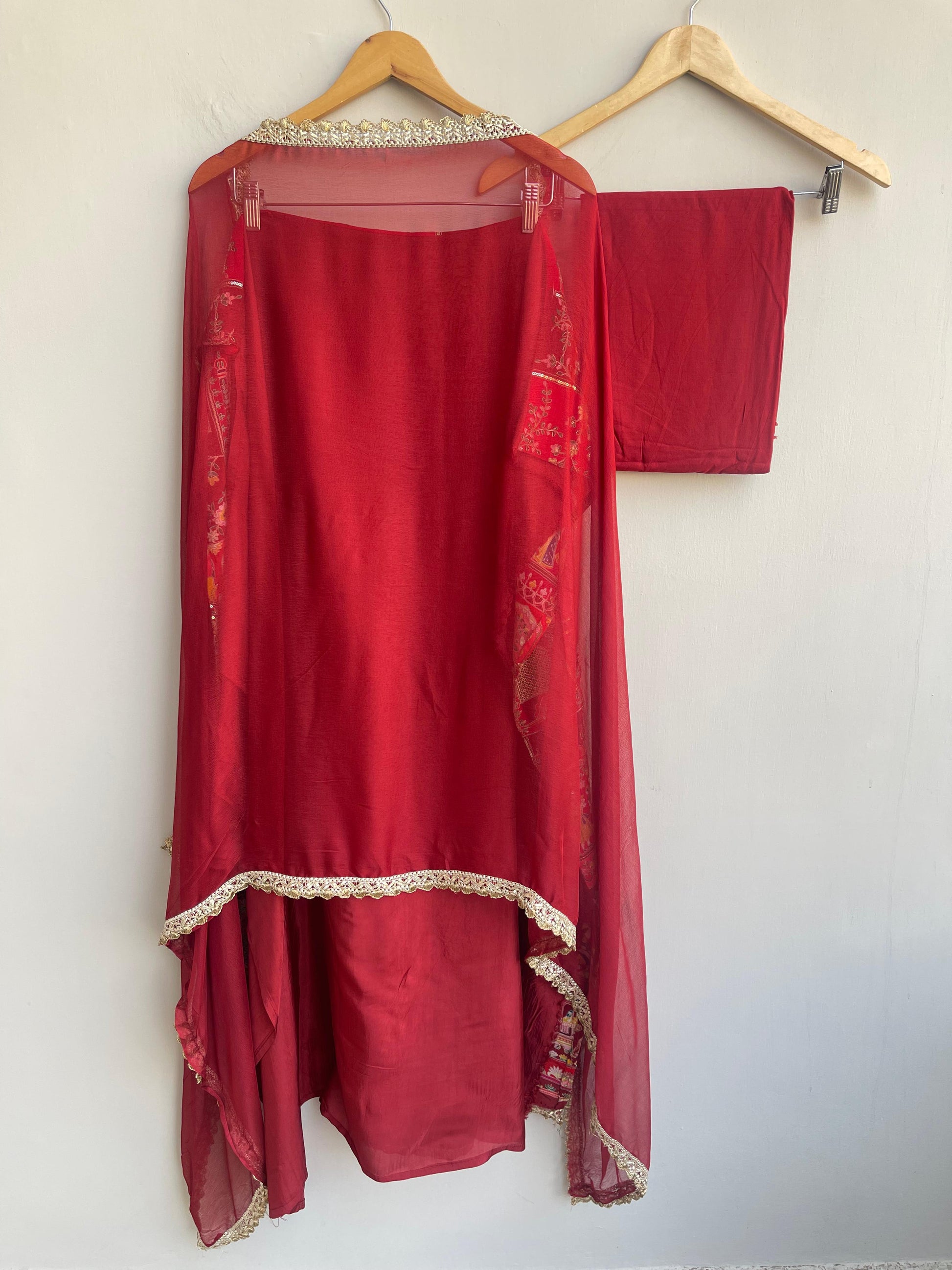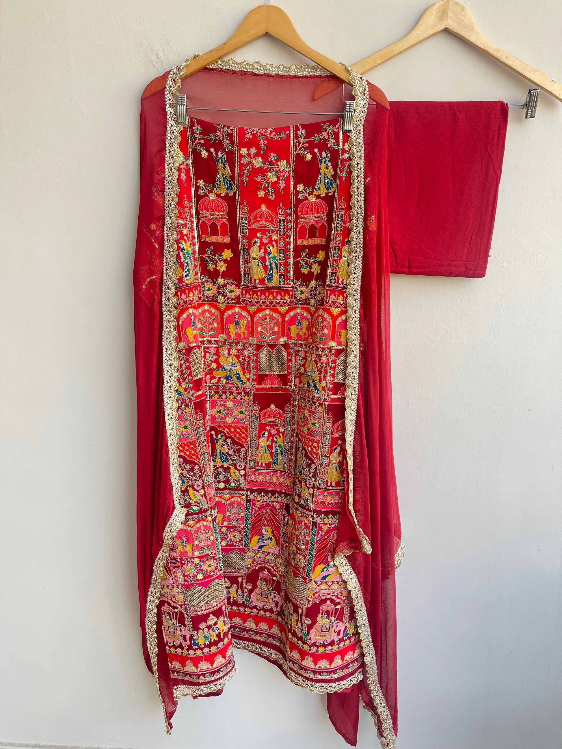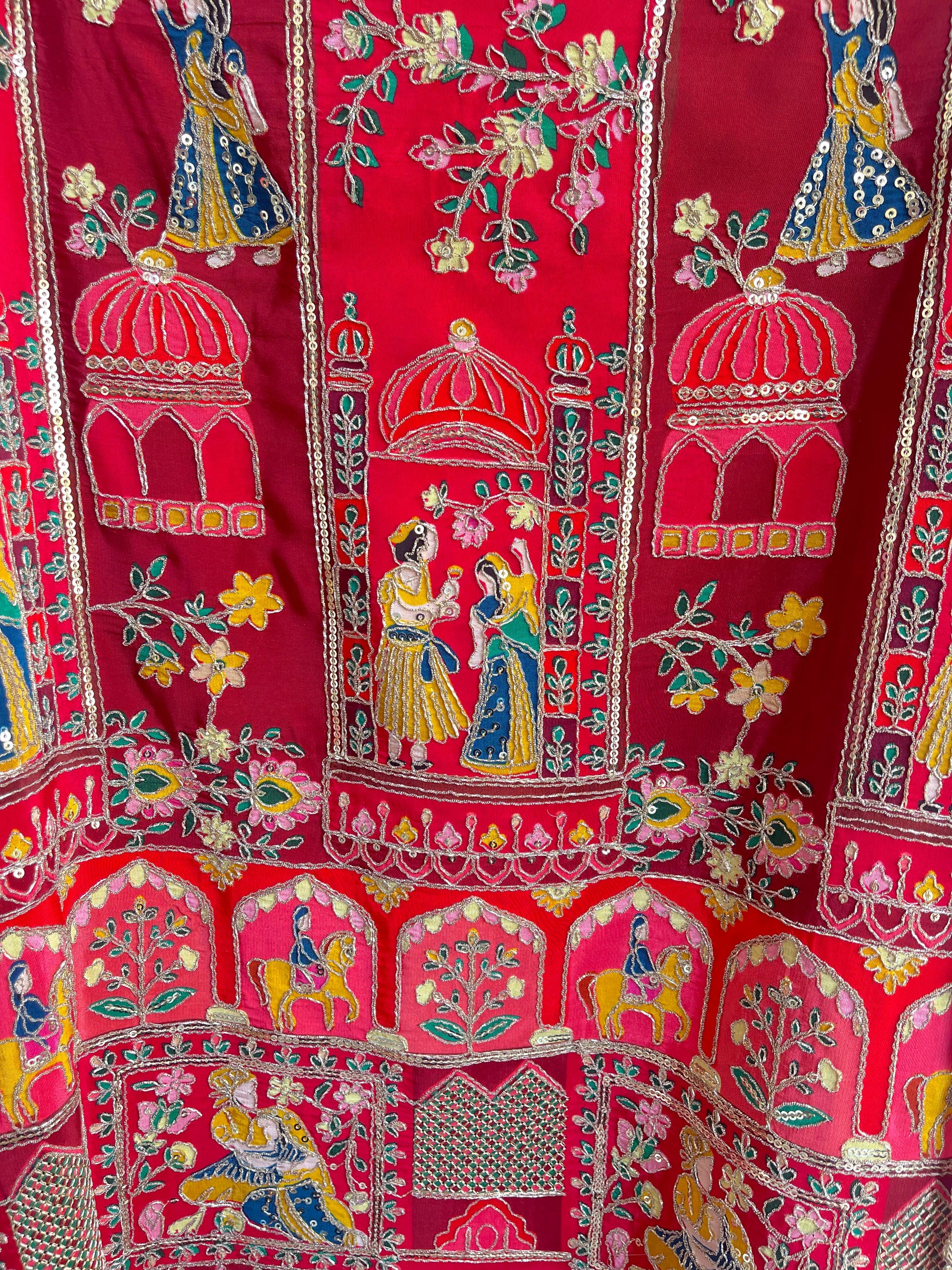 π satin crepe fabric unstitched shirt with resham zari sequence embroidery and kingri ghera lace