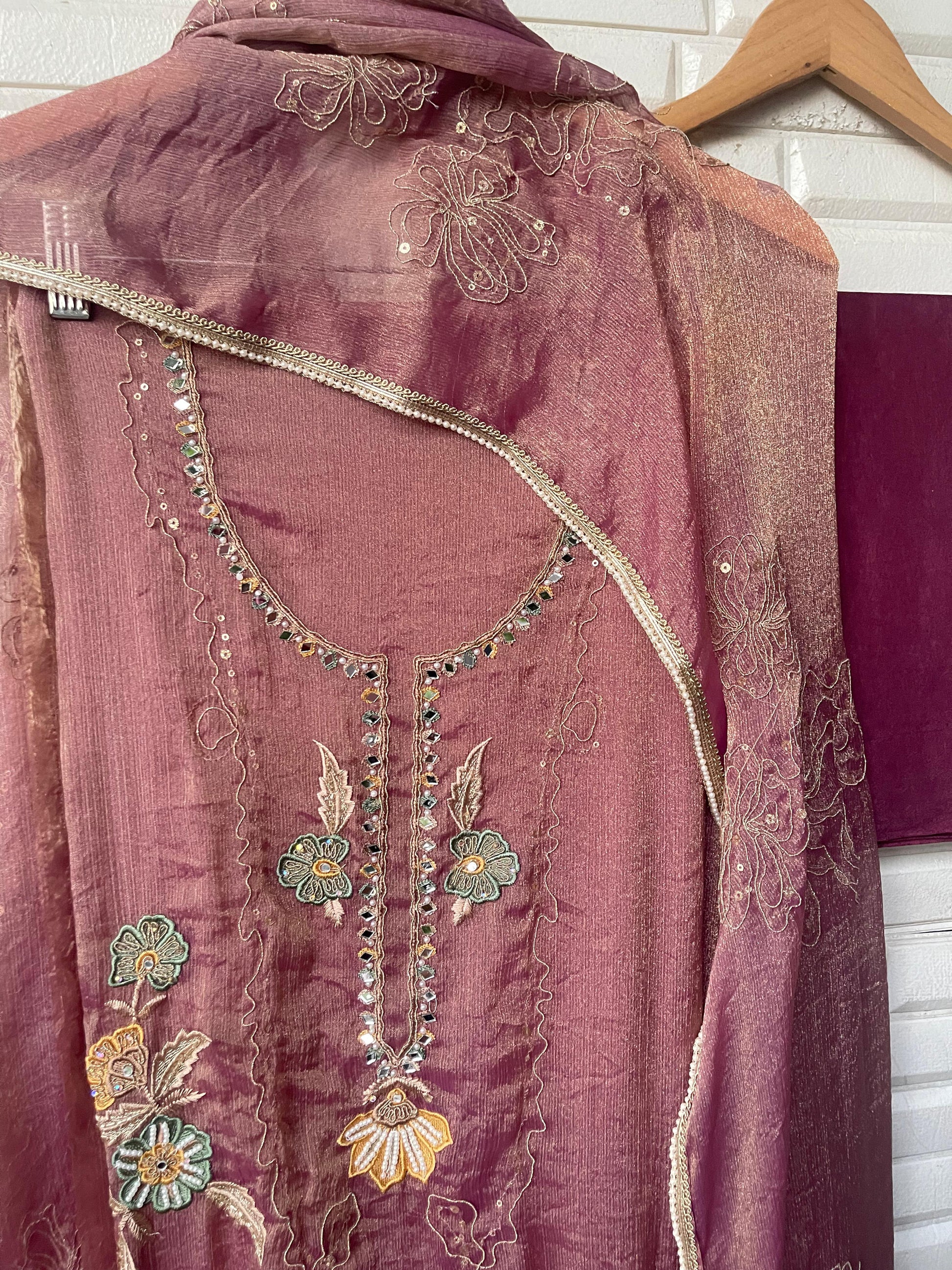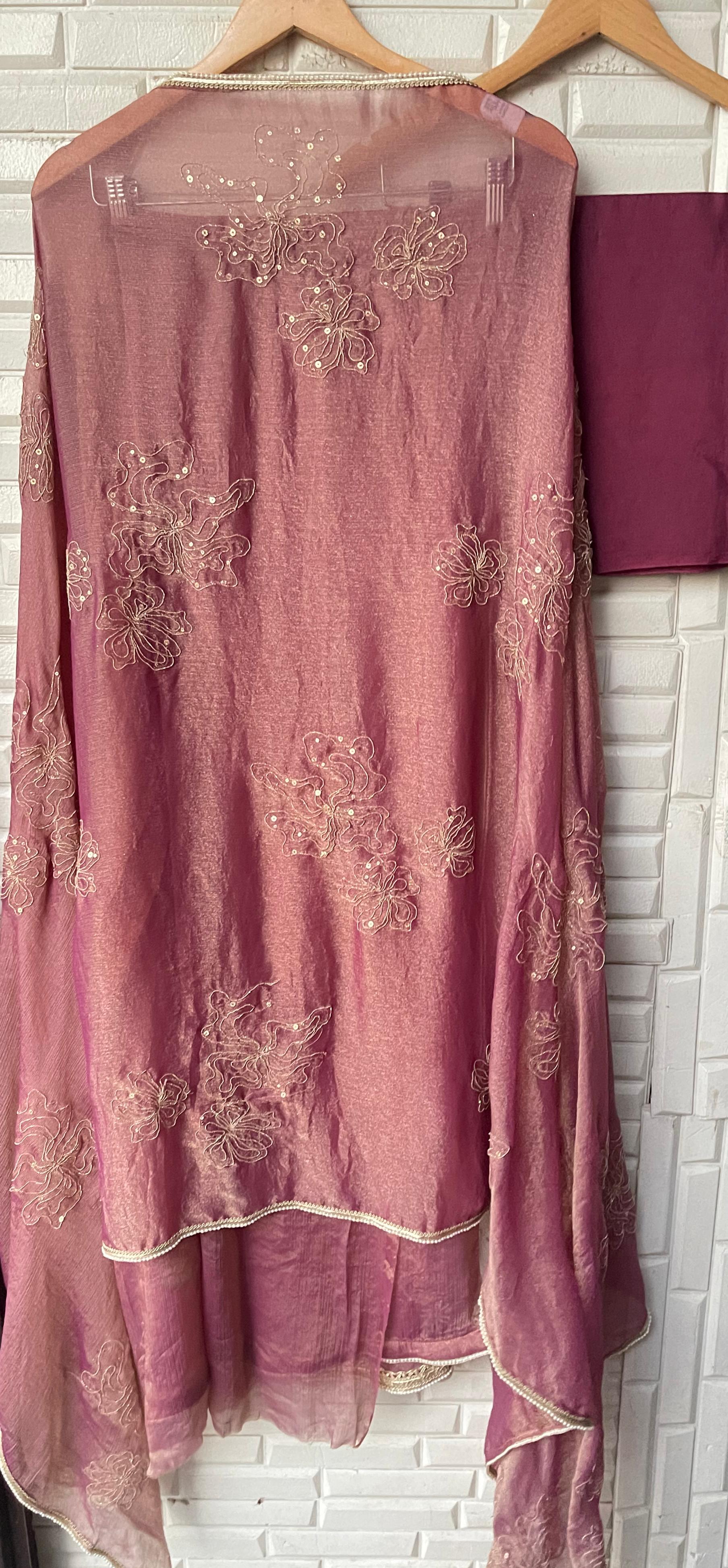 π self crushed shimmer Chinon fabric unstitched shirt with mirror work resham sequence zari swarowski embroidery with ghera border lace
