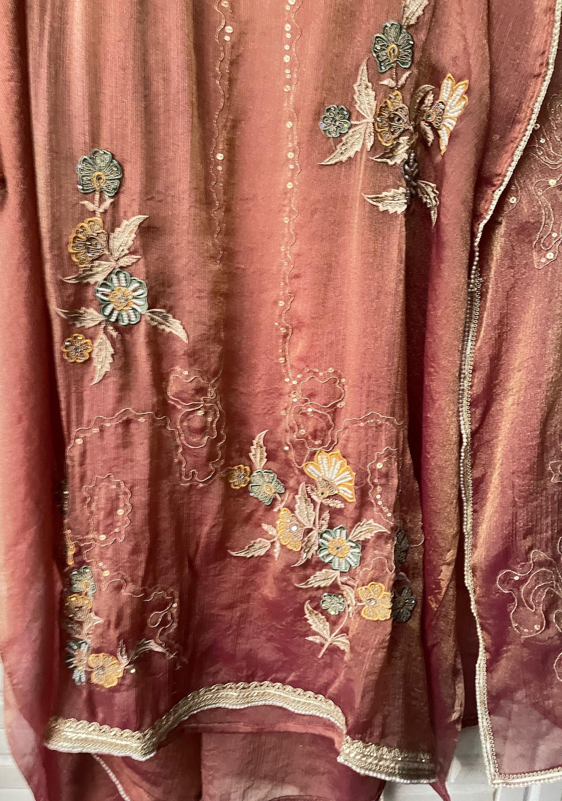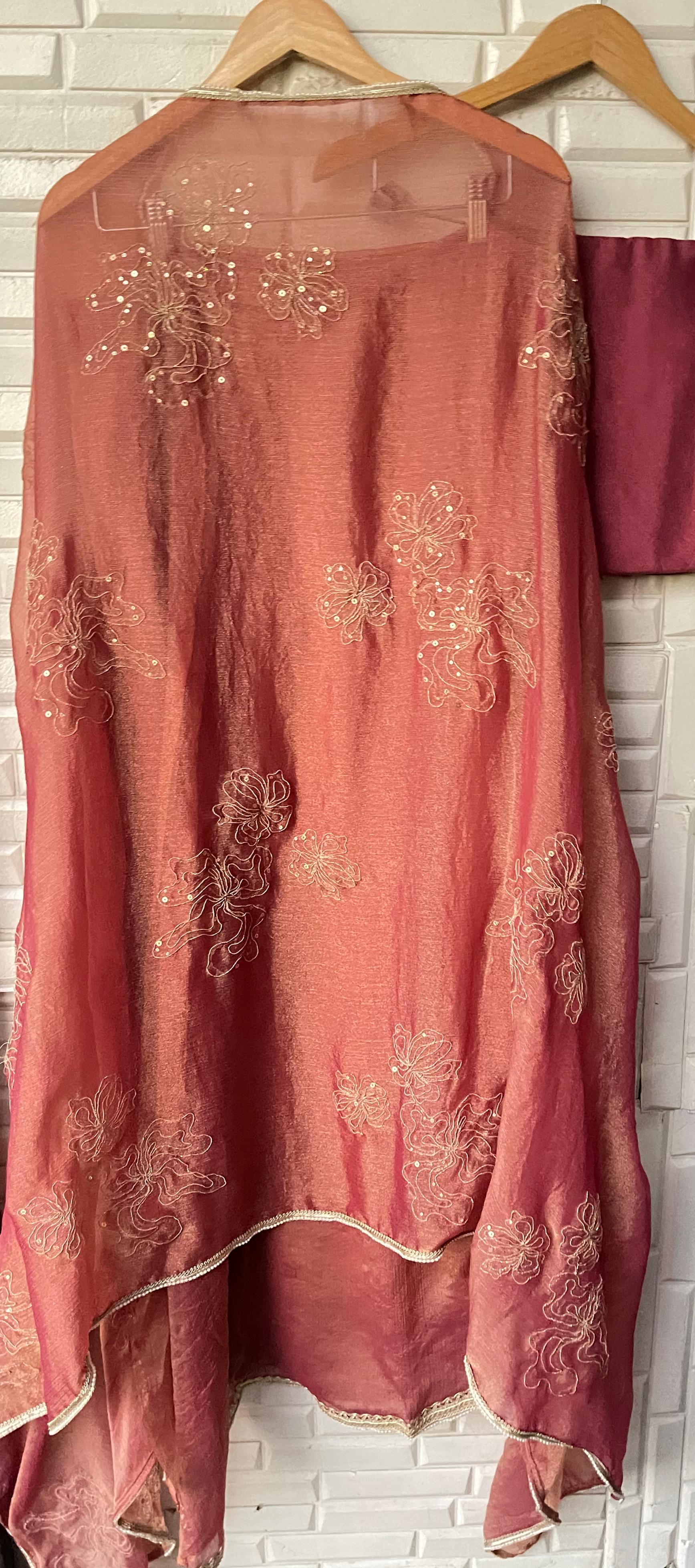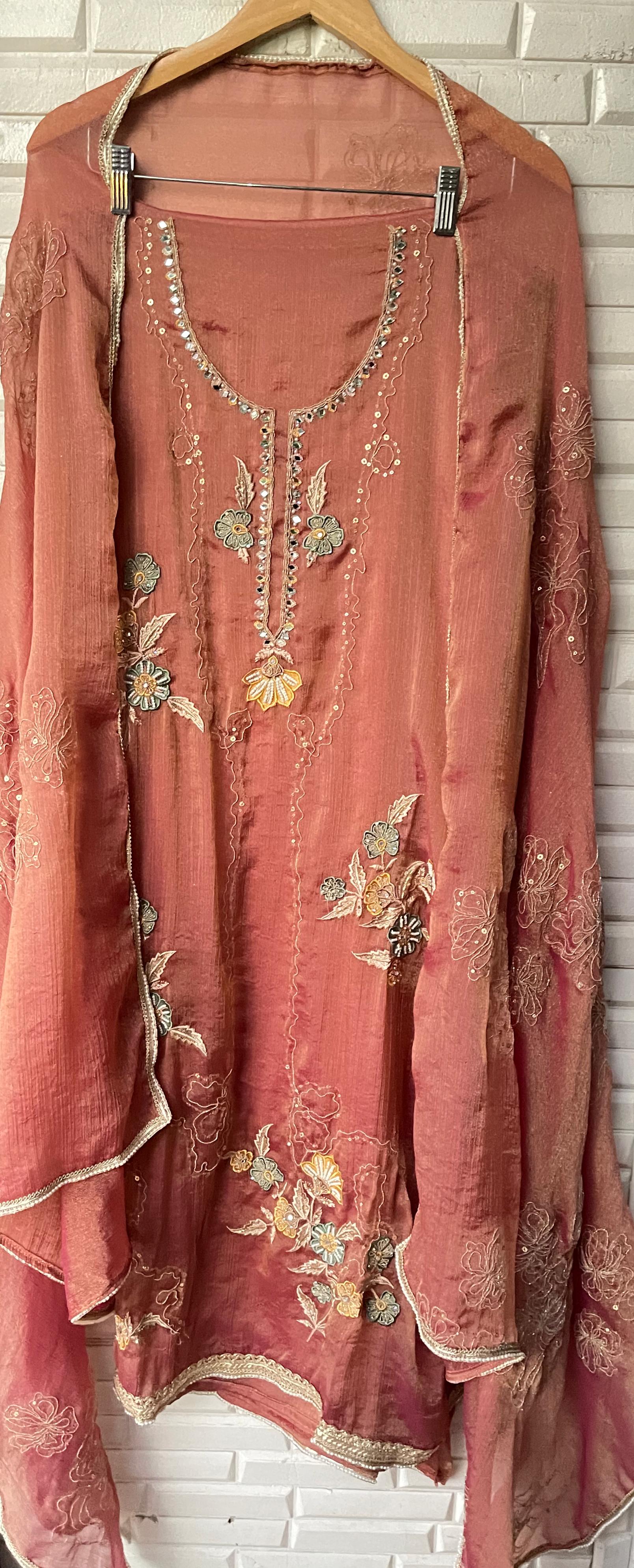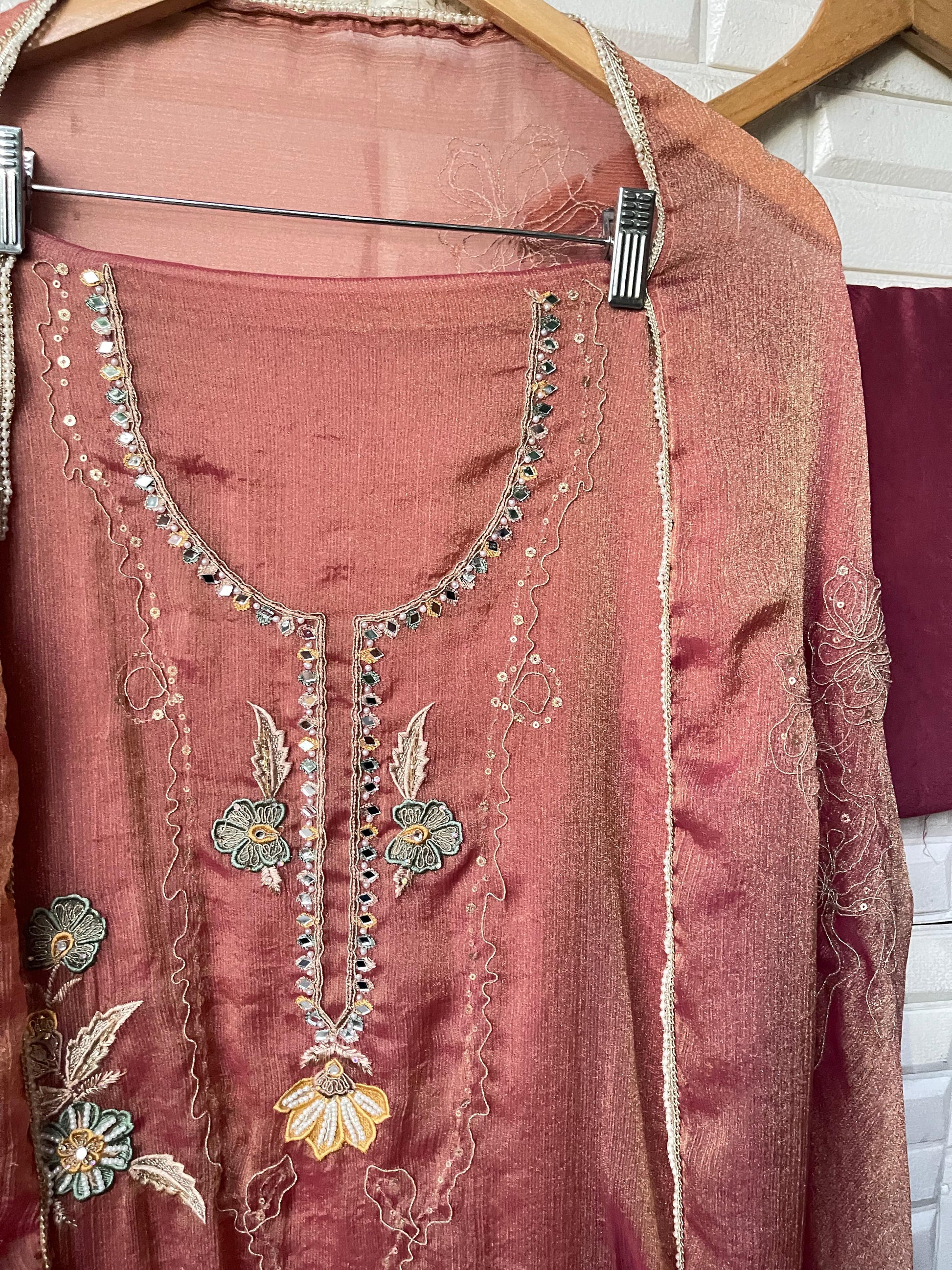 π self crushed shimmer Chinon fabric unstitched shirt with mirror work resham sequence zari swarowski embroidery with ghera border lace