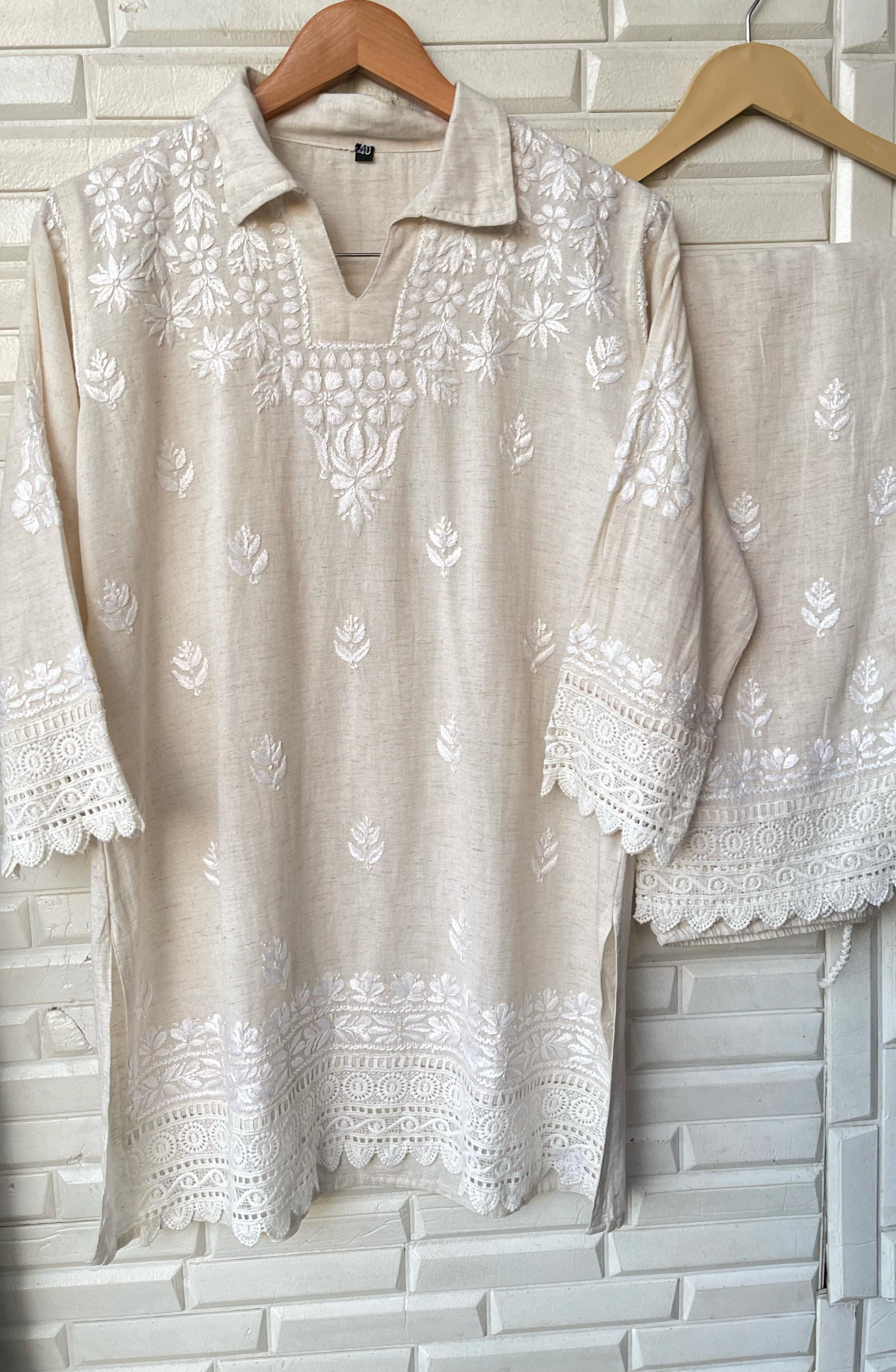 😊 self linen cotton fabric stitched coord set shirt with resham embroidery with lining