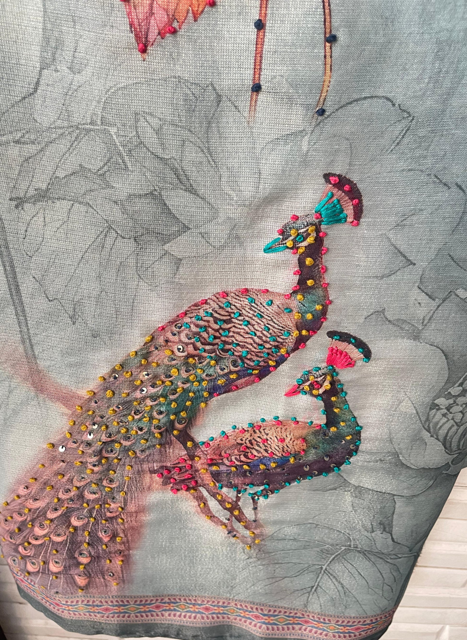 π self linen silk printed fabric unstitched shirt with resham knots sequence highlighting