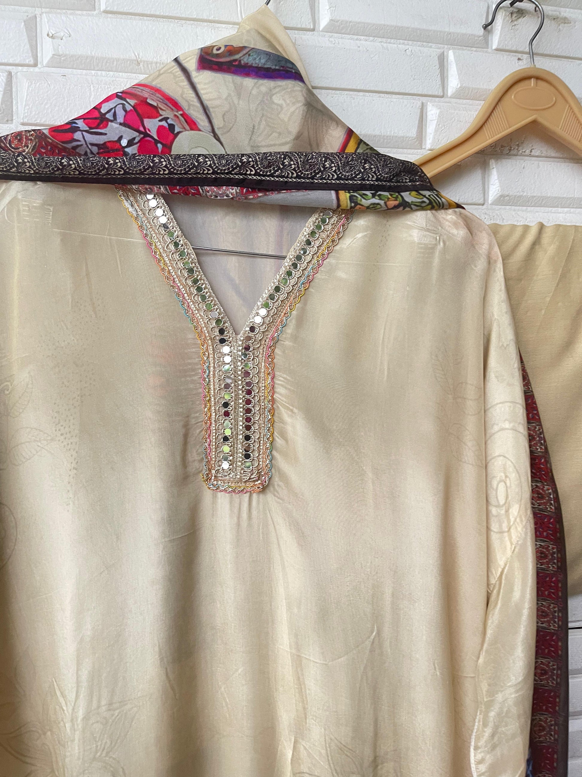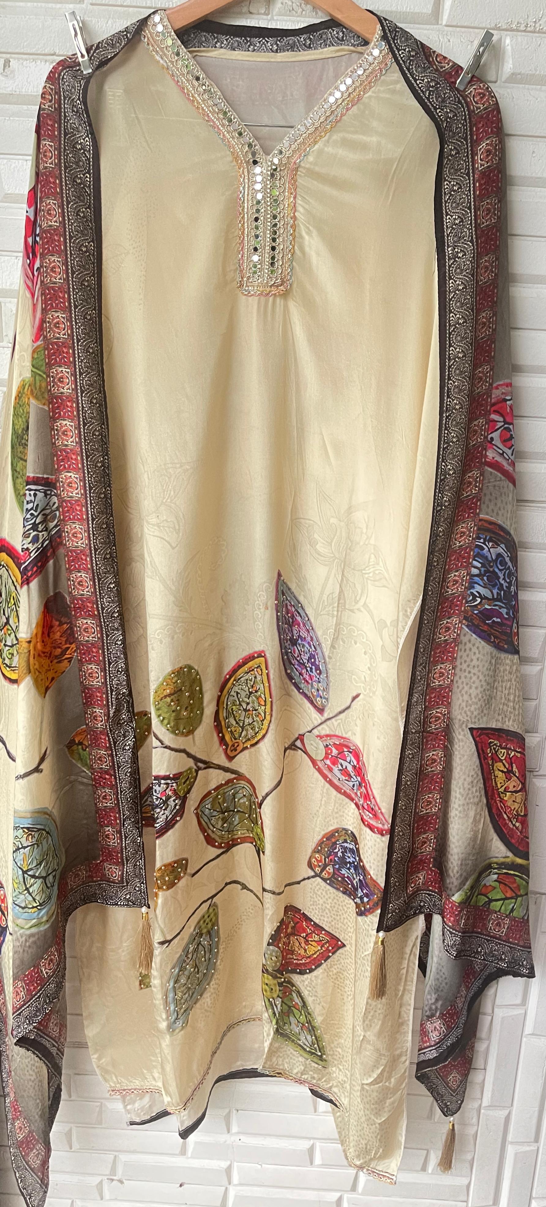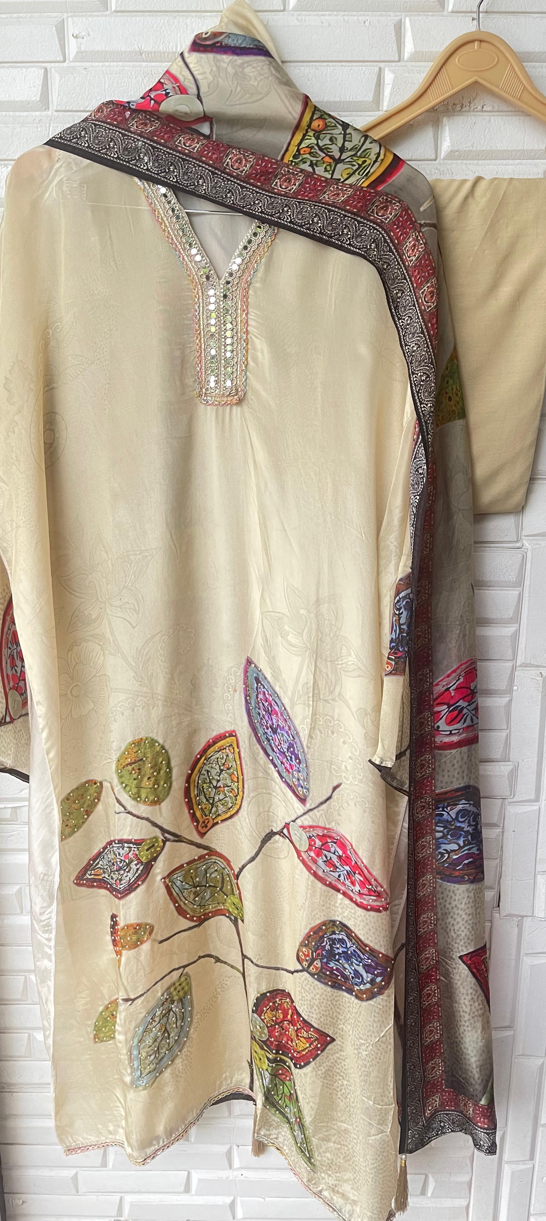 π self muslin crape fabric unstitched shirt with mirror zari resham lace on neck and pearl highlighting on printed patchwork
