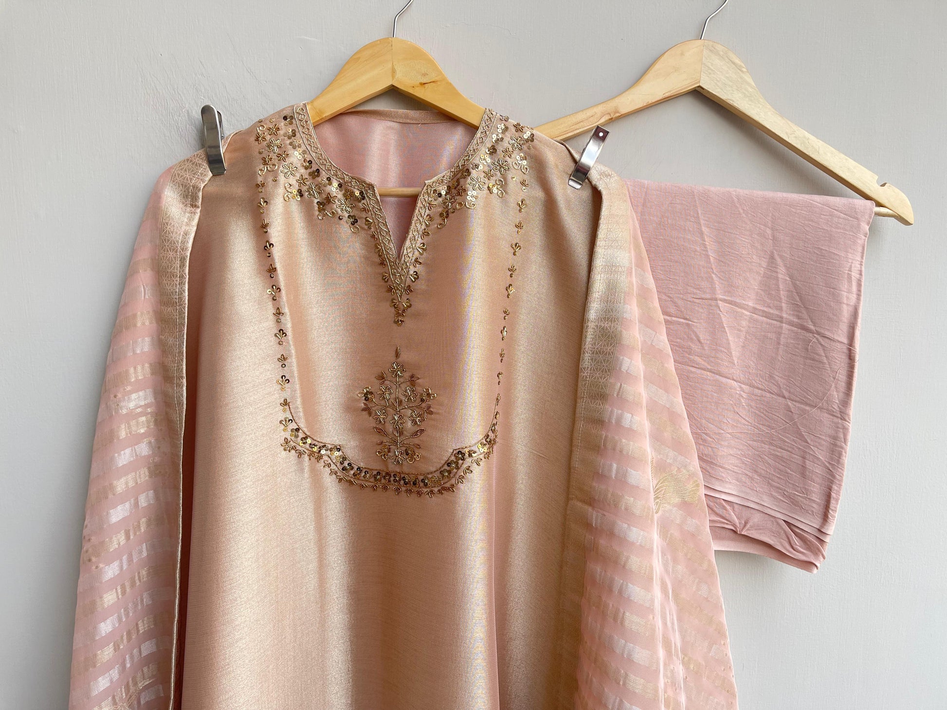 π self shimme jiraffe silk printed fabric unstitched shirt with pearl dabka sequence embroidery