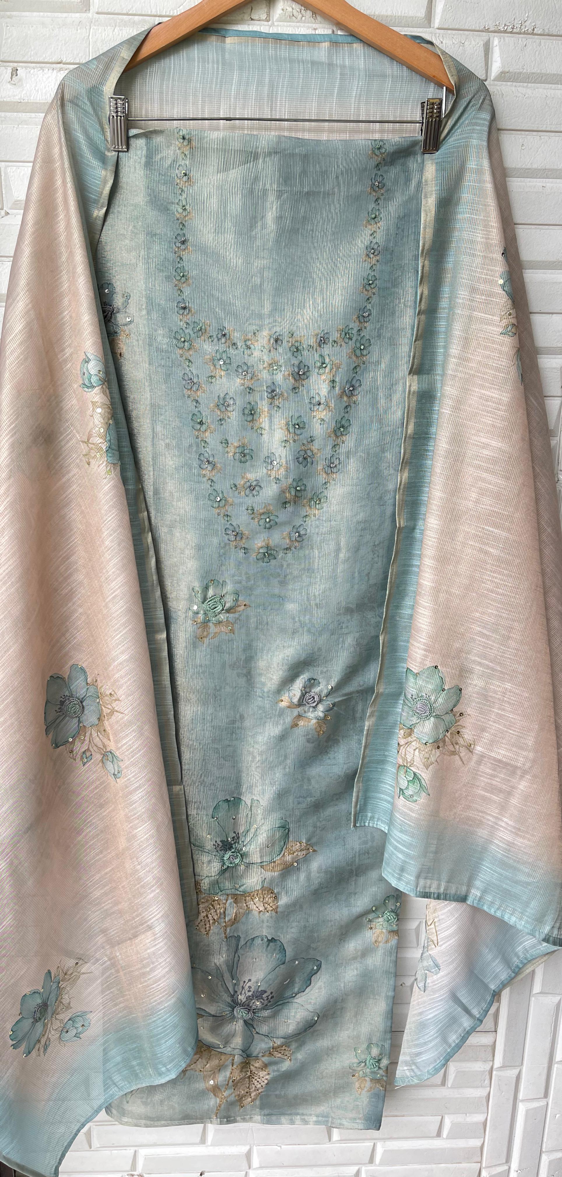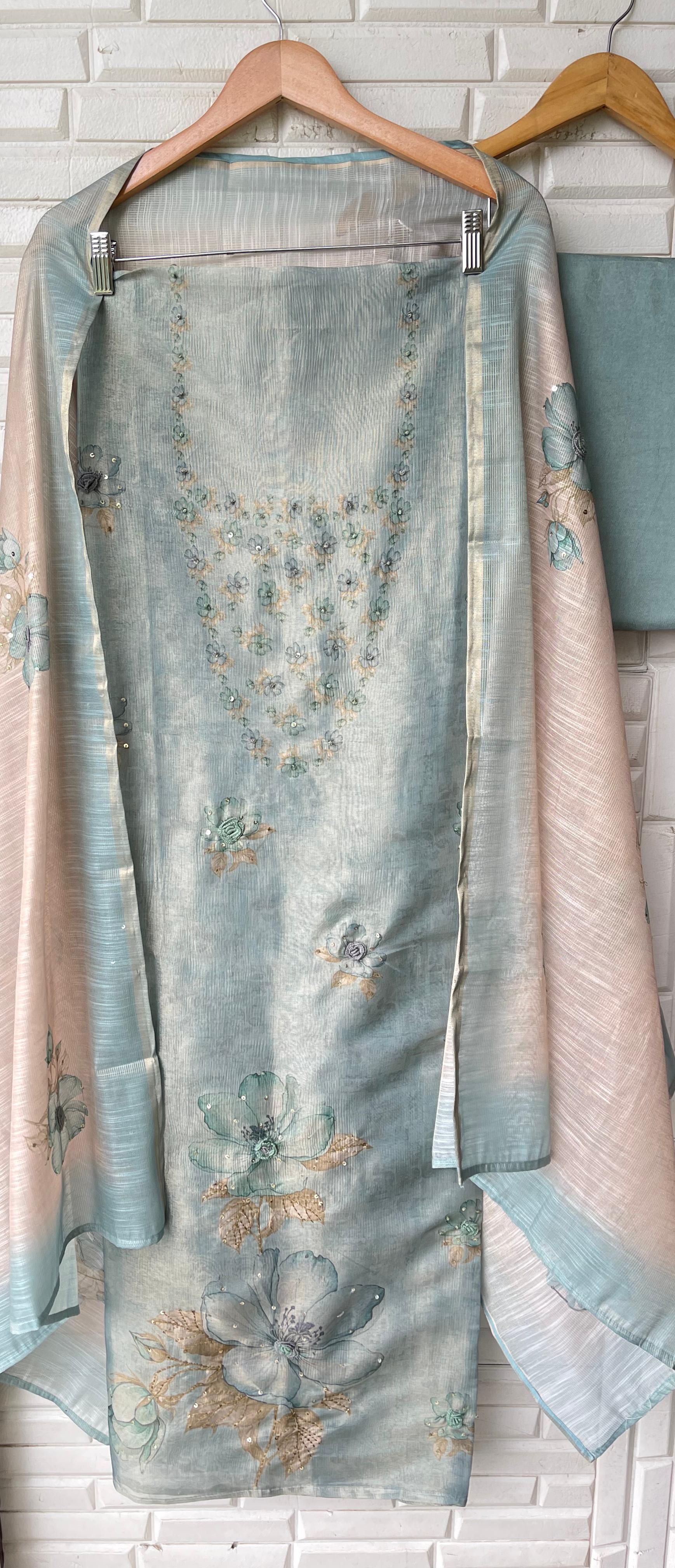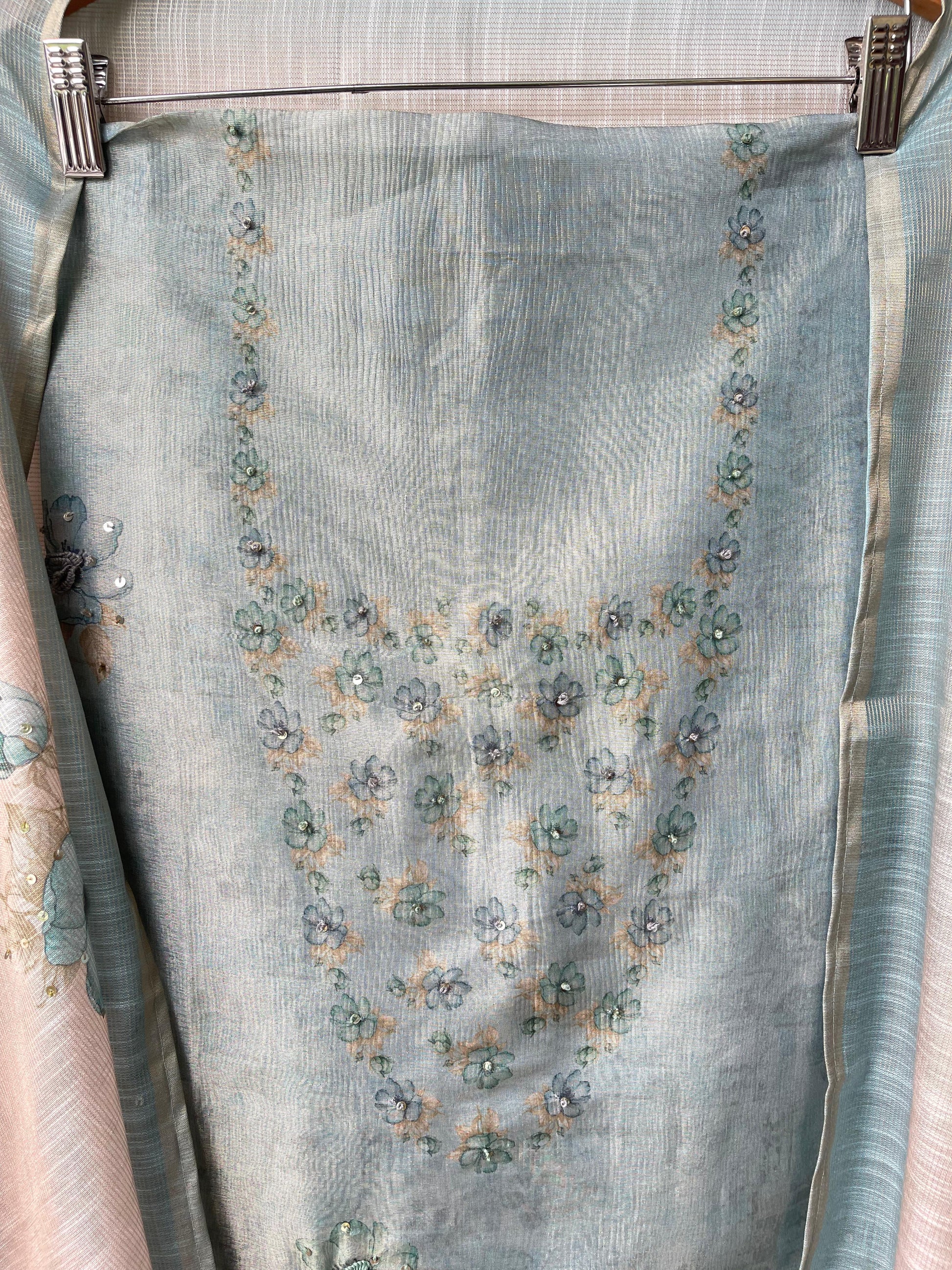 😊 self shimmer linen printed fabric unstitched shirt with sequence resham embroidery and 3D flowers