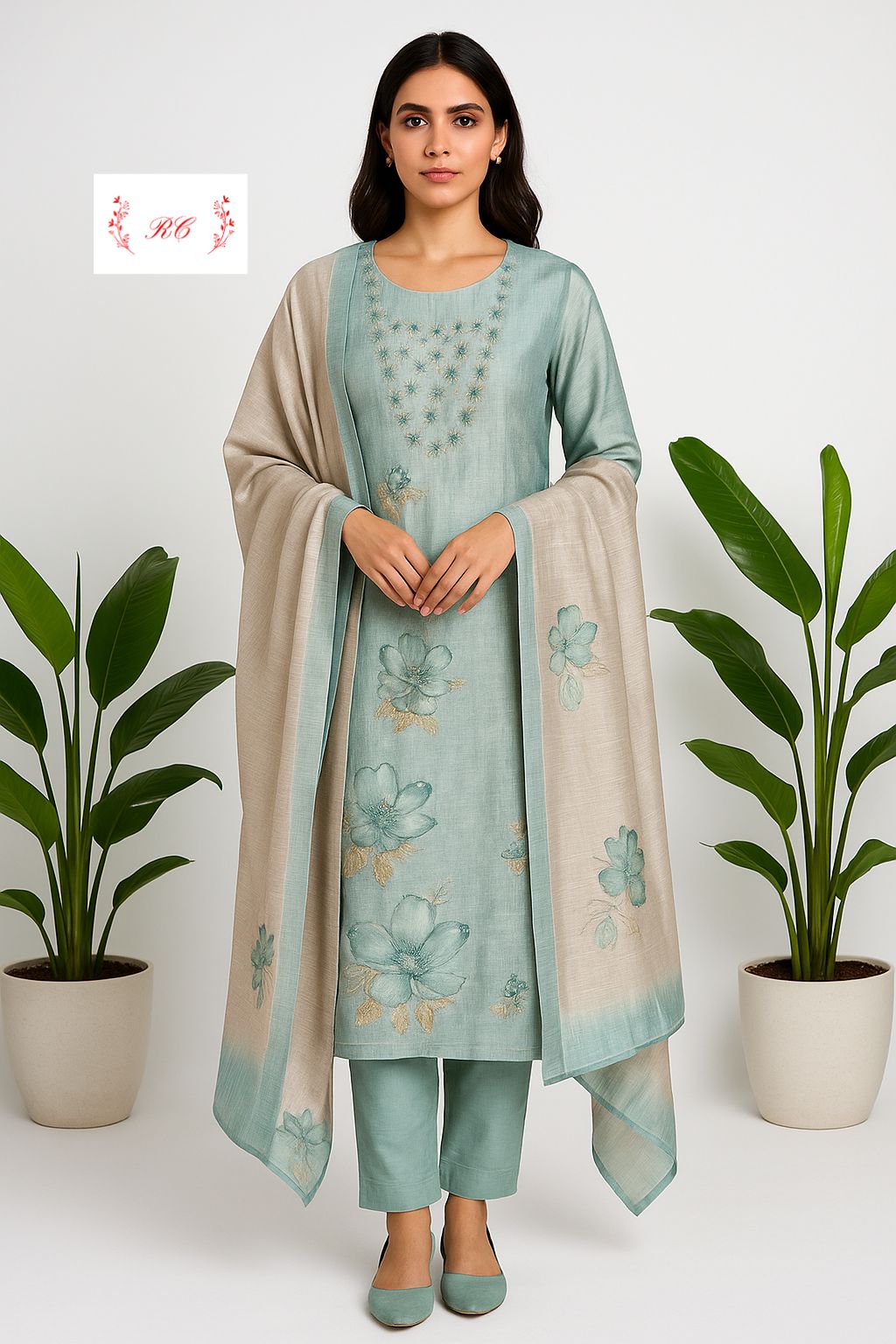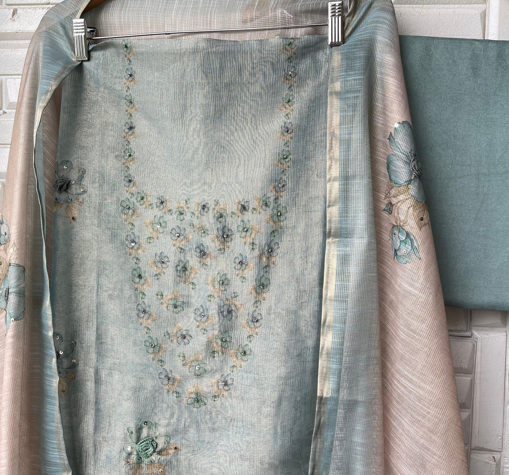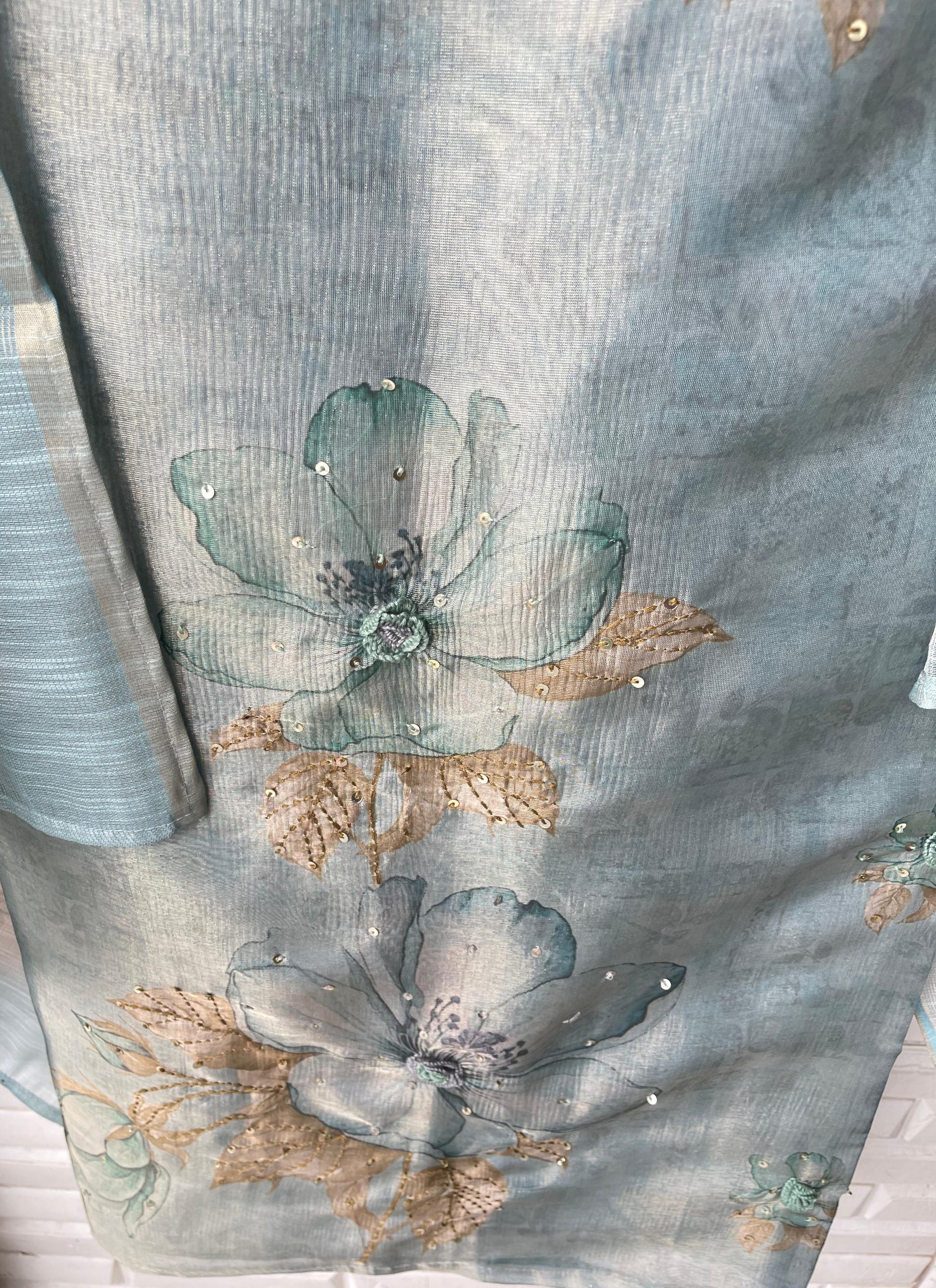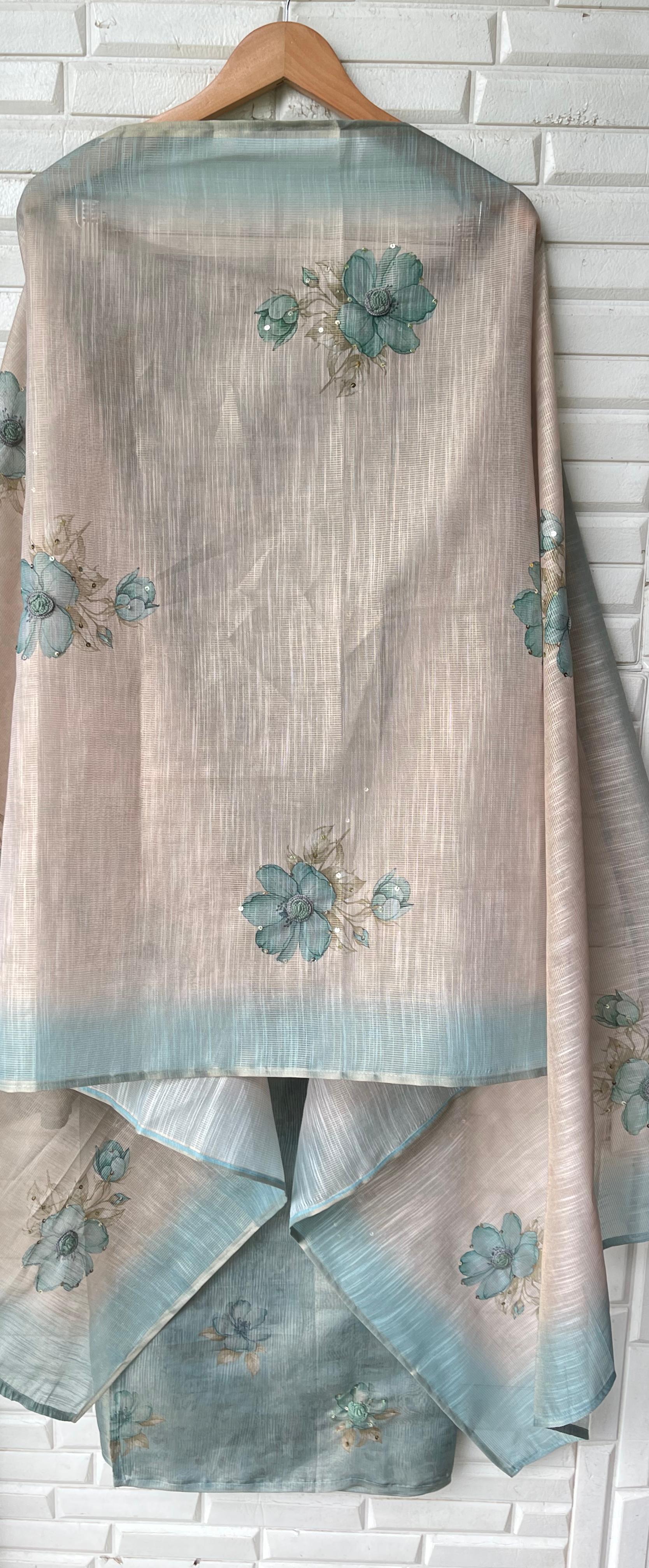 😊 self shimmer linen printed fabric unstitched shirt with sequence resham embroidery and 3D flowers