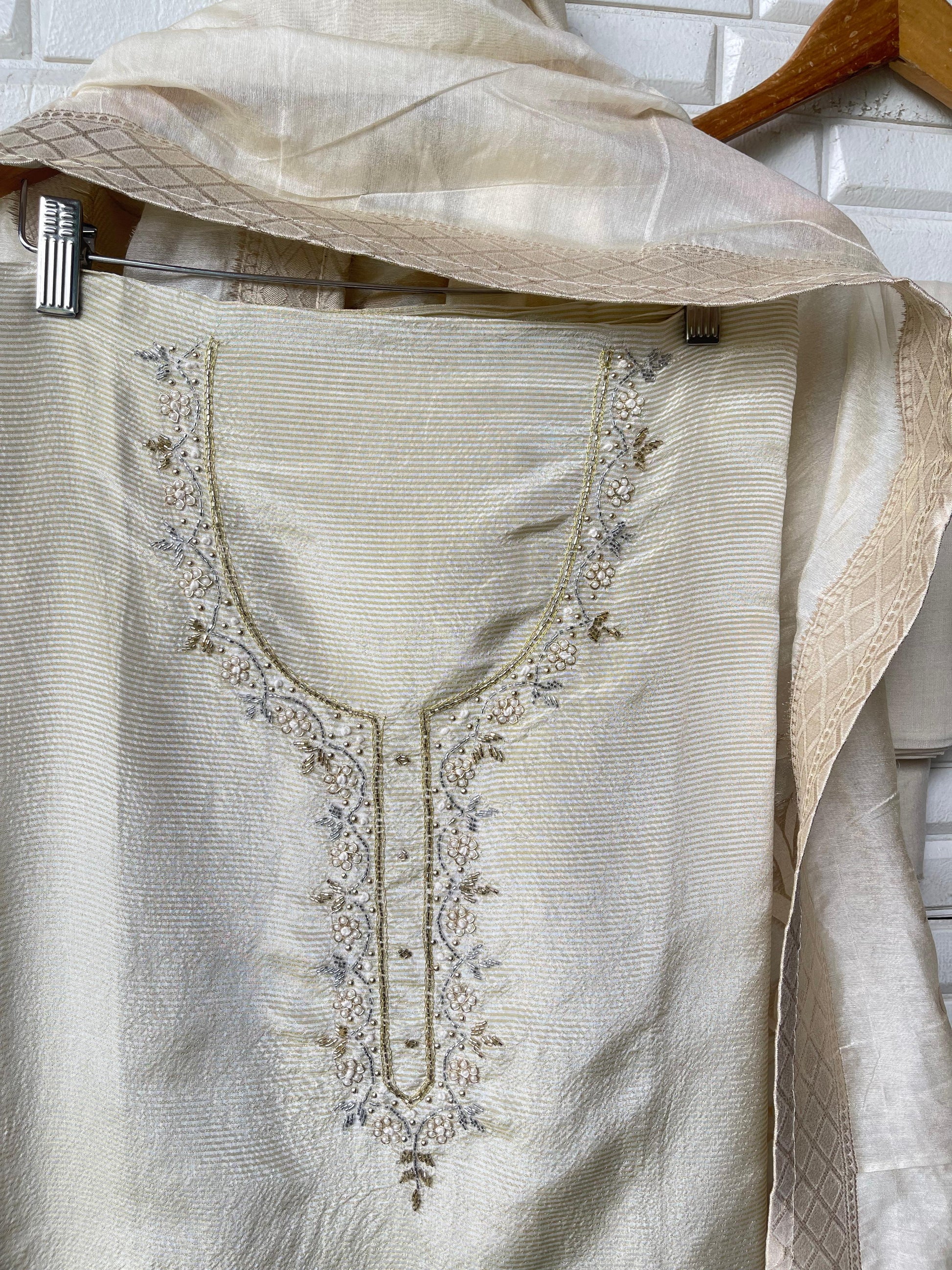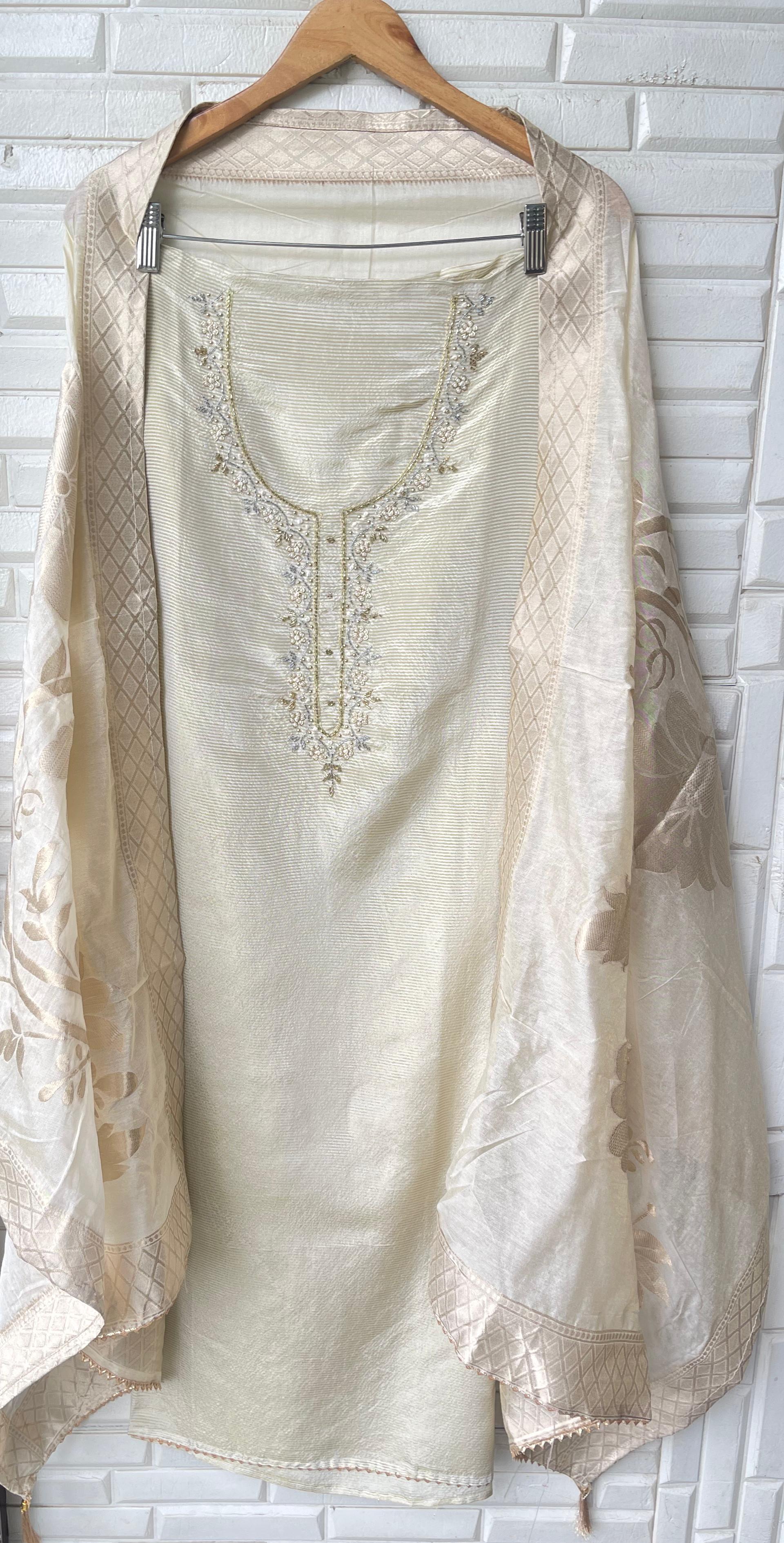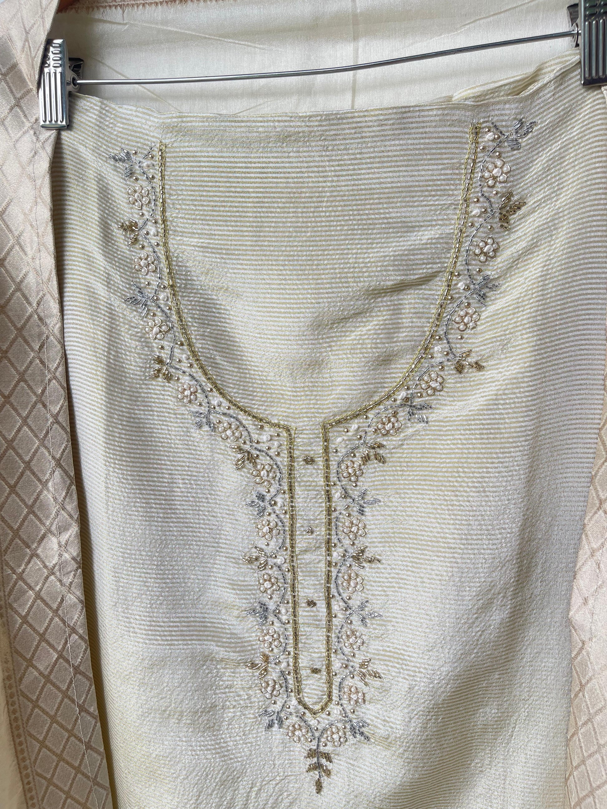 π zari weaving self shimmer silk fabric unstitched shirt with swarowski pearl zari kutdanna embroidery