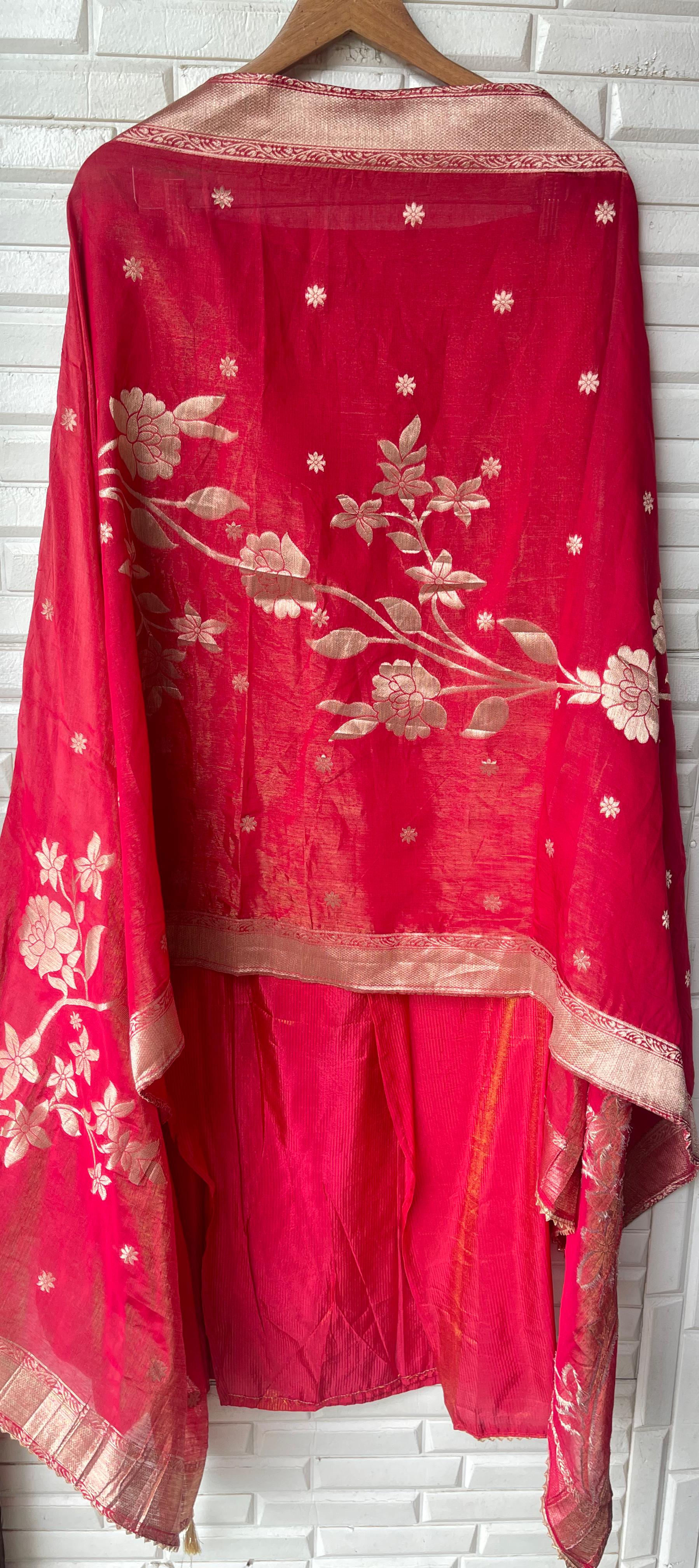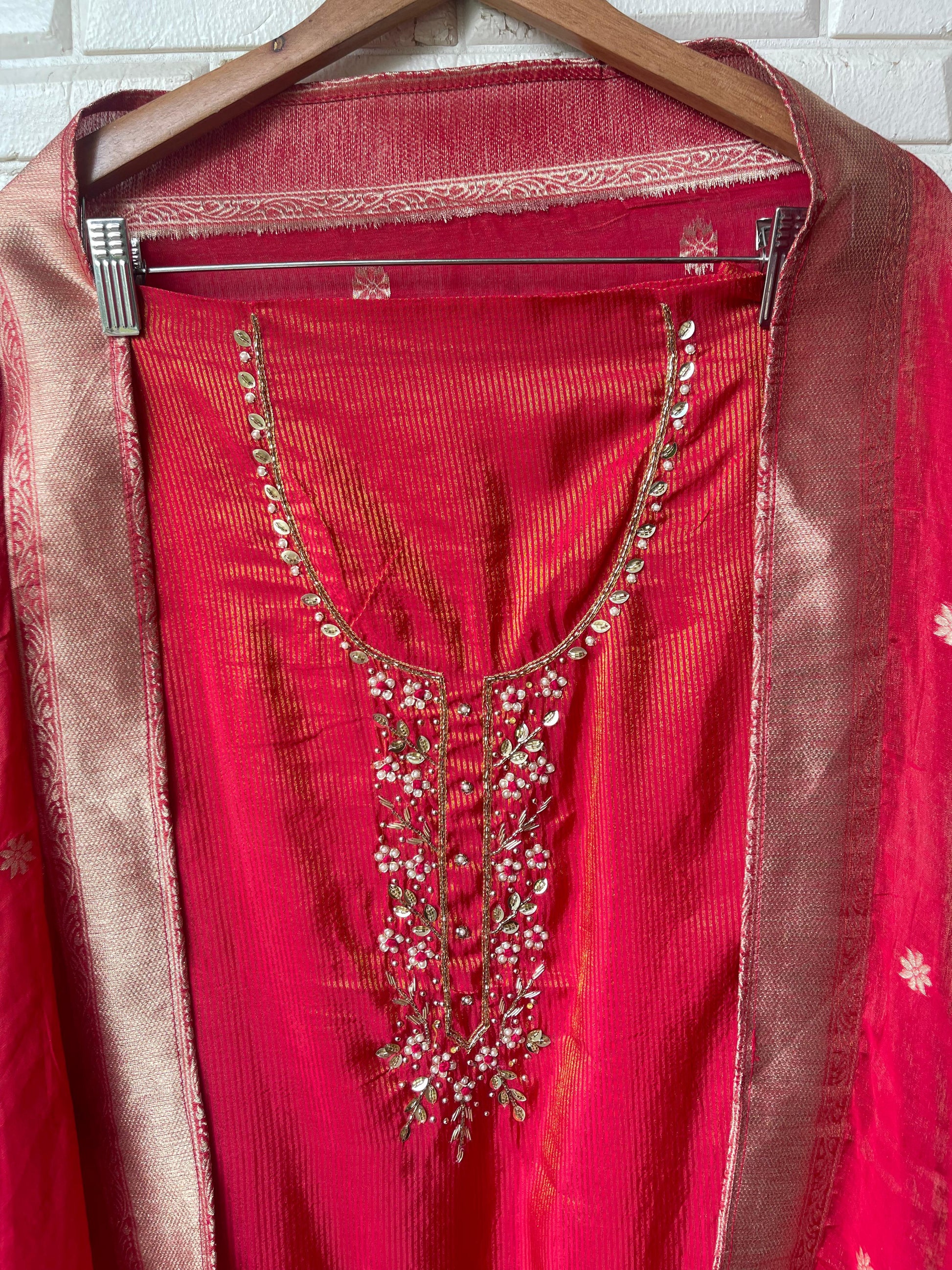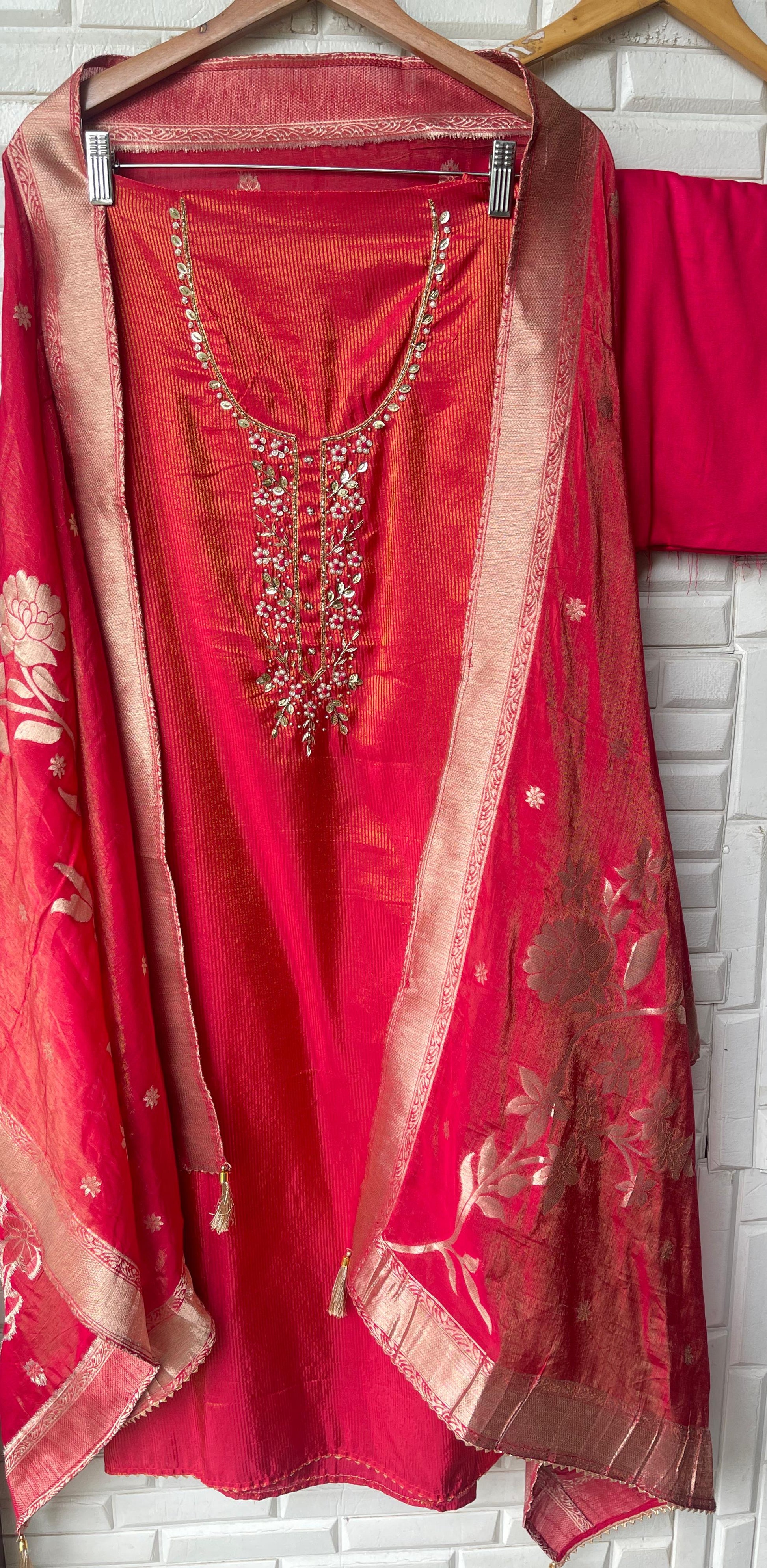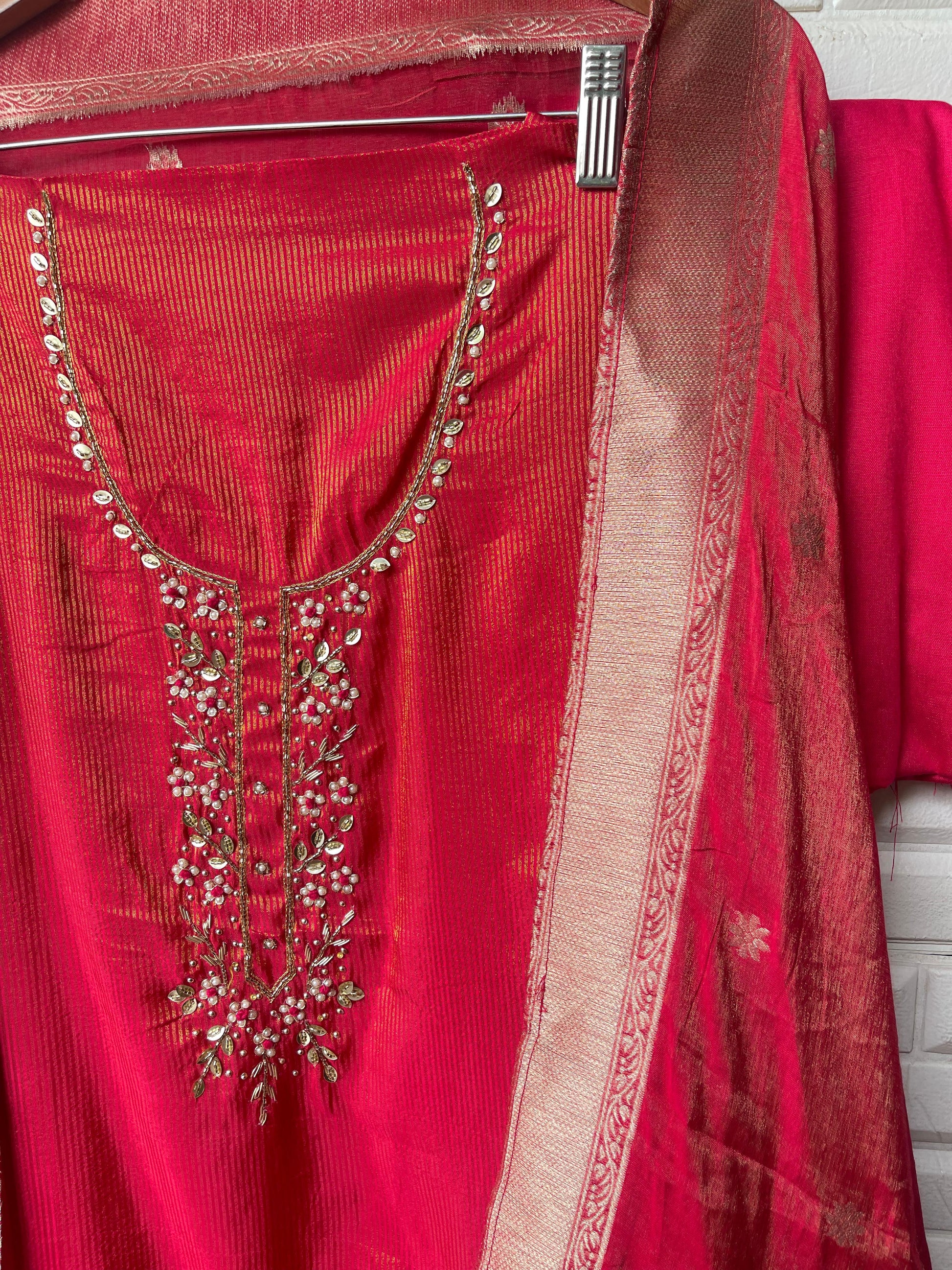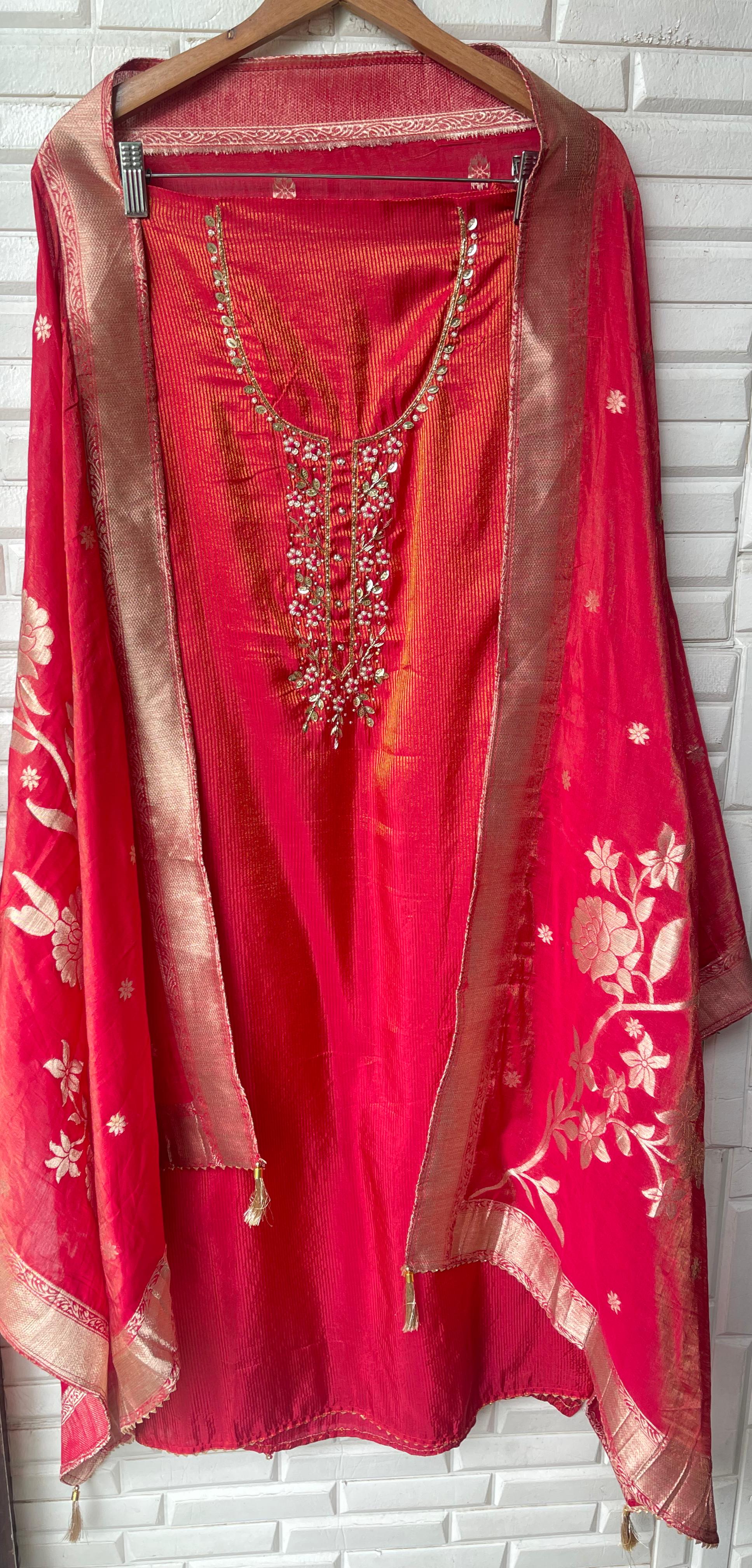 😊 self shimmer silk fabric unstitched shirt with pearl dabka sequence zari embroidery