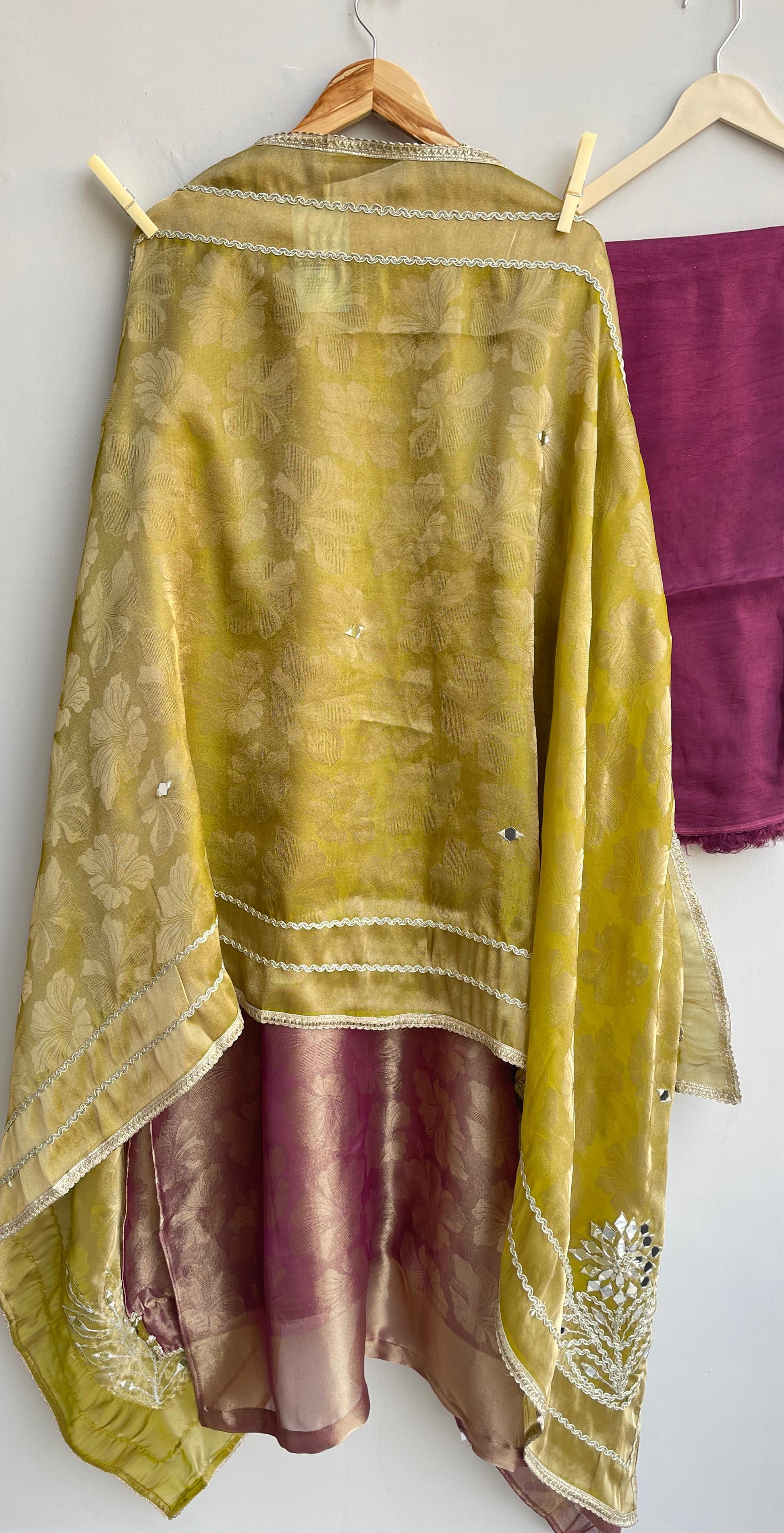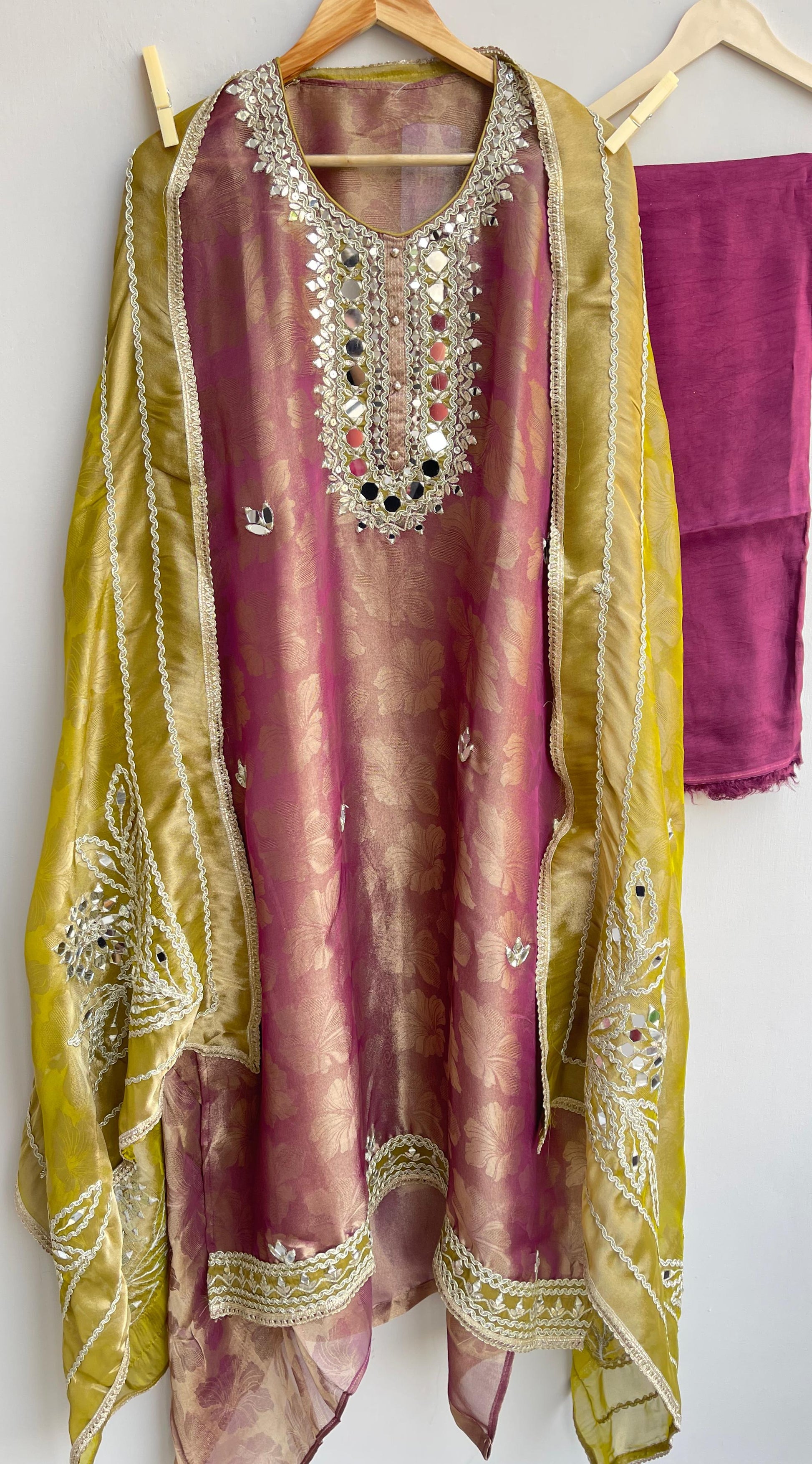 π pure self shimmer silk fabric unstitched shirt with actual mirror work and zari embroidery and ghera lace