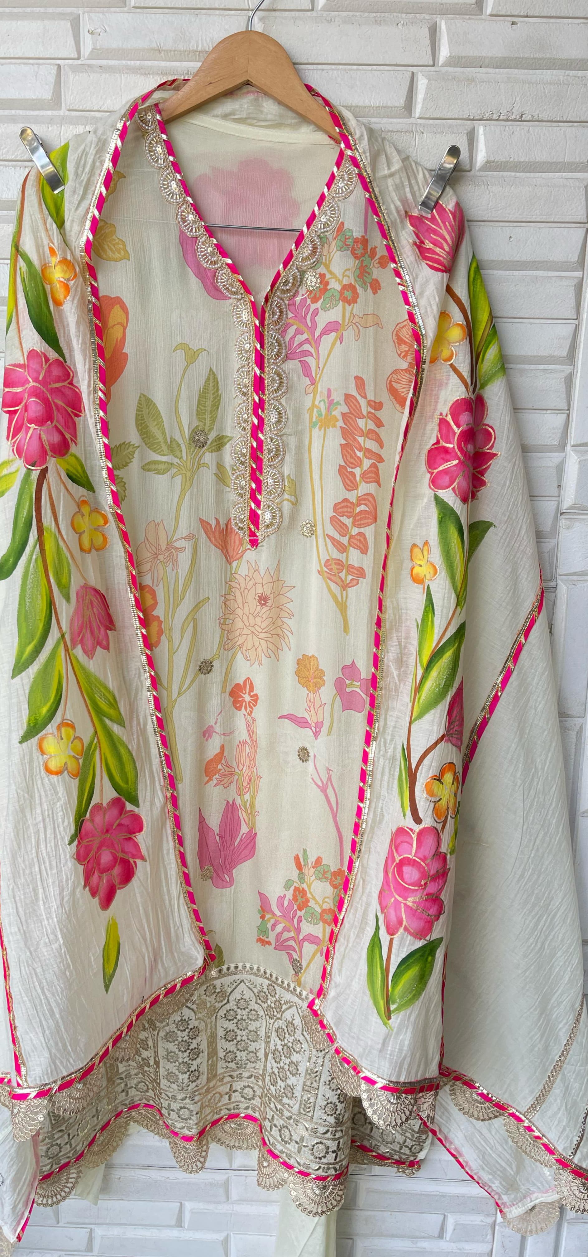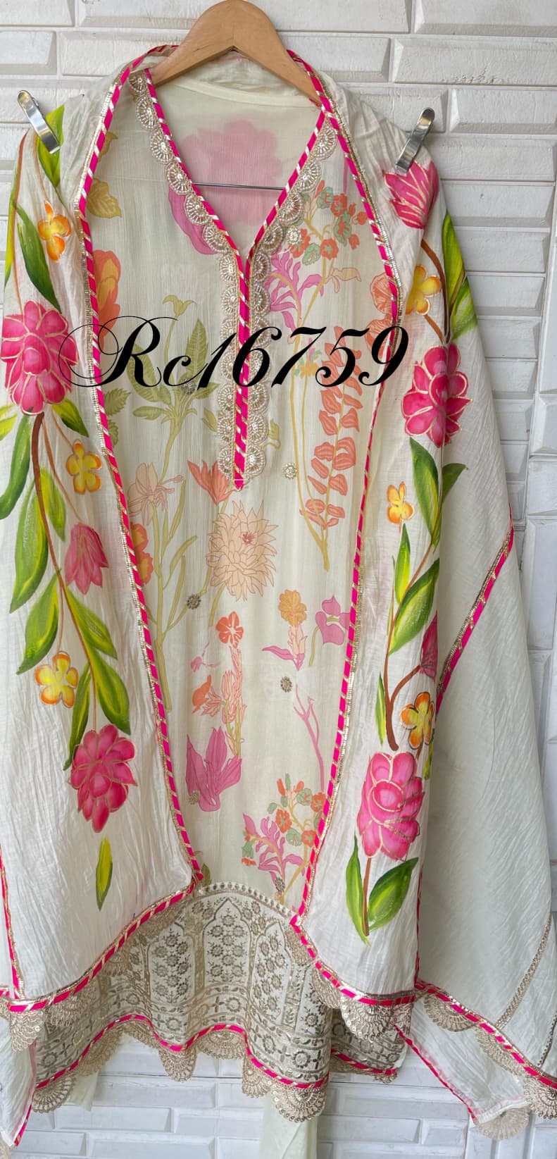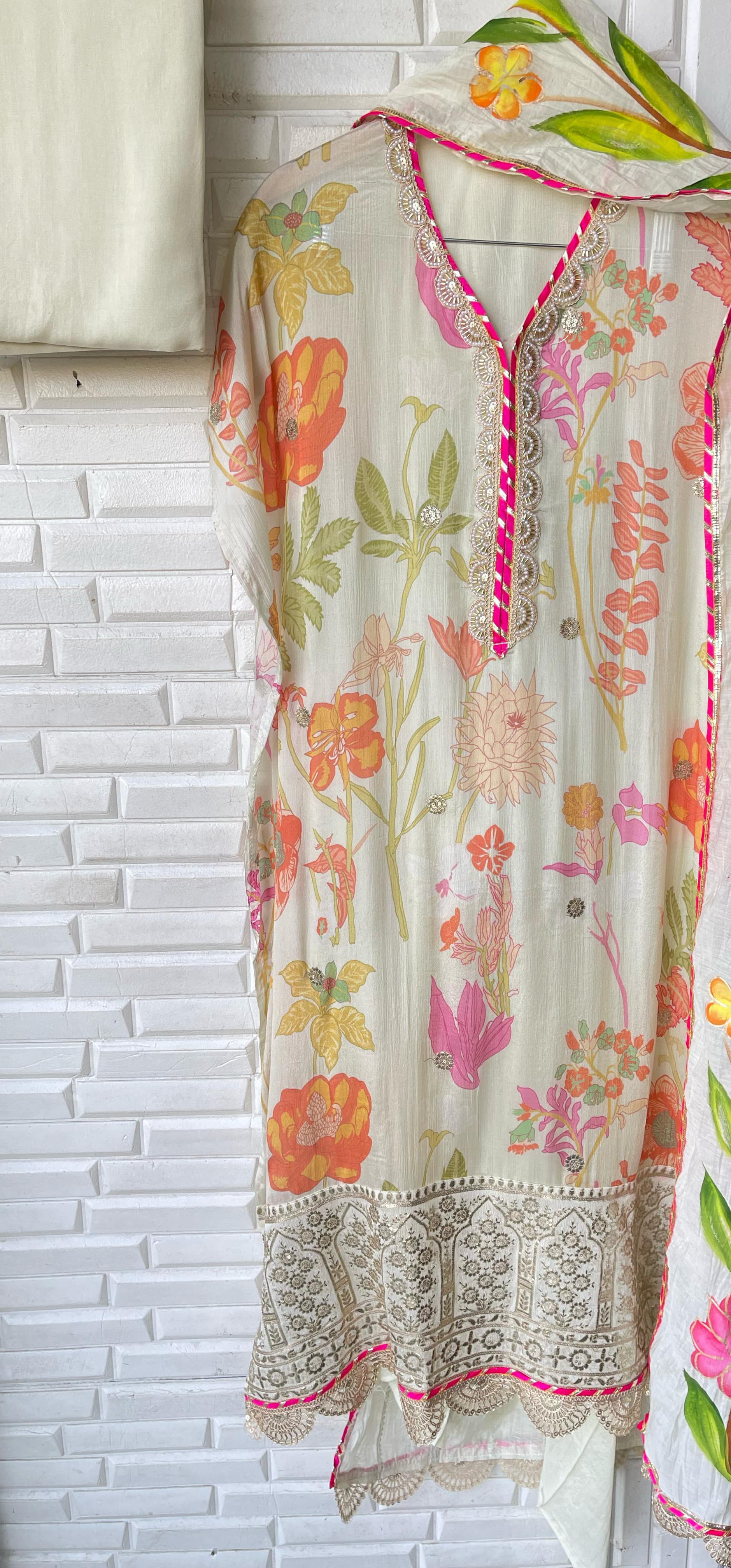 š Shimmer chinnon printed fabric unstitched shirt with gotta work kutdanna zari pearl embroidery and ghera laceĀ