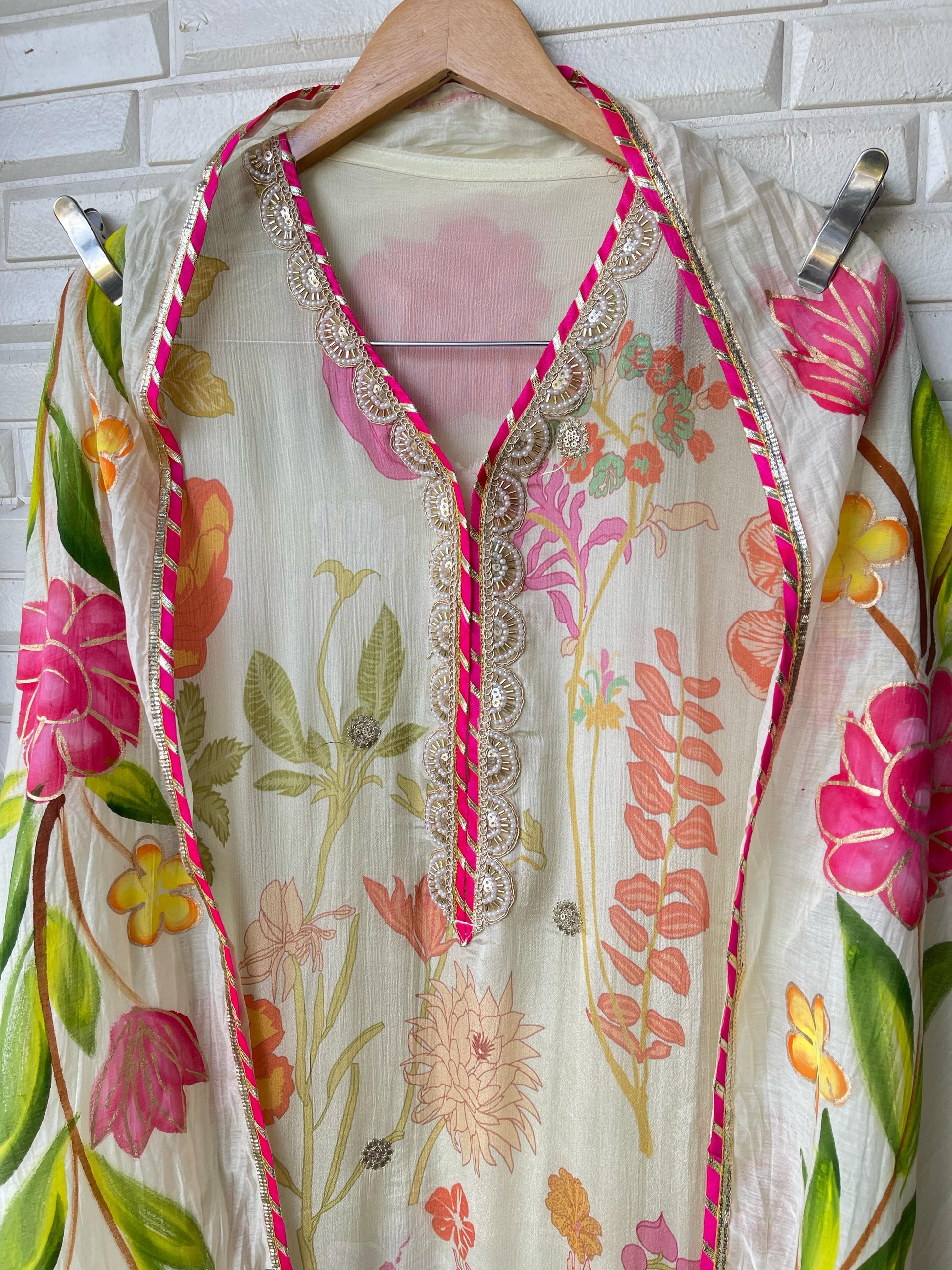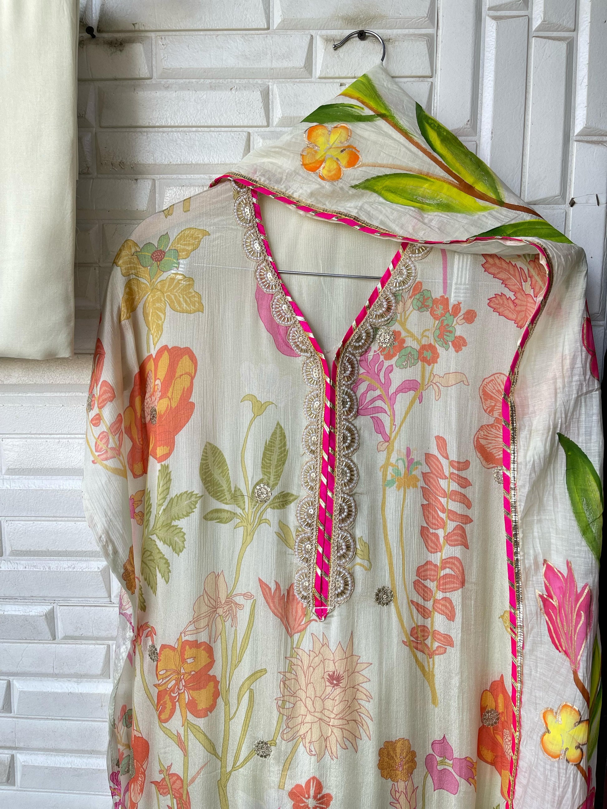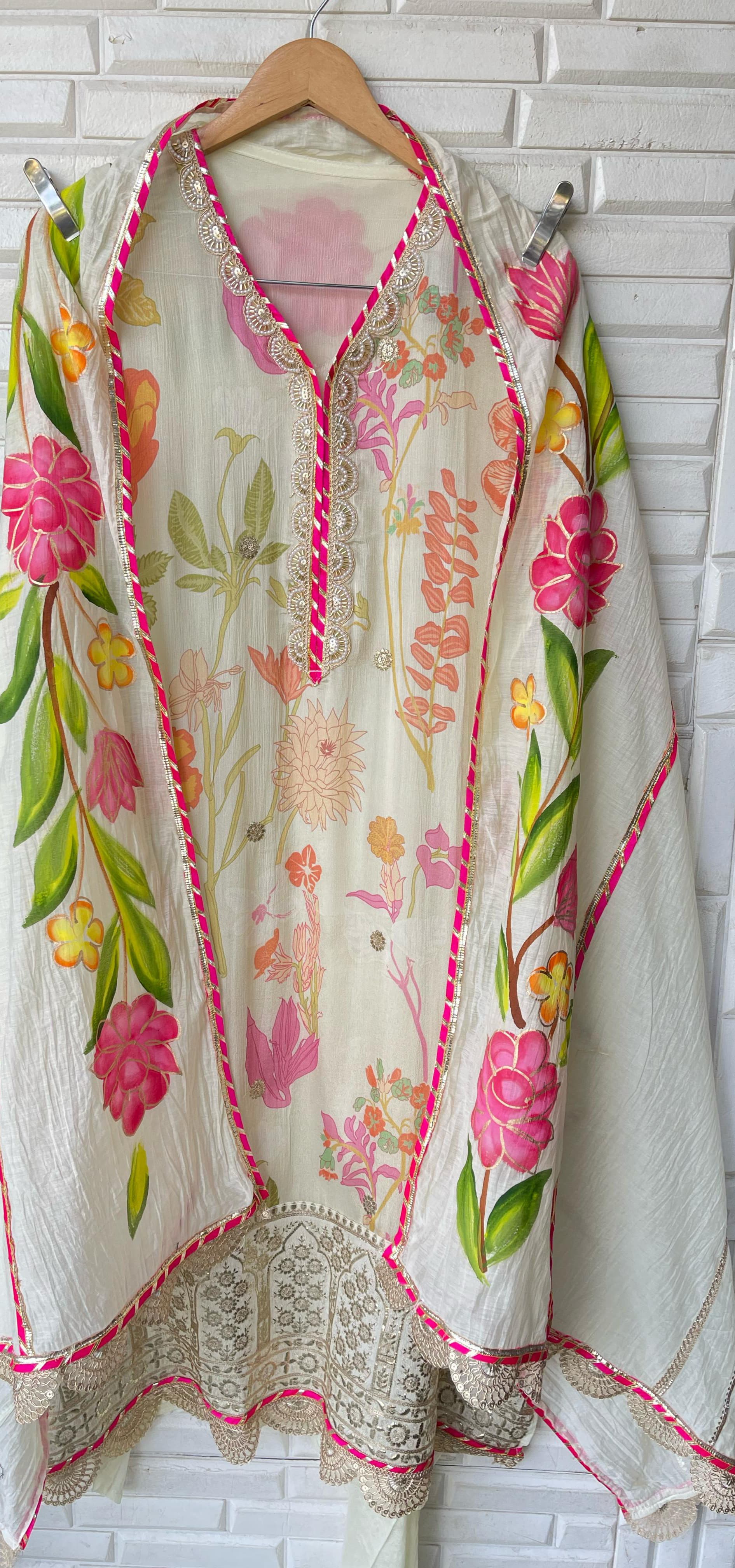 š Shimmer chinnon printed fabric unstitched shirt with gotta work kutdanna zari pearl embroidery and ghera laceĀ