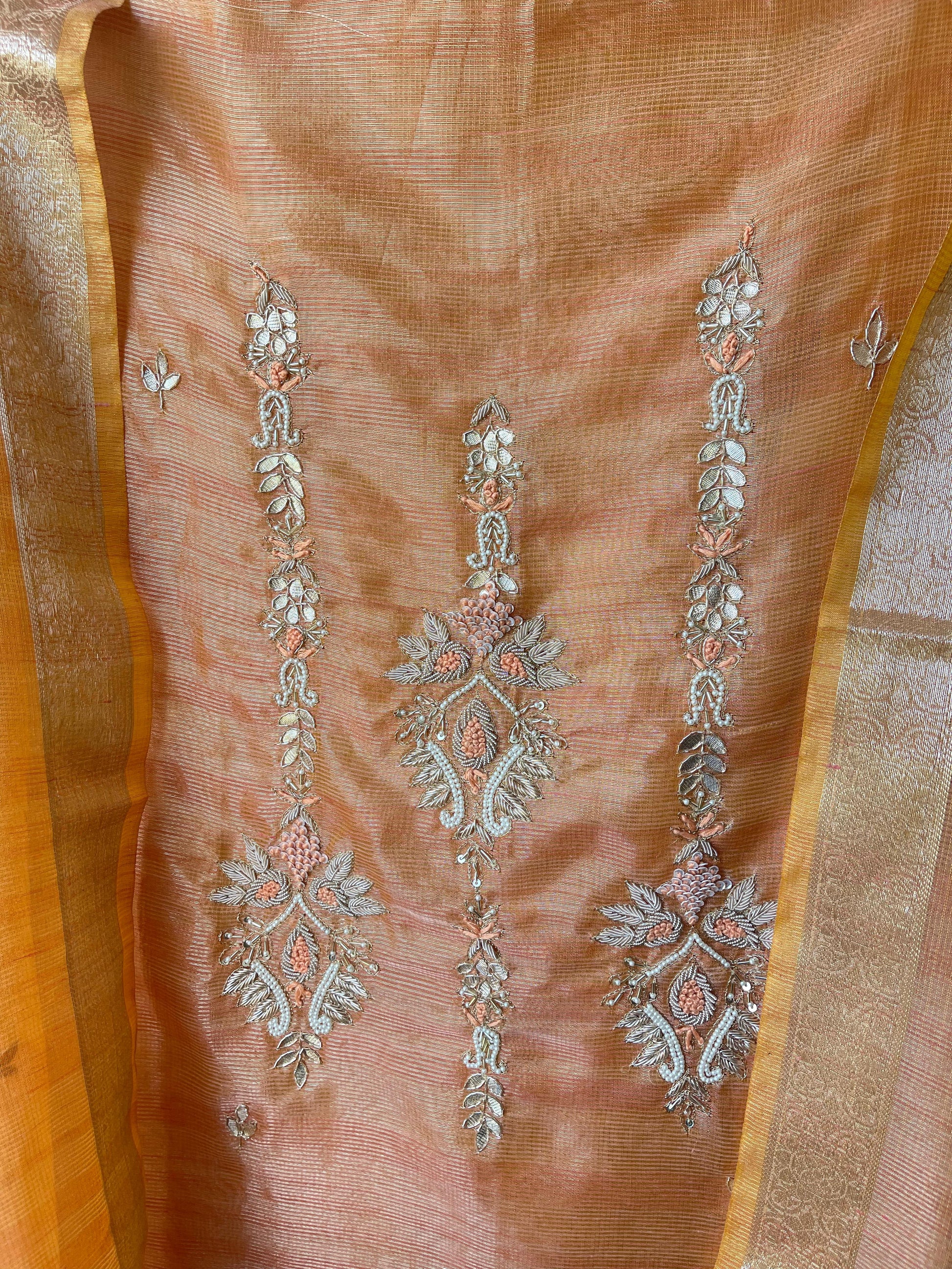 π shimmer linen silk fabric unstitched shirt with gotta work dabka pearl zari embroidery