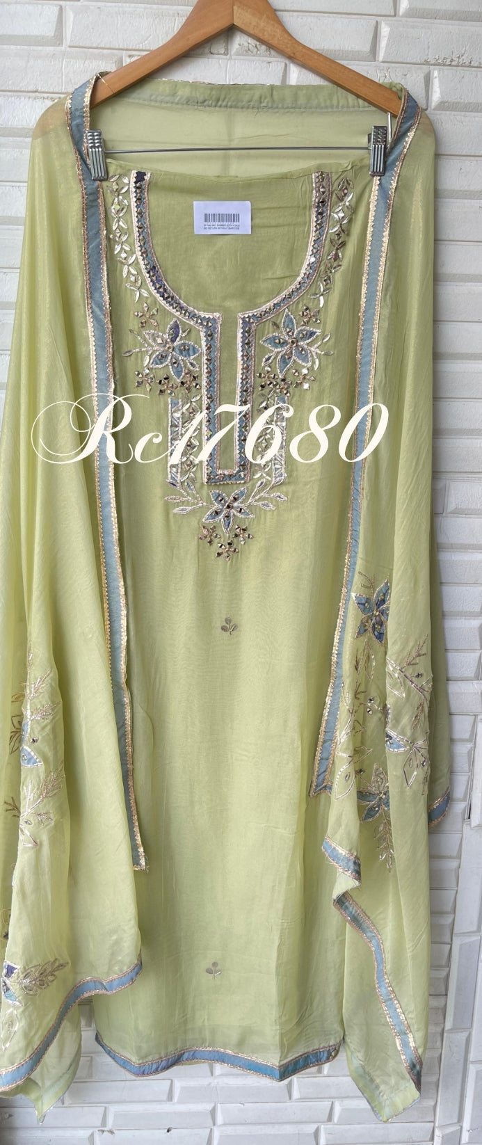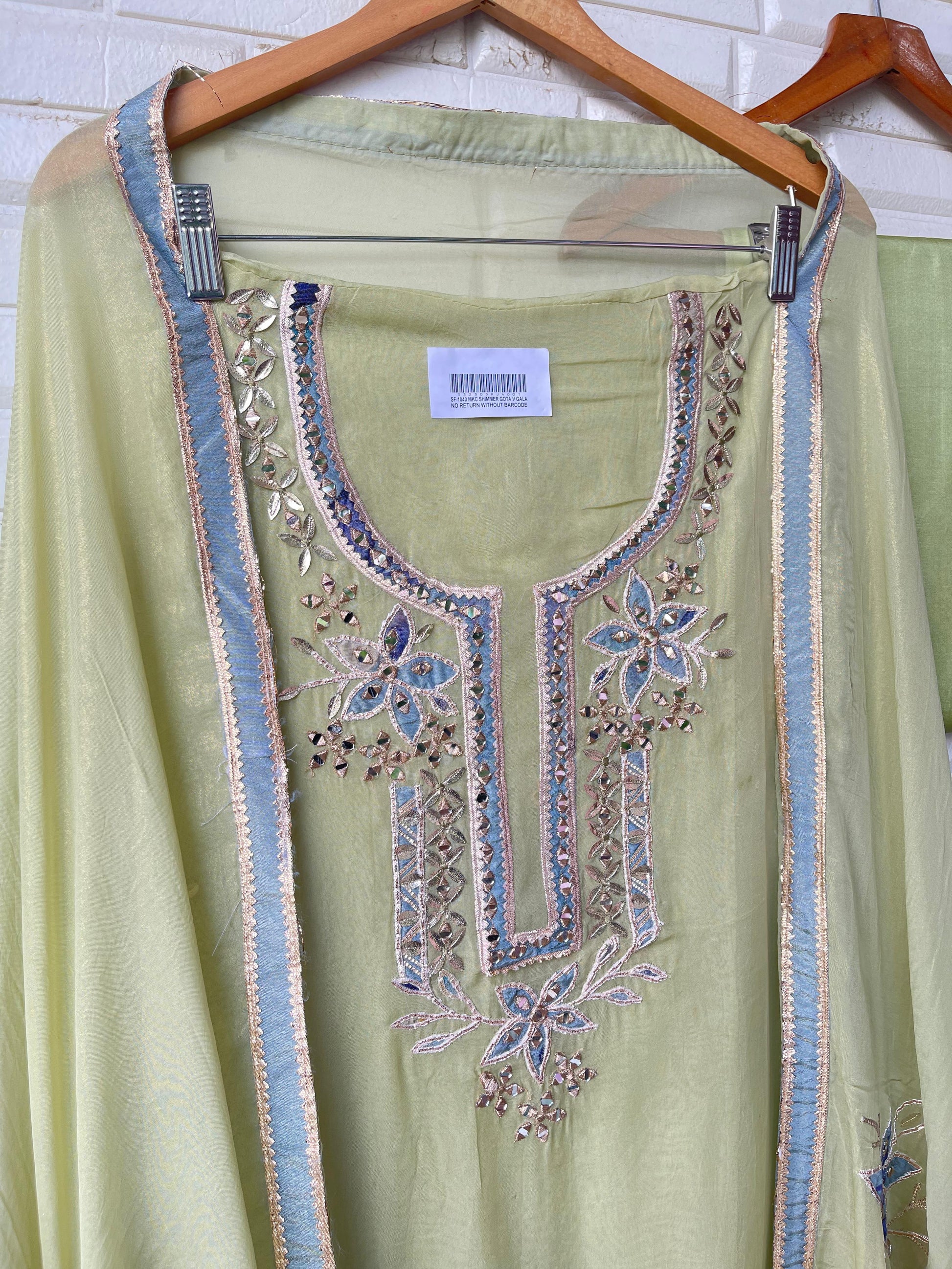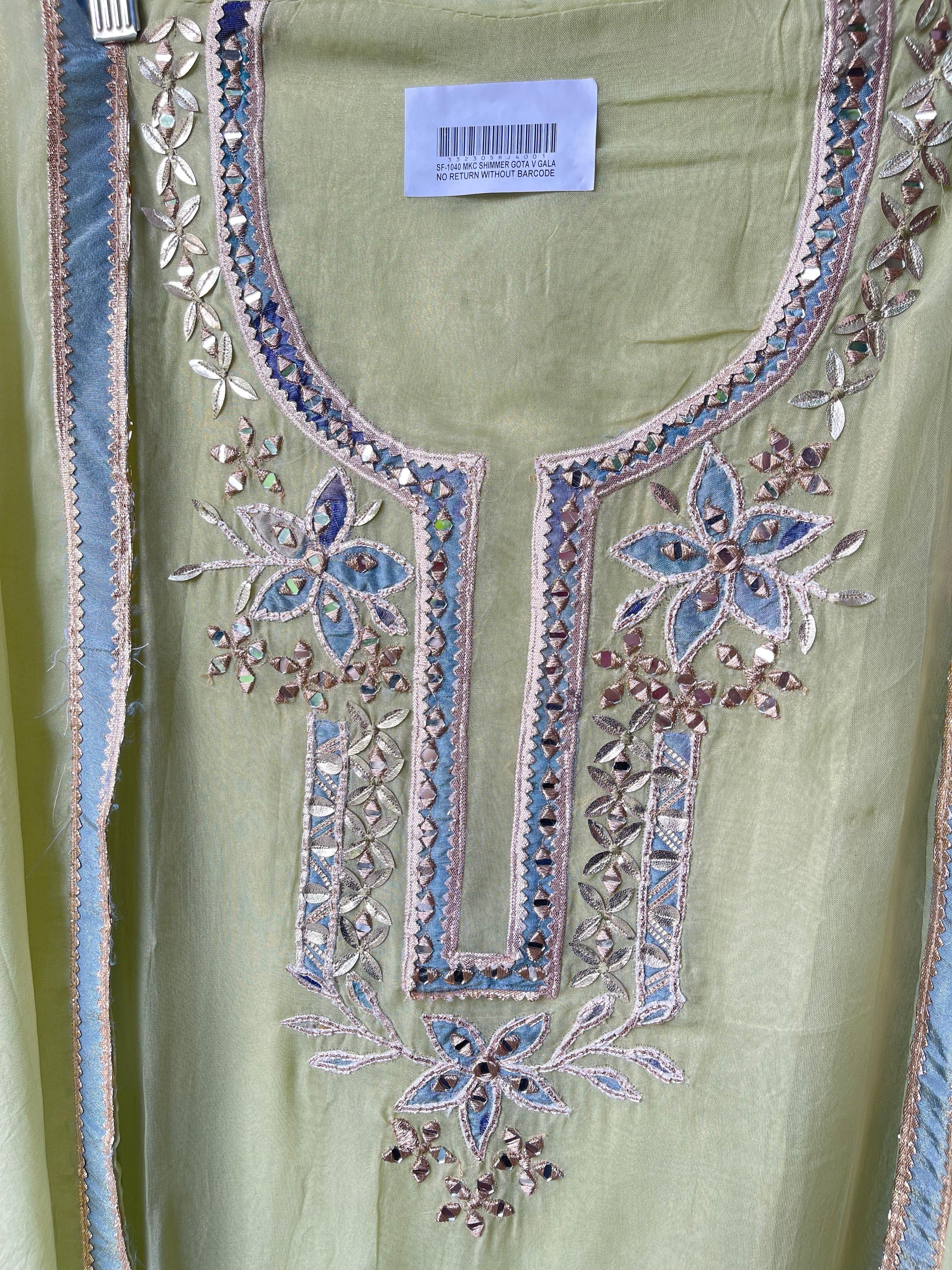 😊 pure shimmer organza printed fabric unstitched shirt with gotta lace mirror work zari leather patchwork embroidery