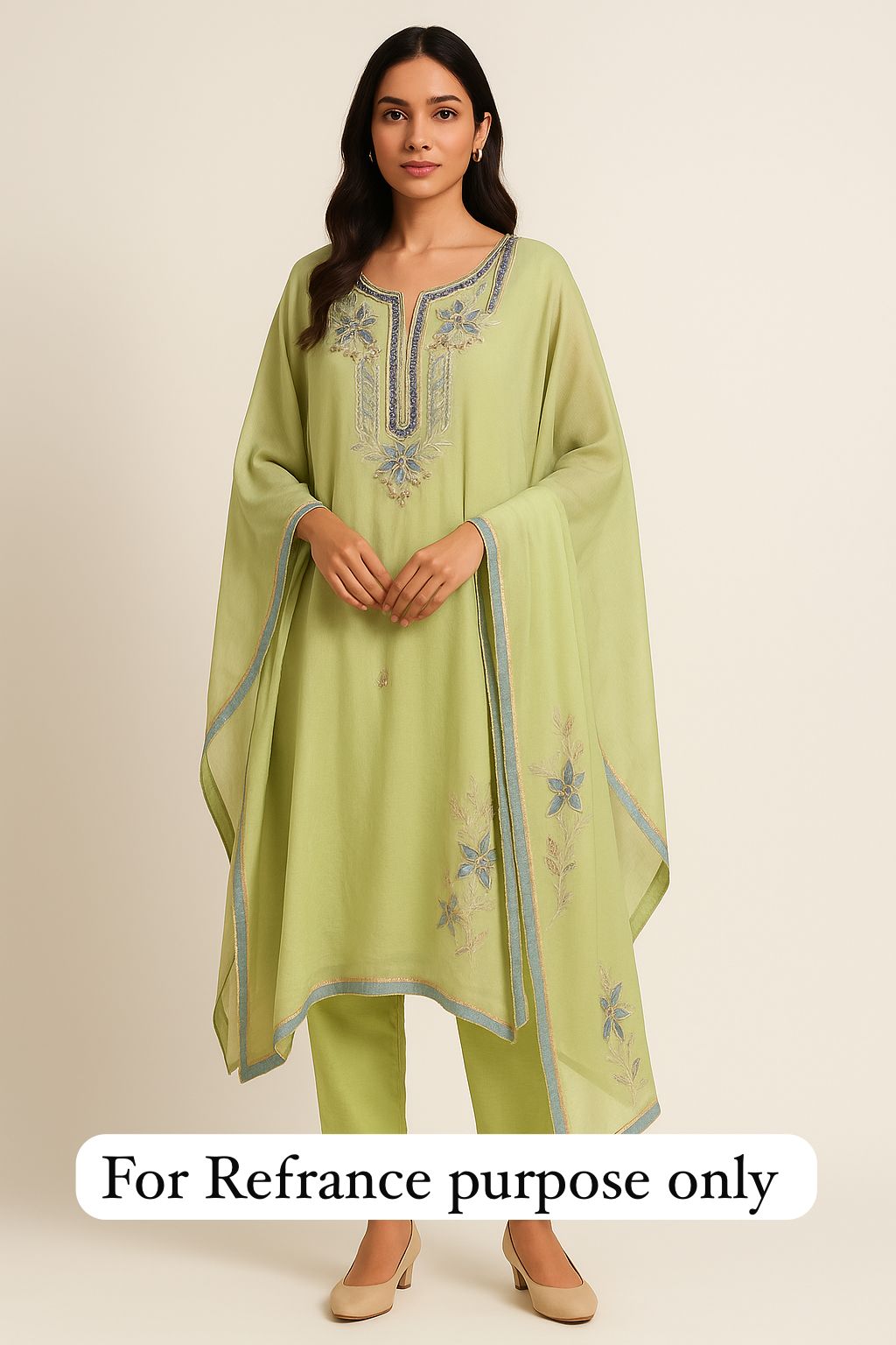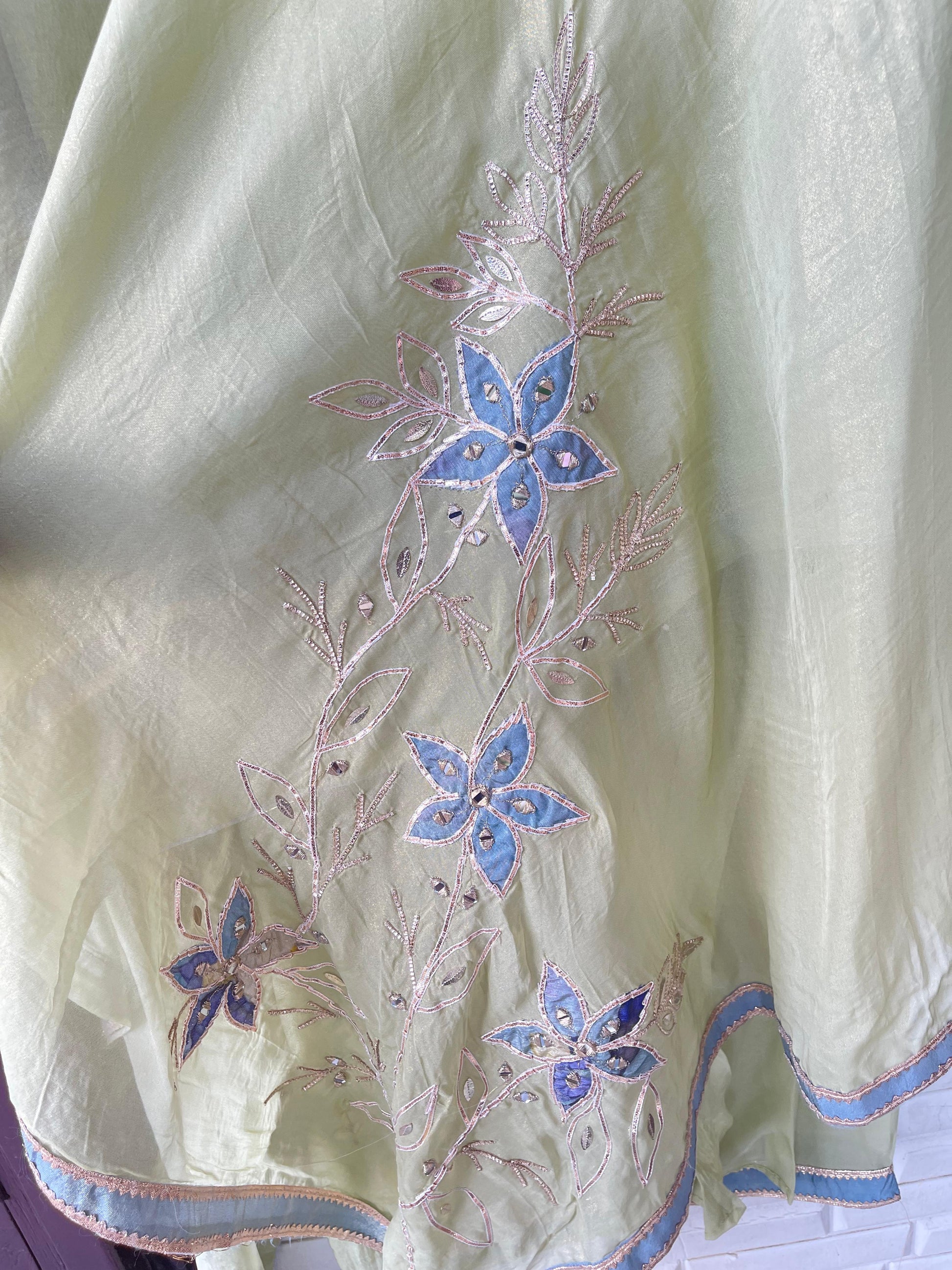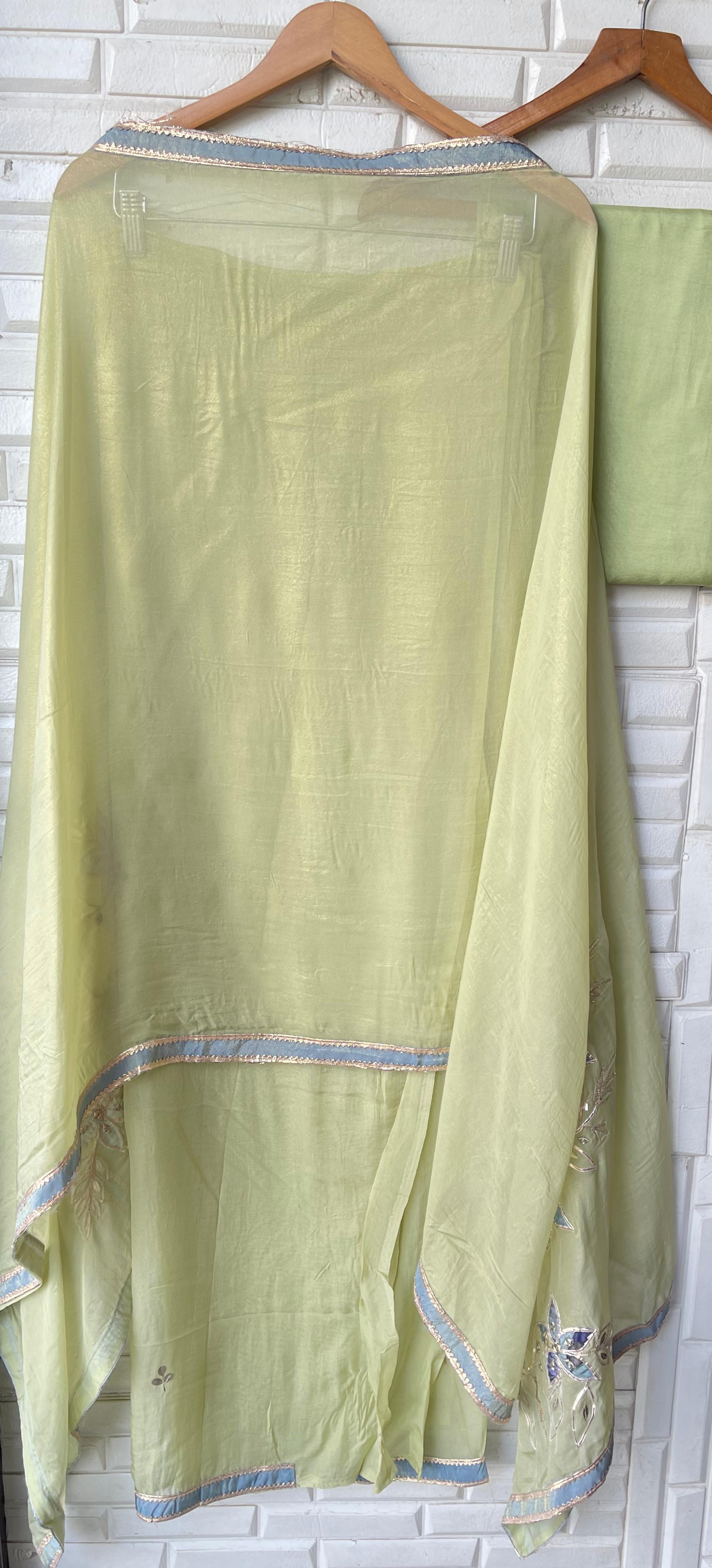 😊 pure shimmer organza printed fabric unstitched shirt with gotta lace mirror work zari leather patchwork embroidery