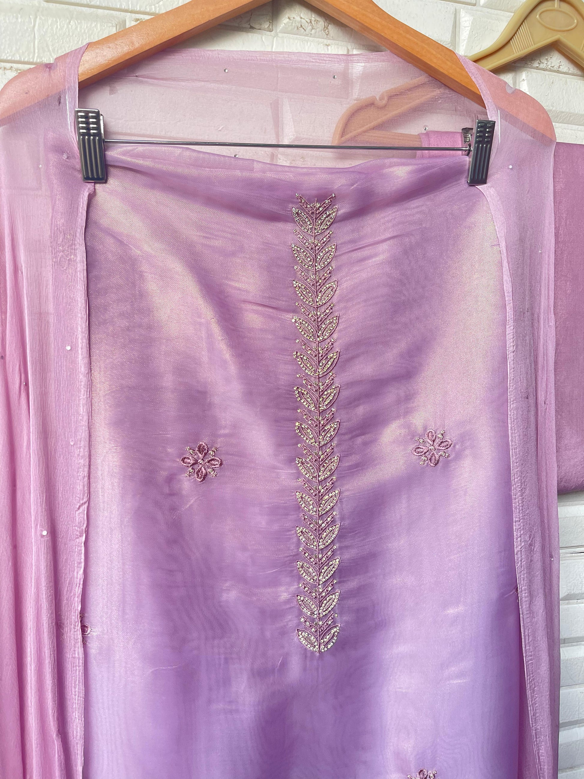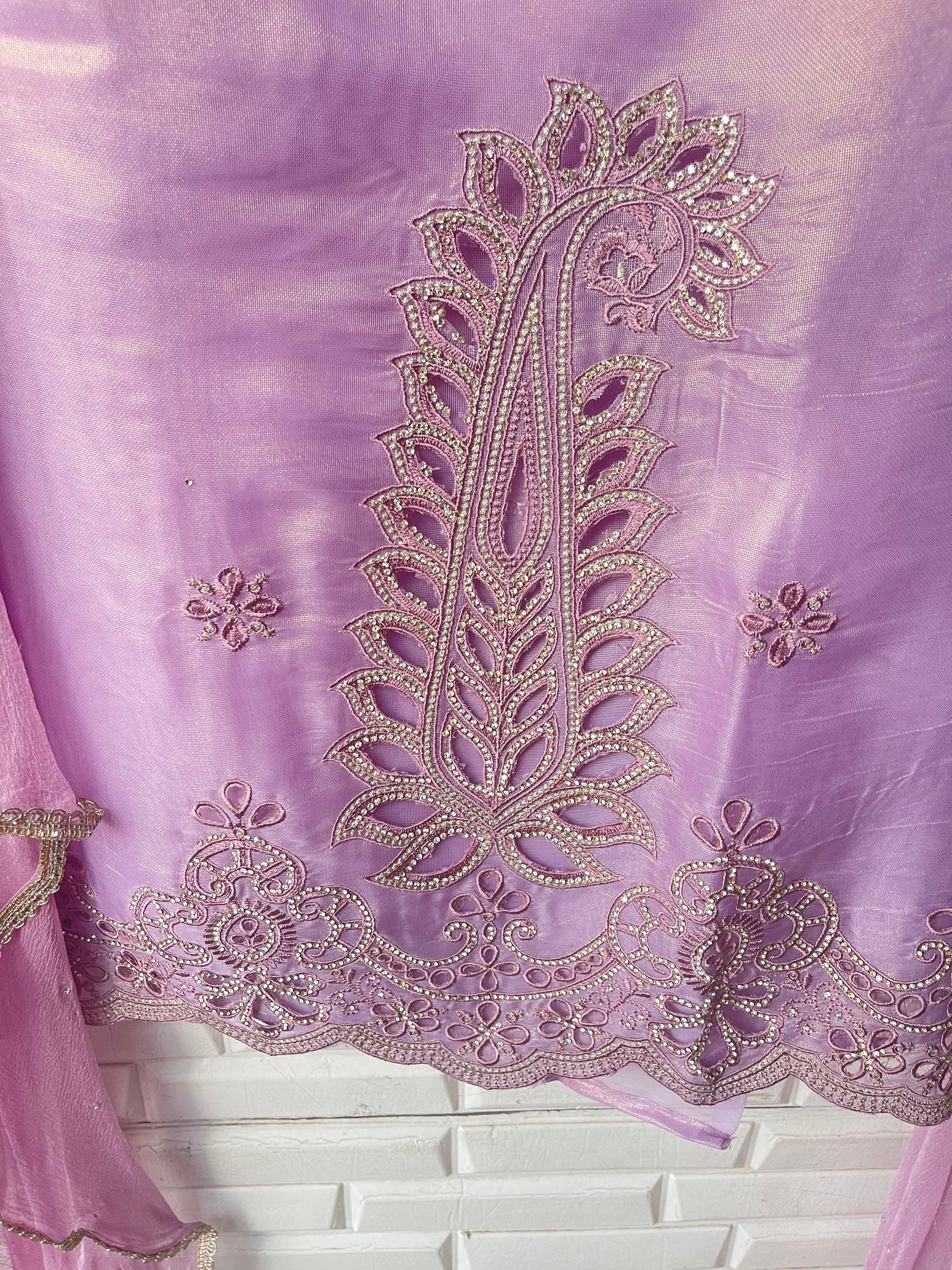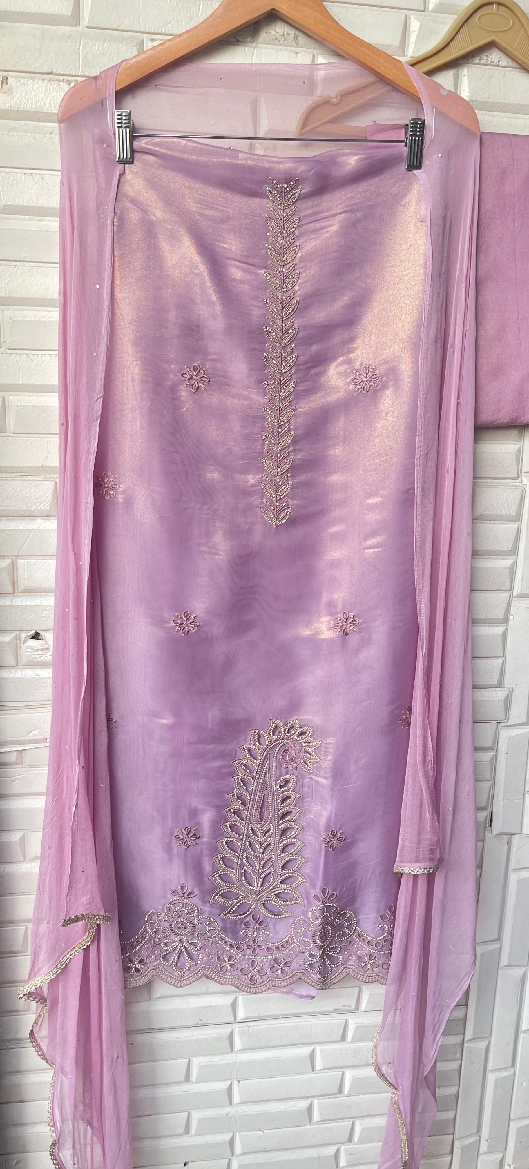 😊 shimmer paper silk fabric unstitched shirt with resham swarowski zari embroidery and appliqué resham cutwork on ghera
