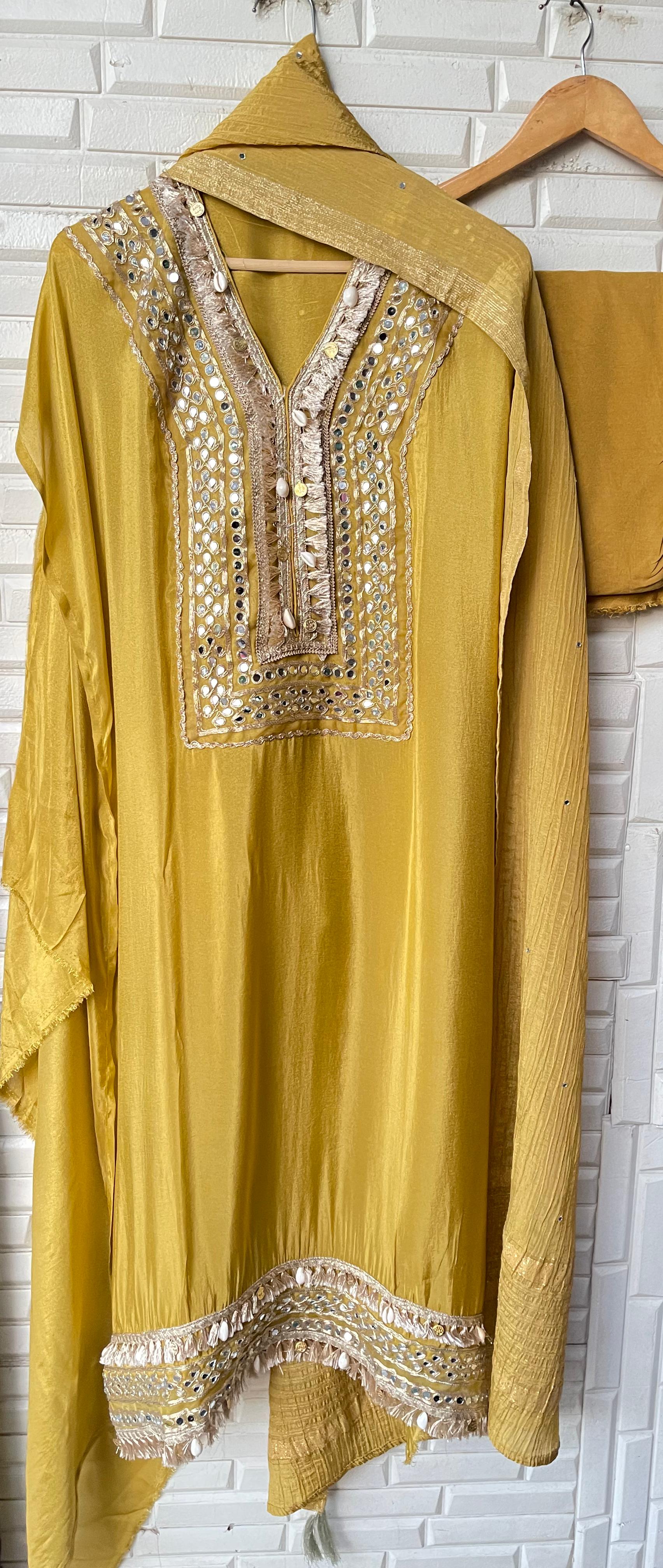 π shimmer silk fabric semi stitched shirt with mirror work zari embroidery and tassel lace and shell hanging lace work