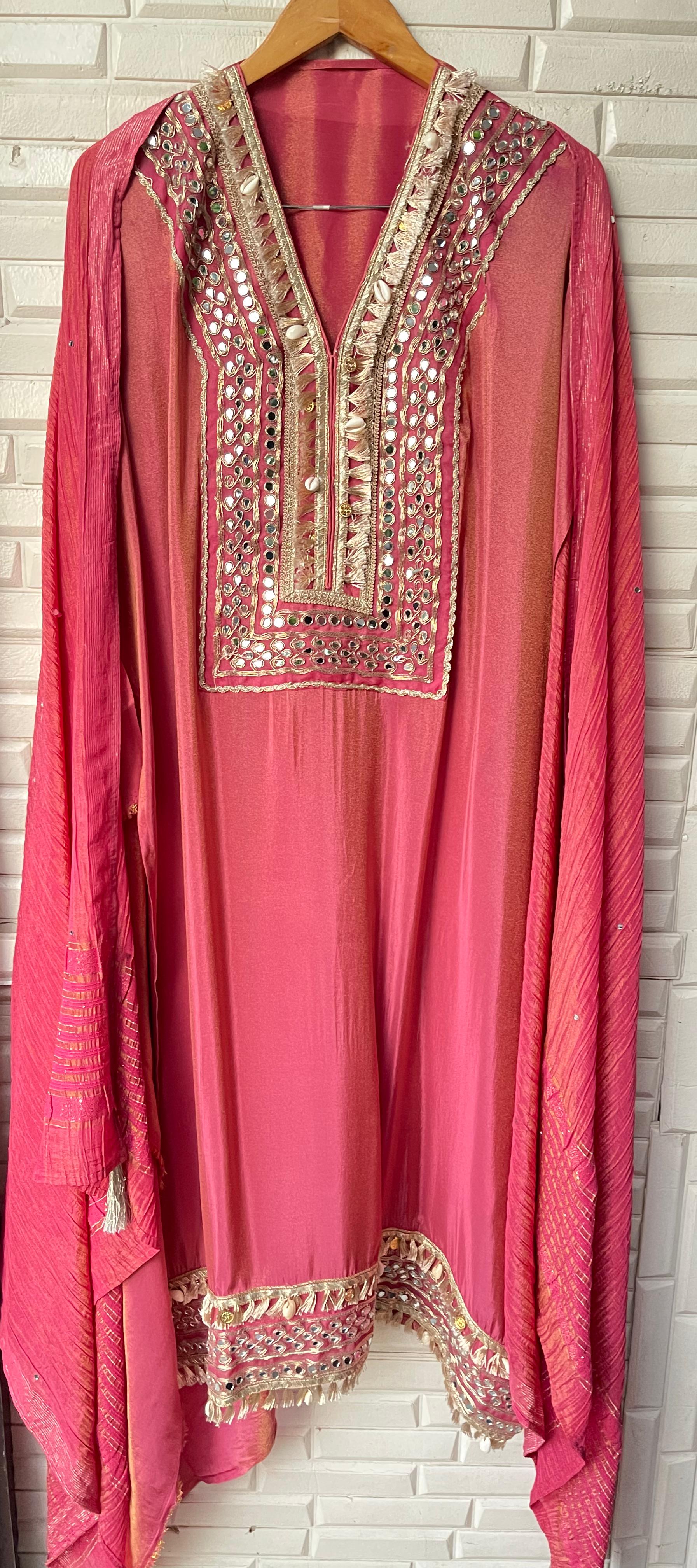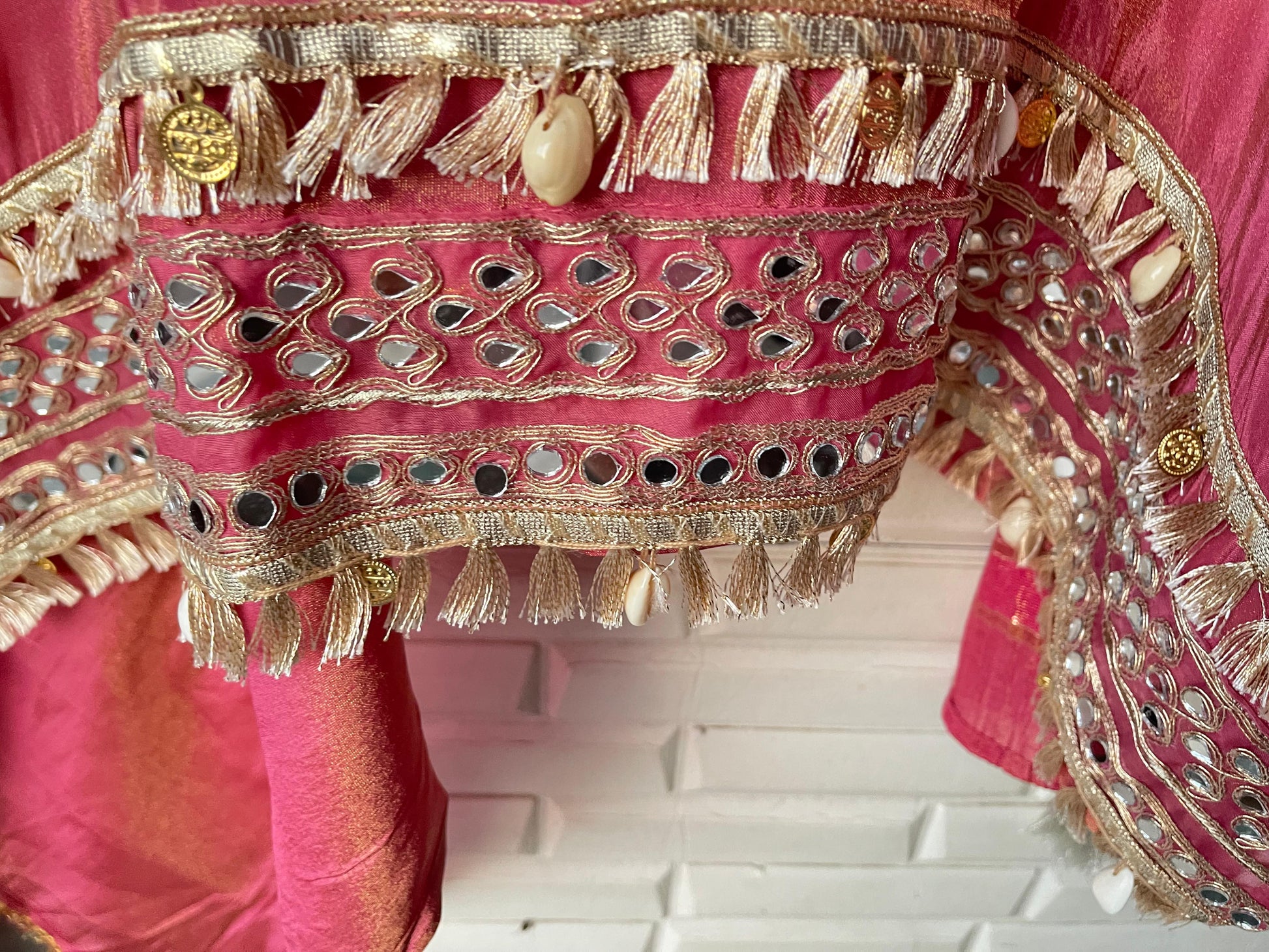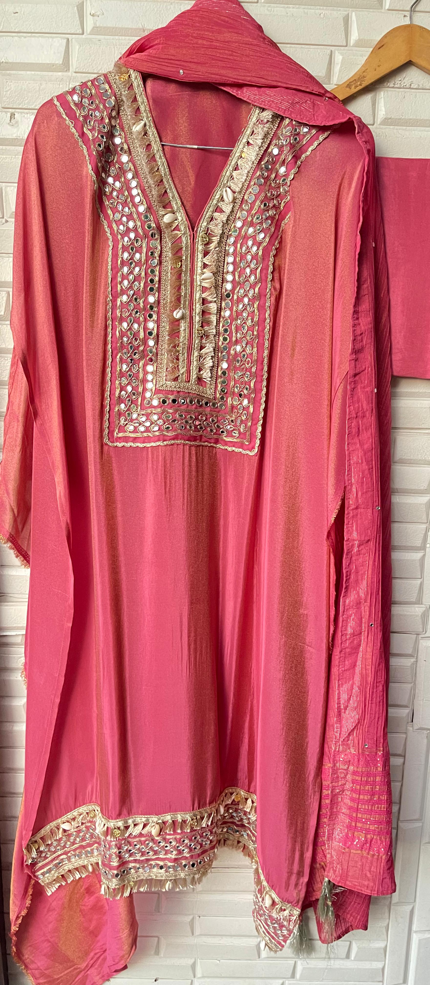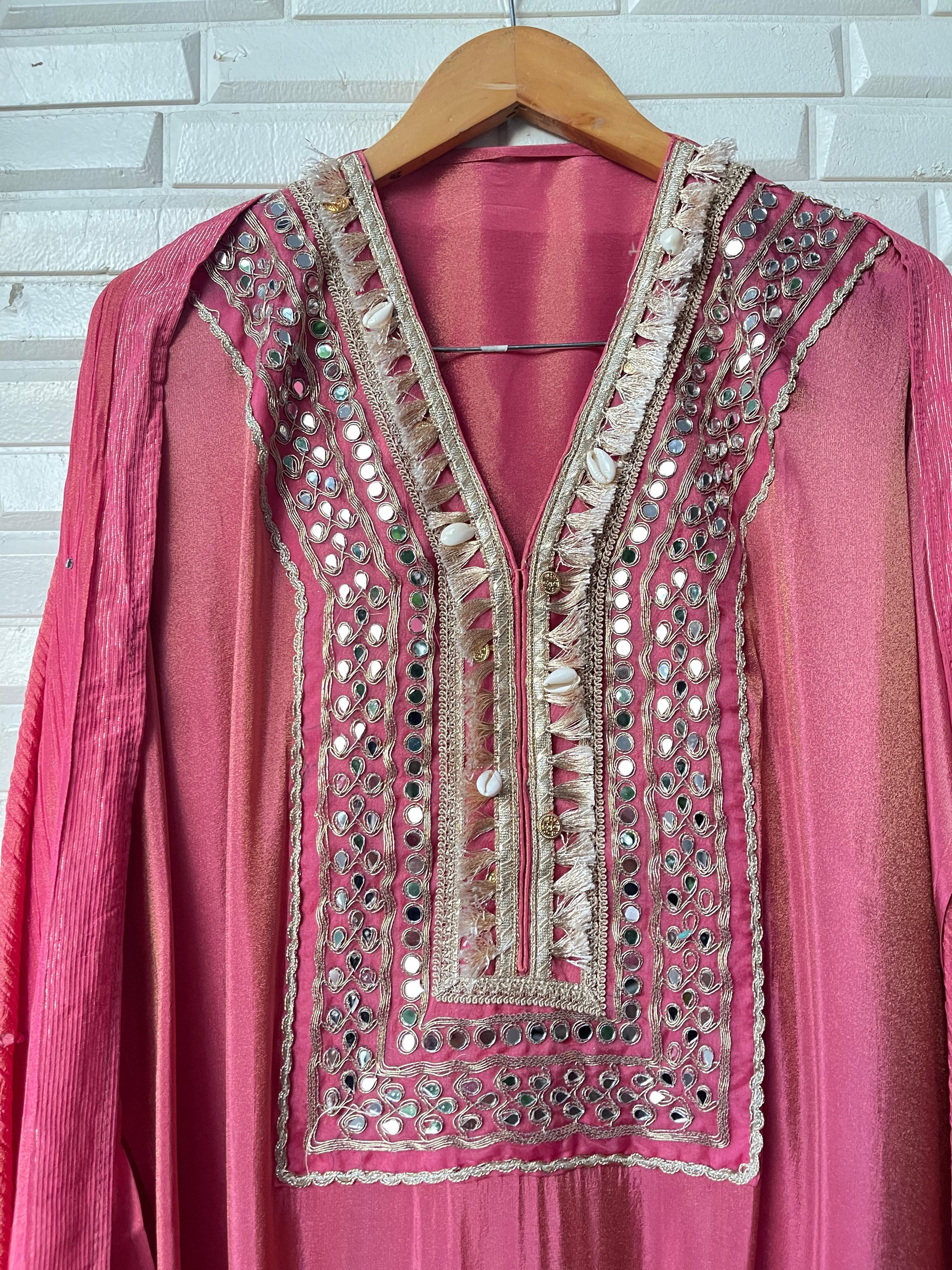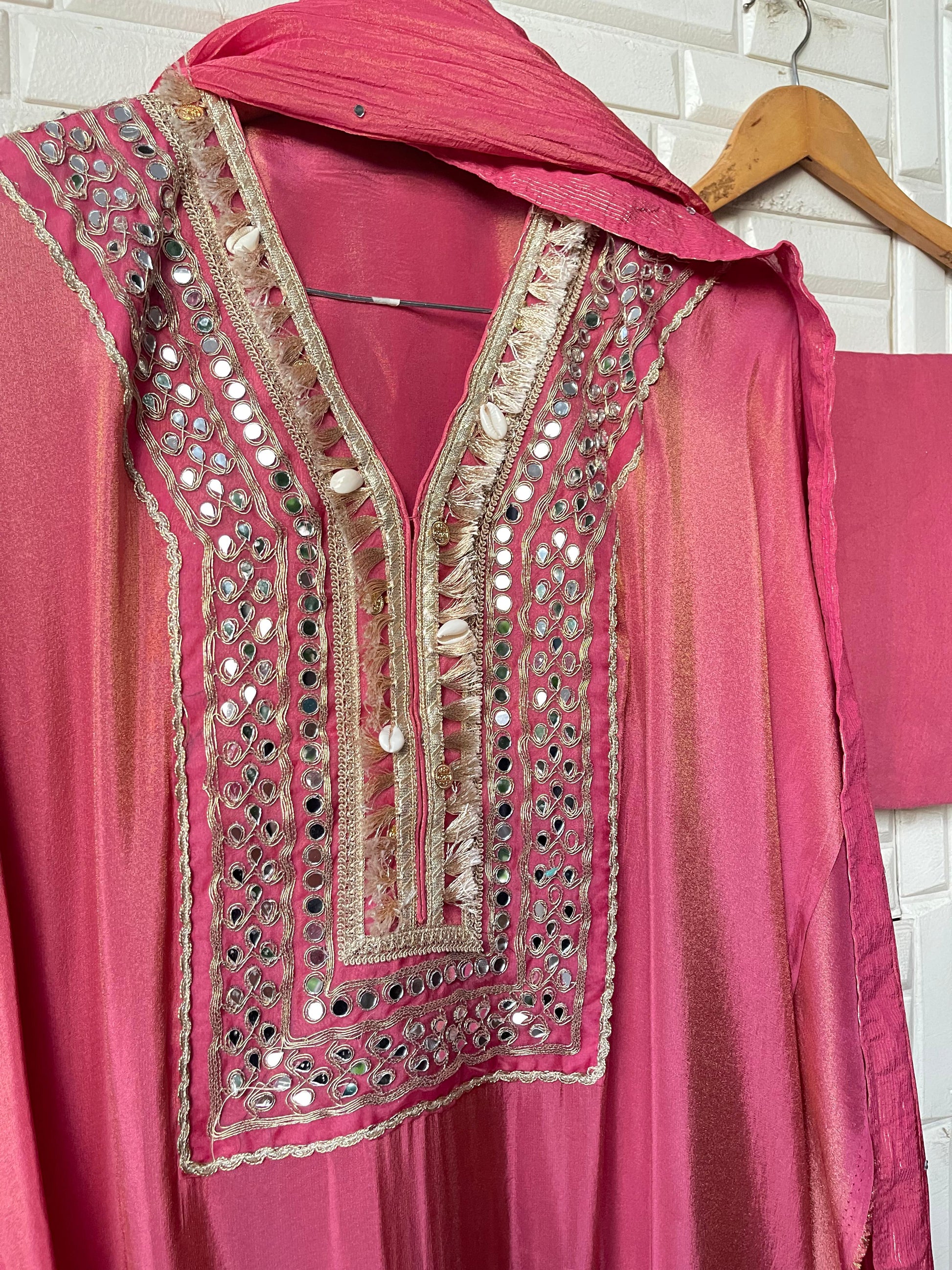 π shimmer silk fabric semi stitched shirt with mirror work zari embroidery and tassel lace and shell hanging lace work