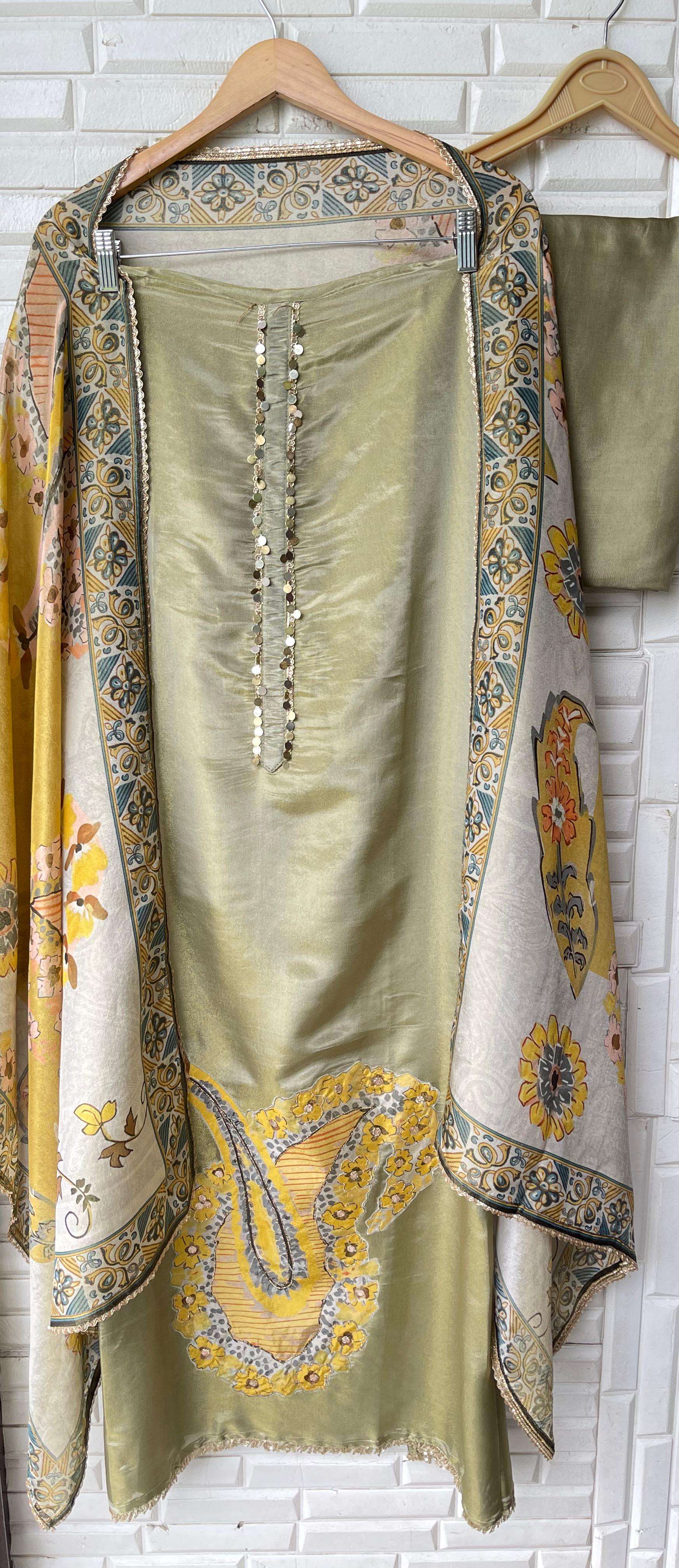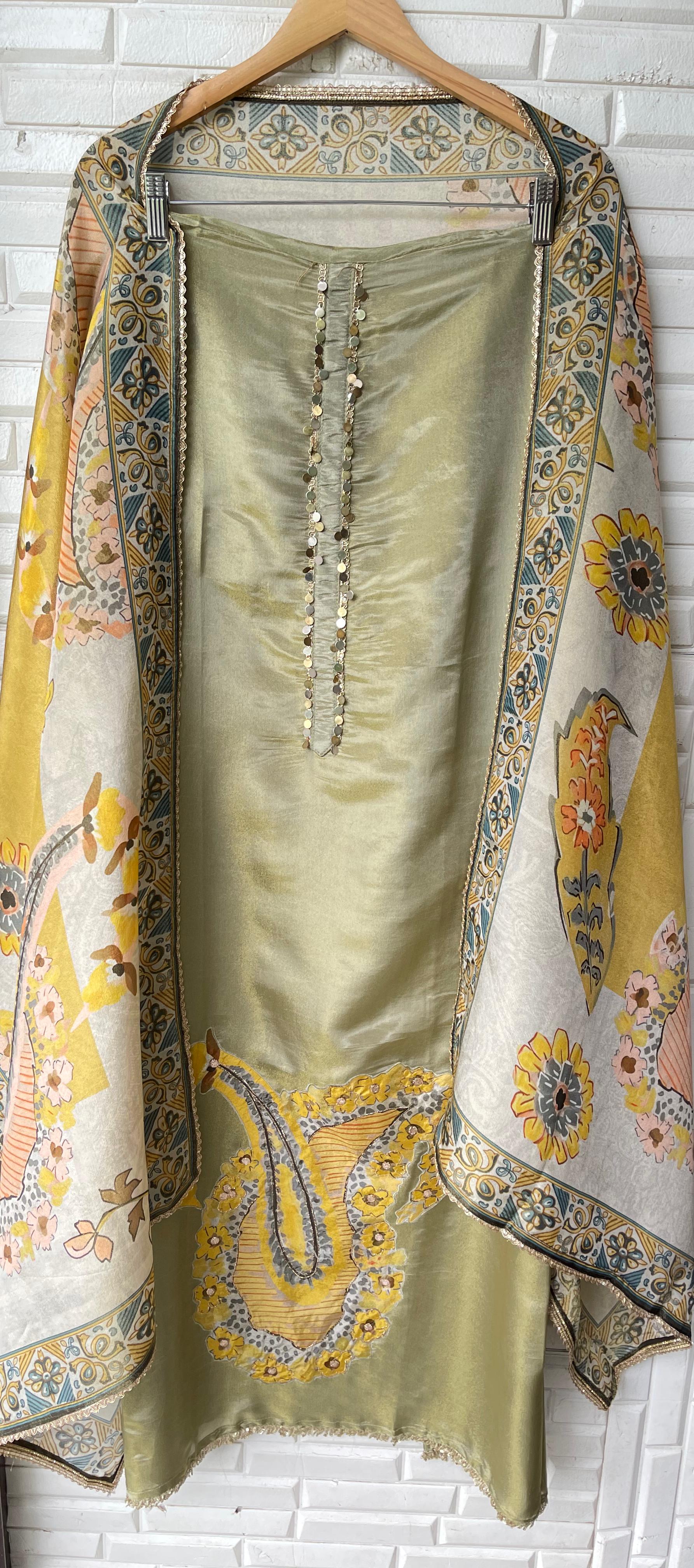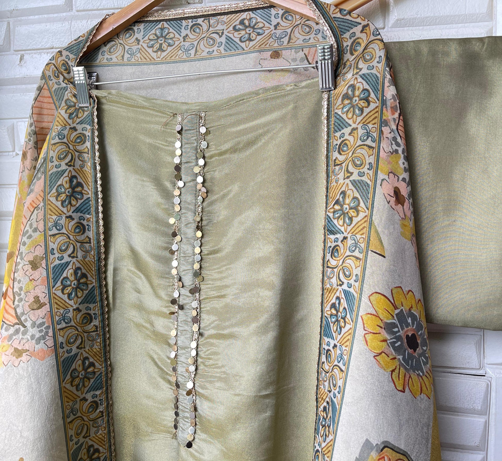 😊 shimmer silk printed fabric unstitched shirt with gotta work zari embroidery