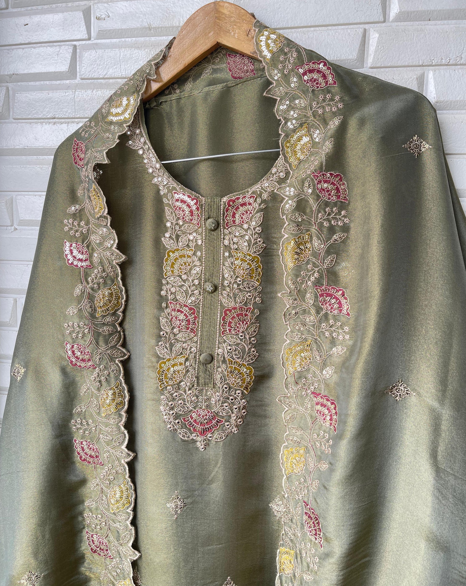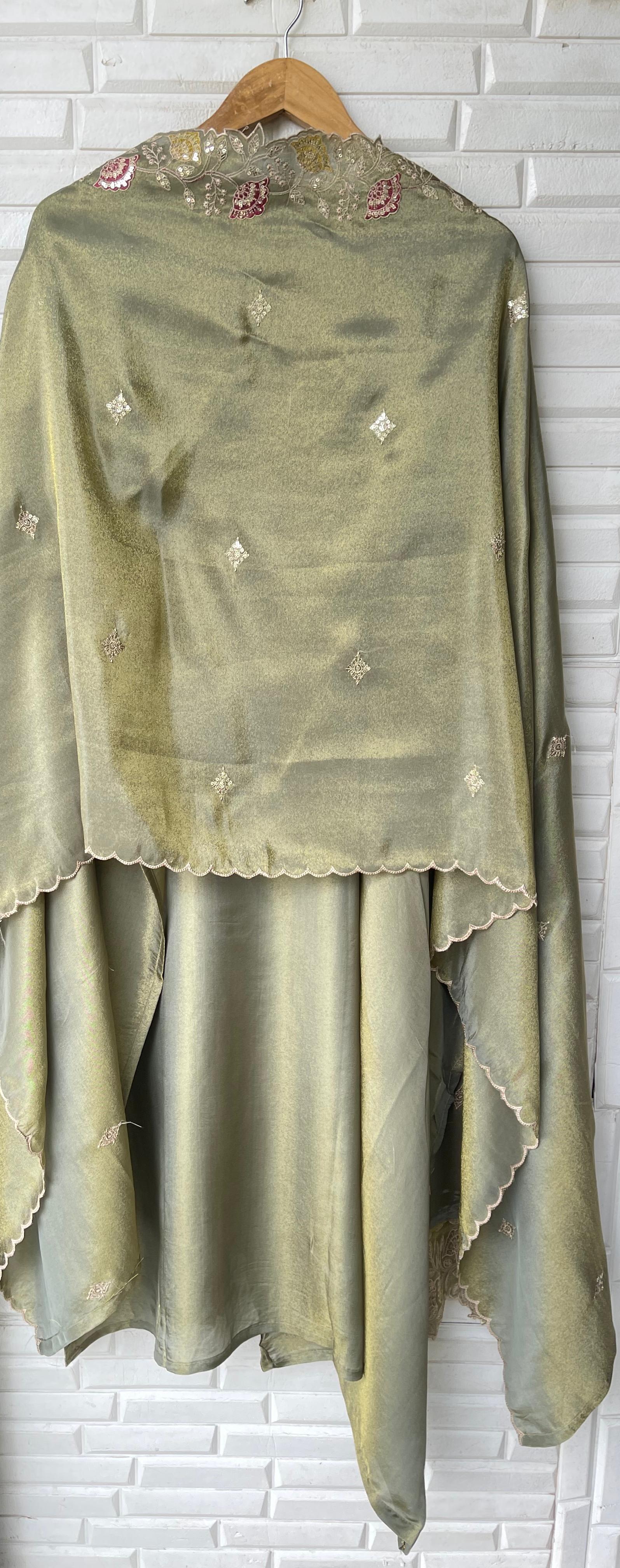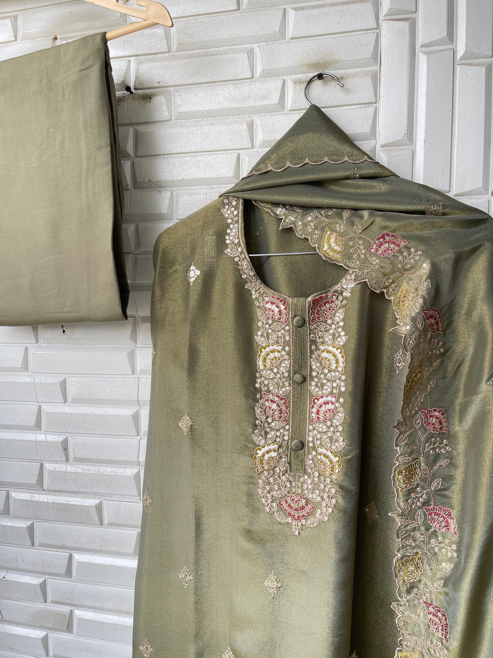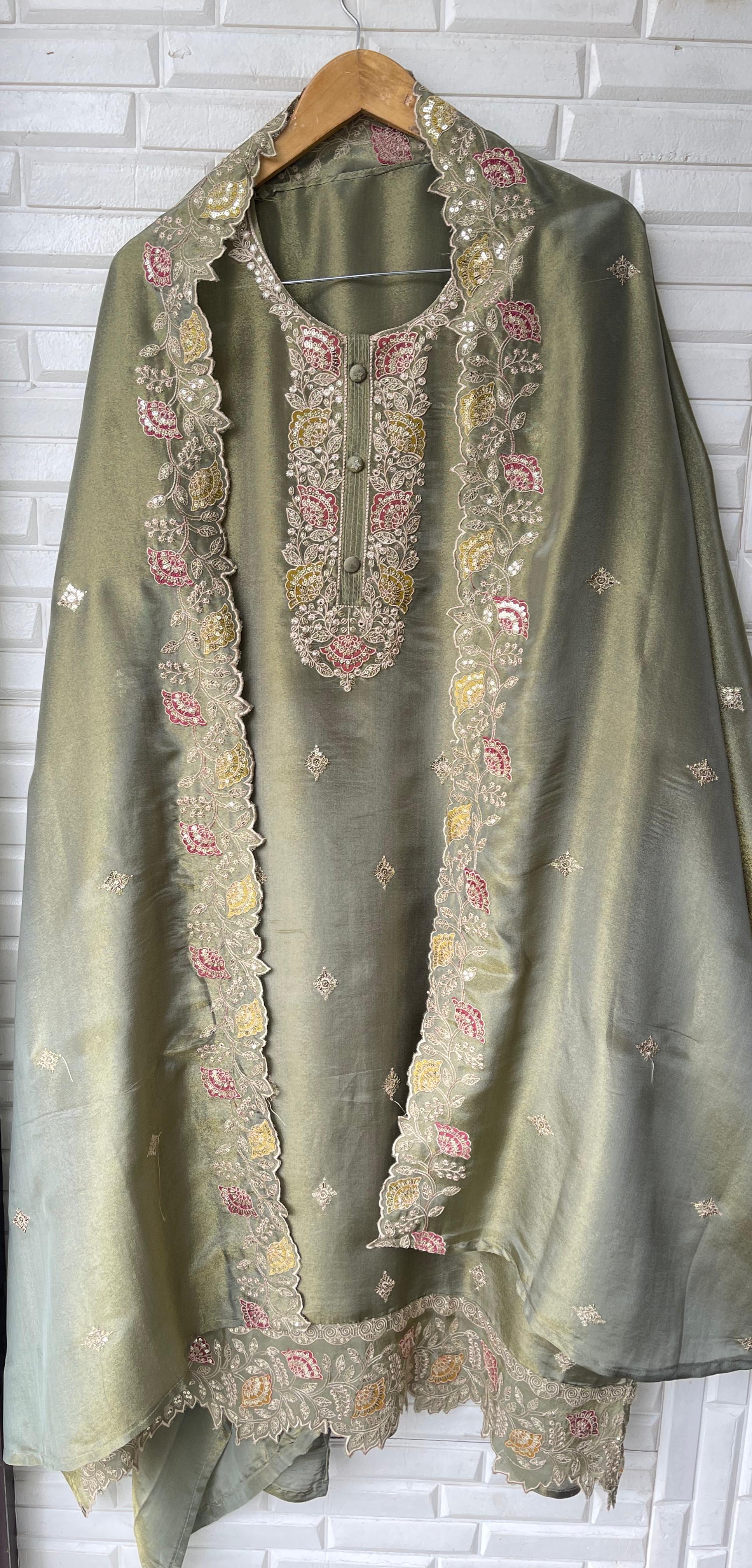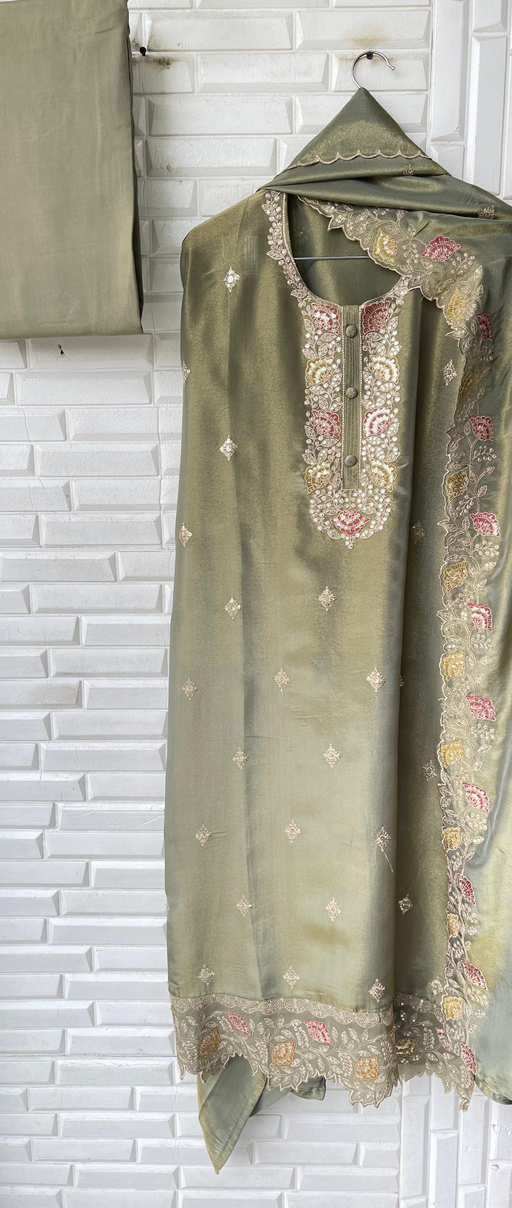 😊 shimmer silk fabric unstitched shirt with sequence resham embroidery