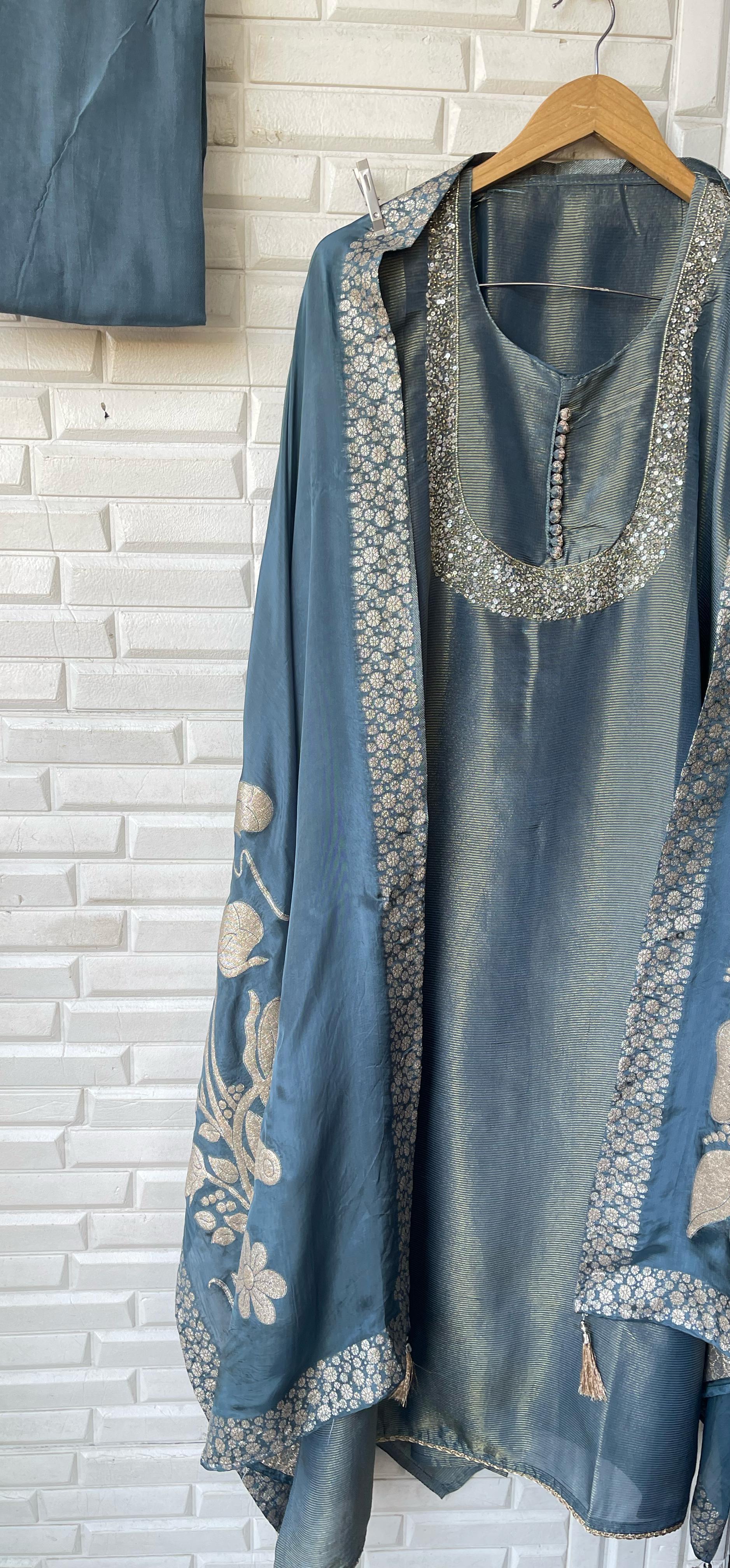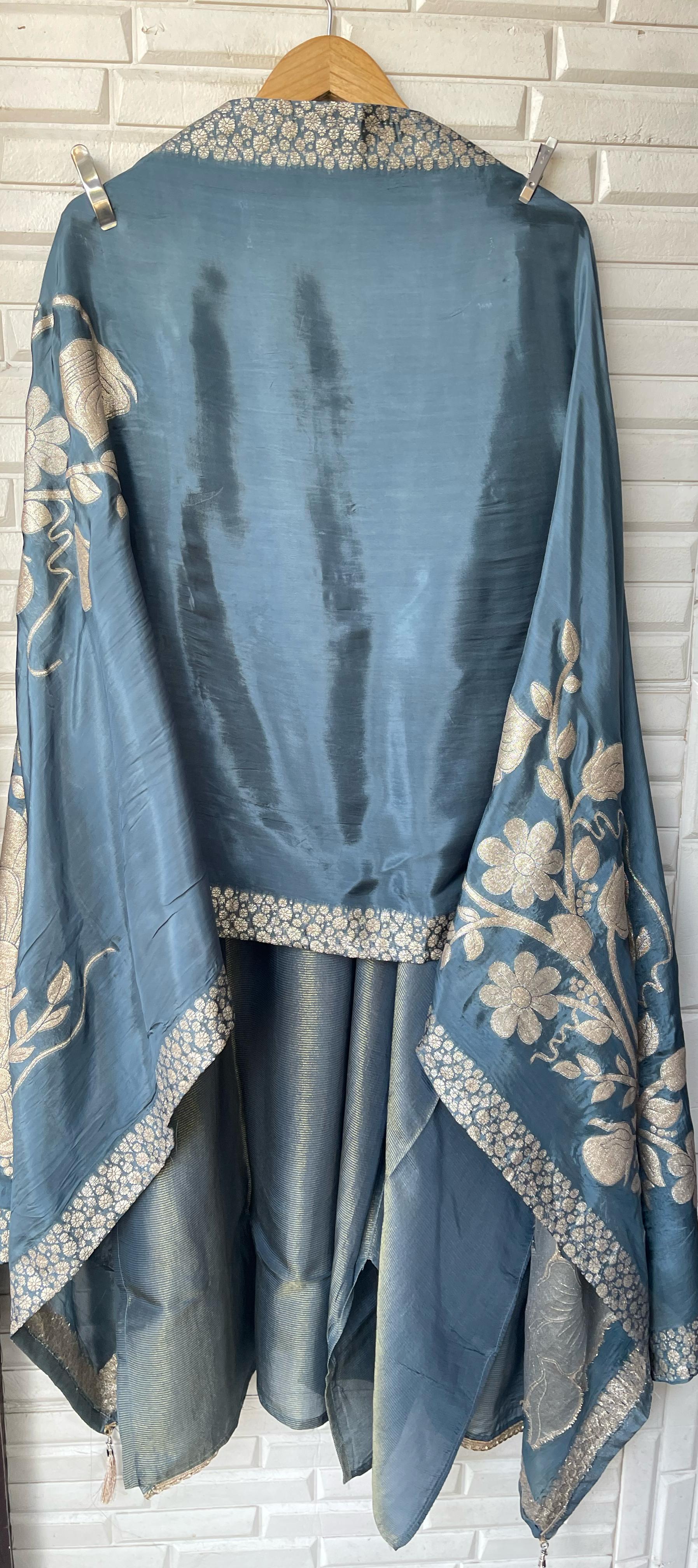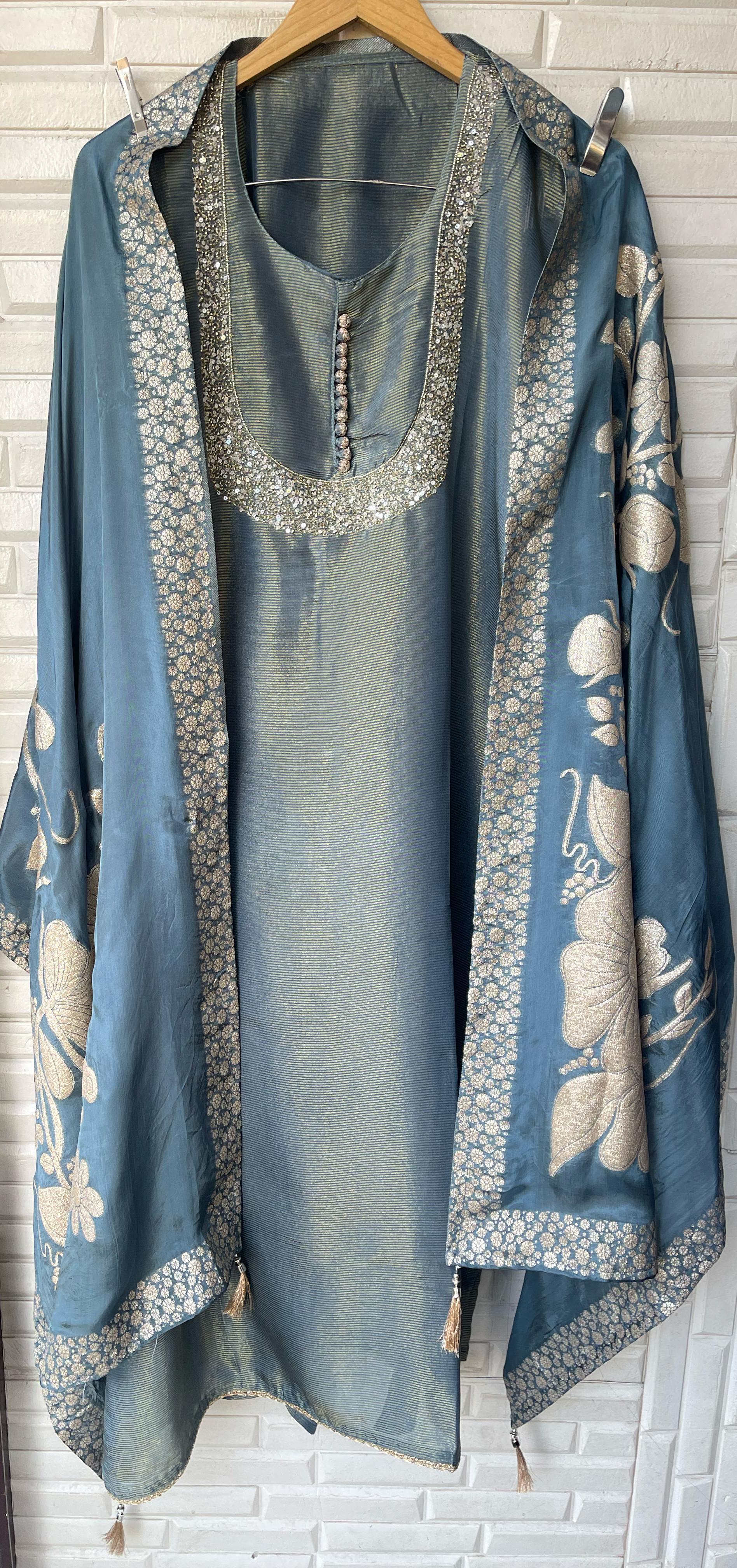 😊 shimmer silk zari weaving fabric unstitched shirt with zari kutdanna pearl embroidery and lace