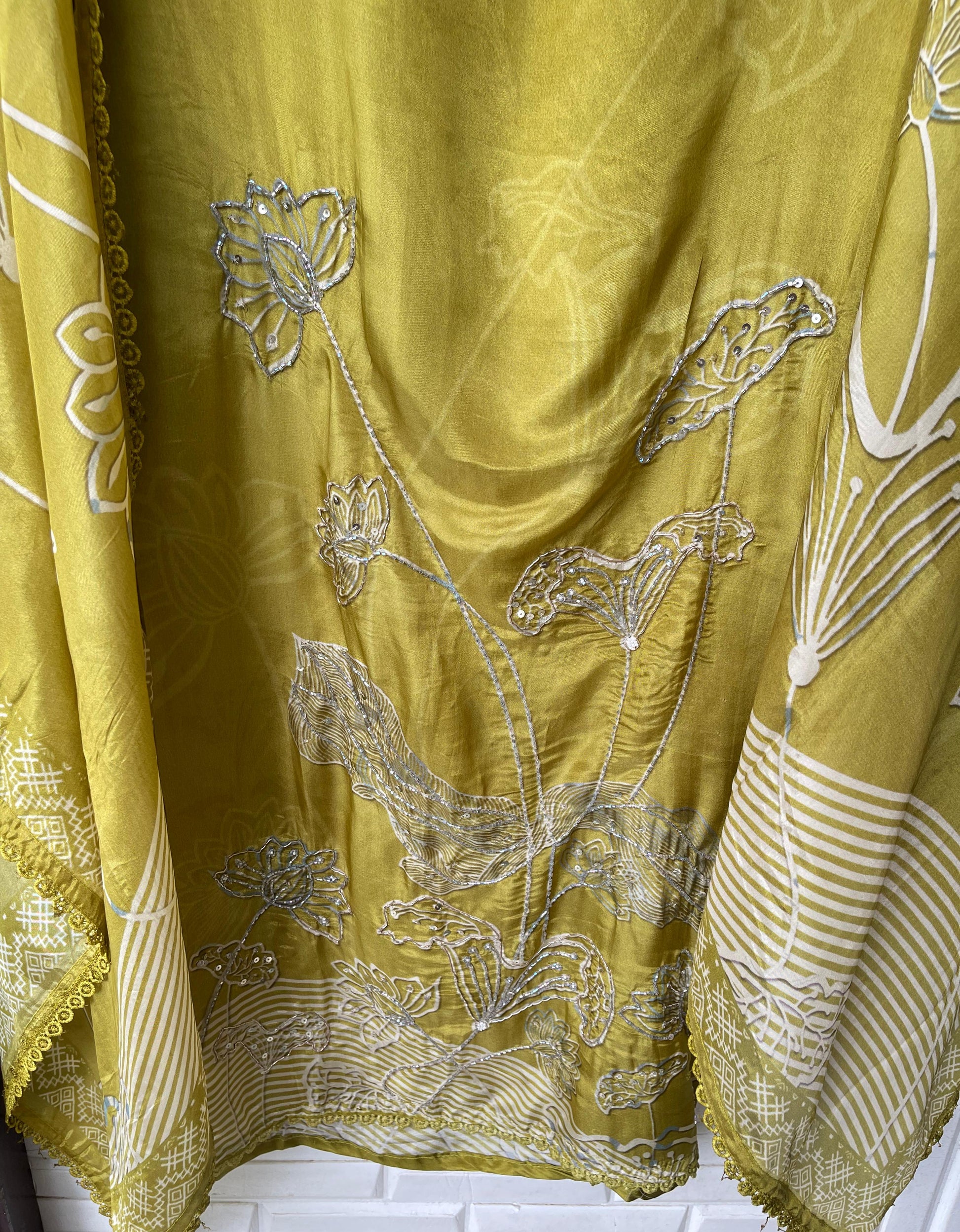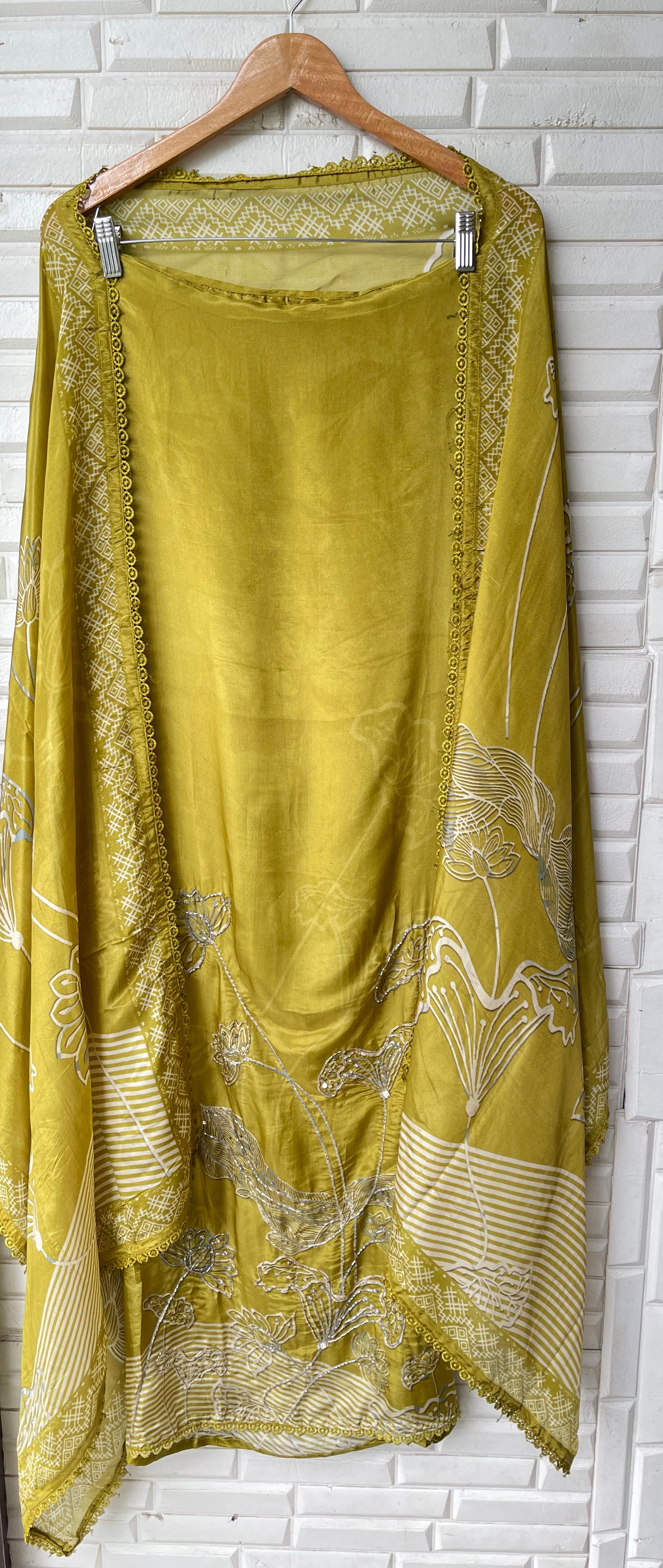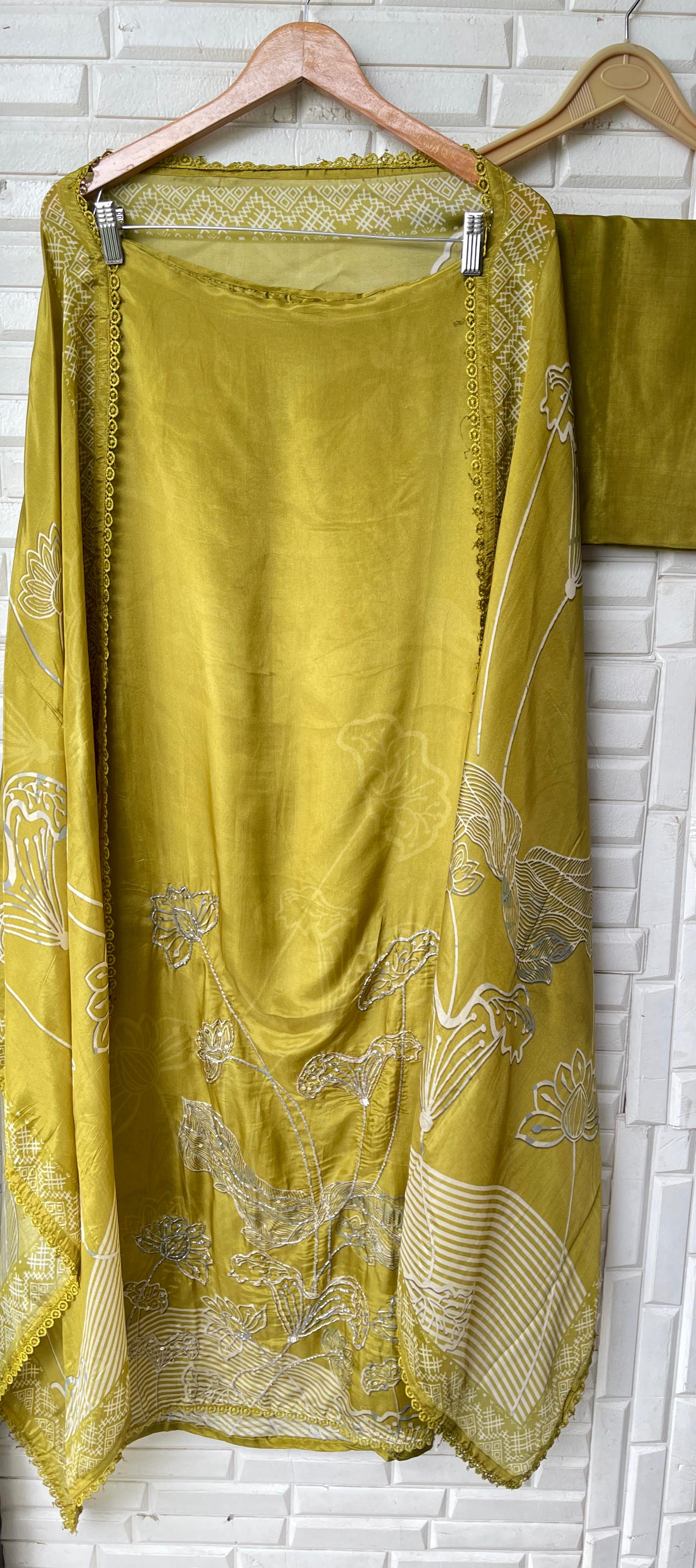 😊shimmer-silk printed fabric unstitched shirt with sequence kutdanna embroidery