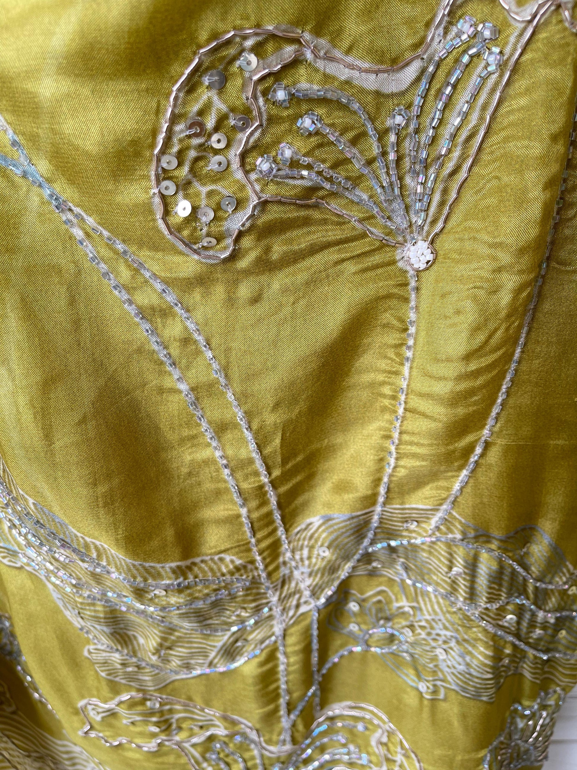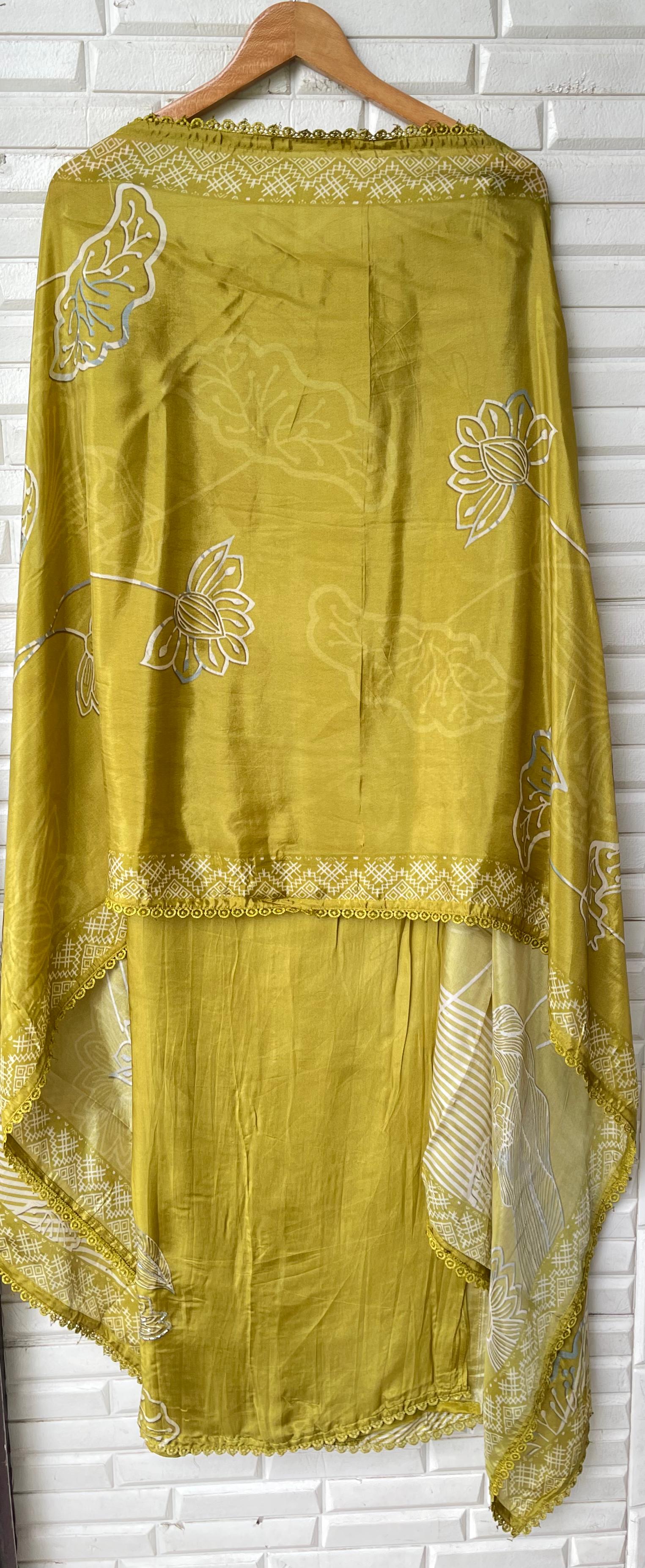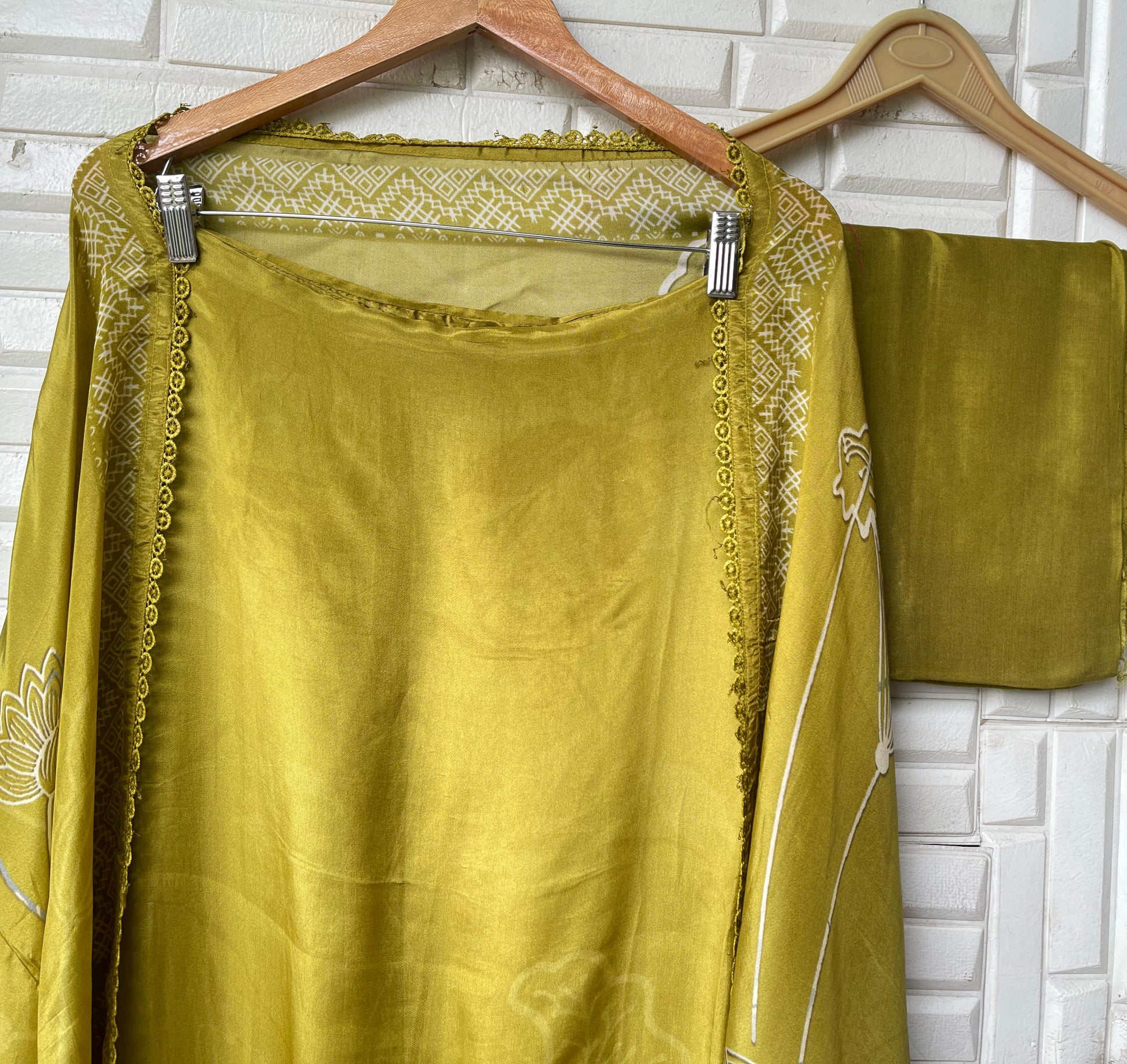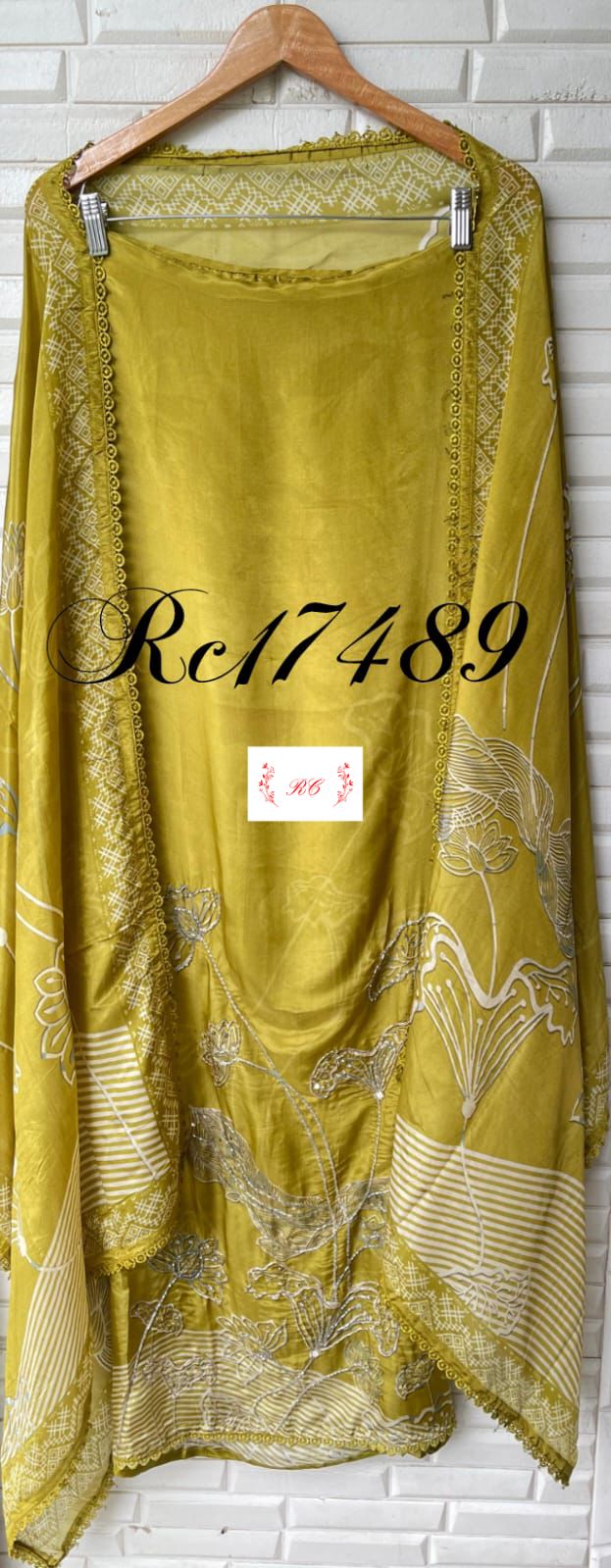 😊shimmer-silk printed fabric unstitched shirt with sequence kutdanna embroidery