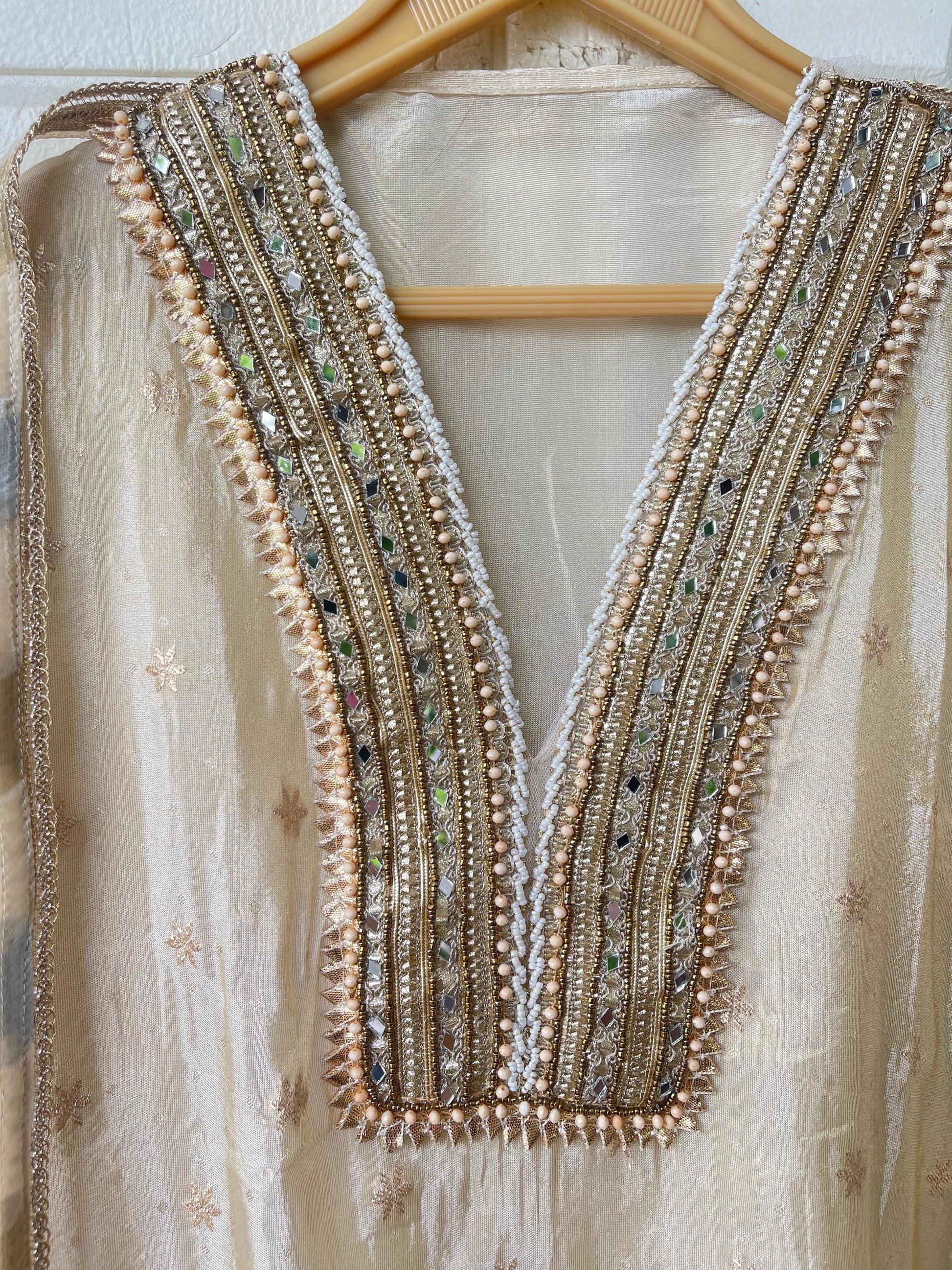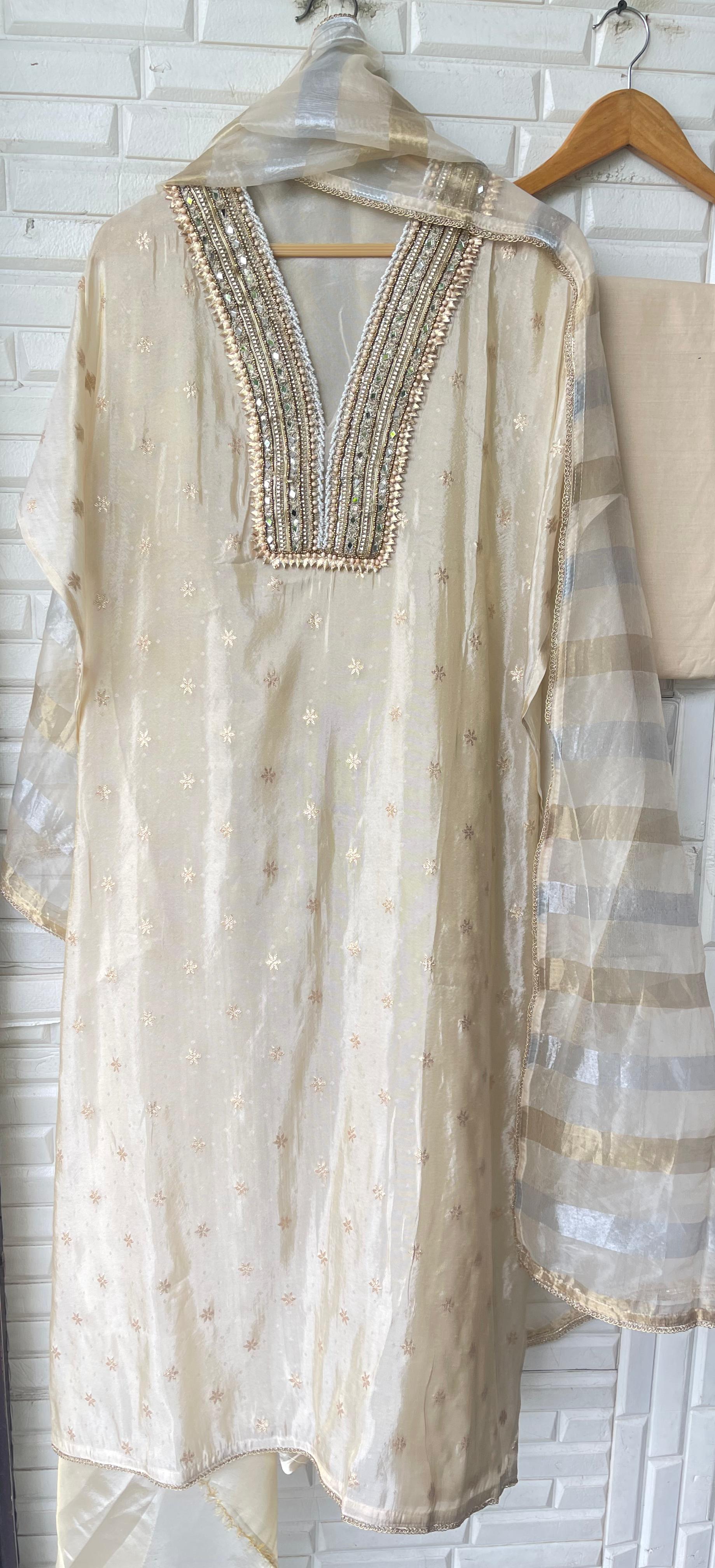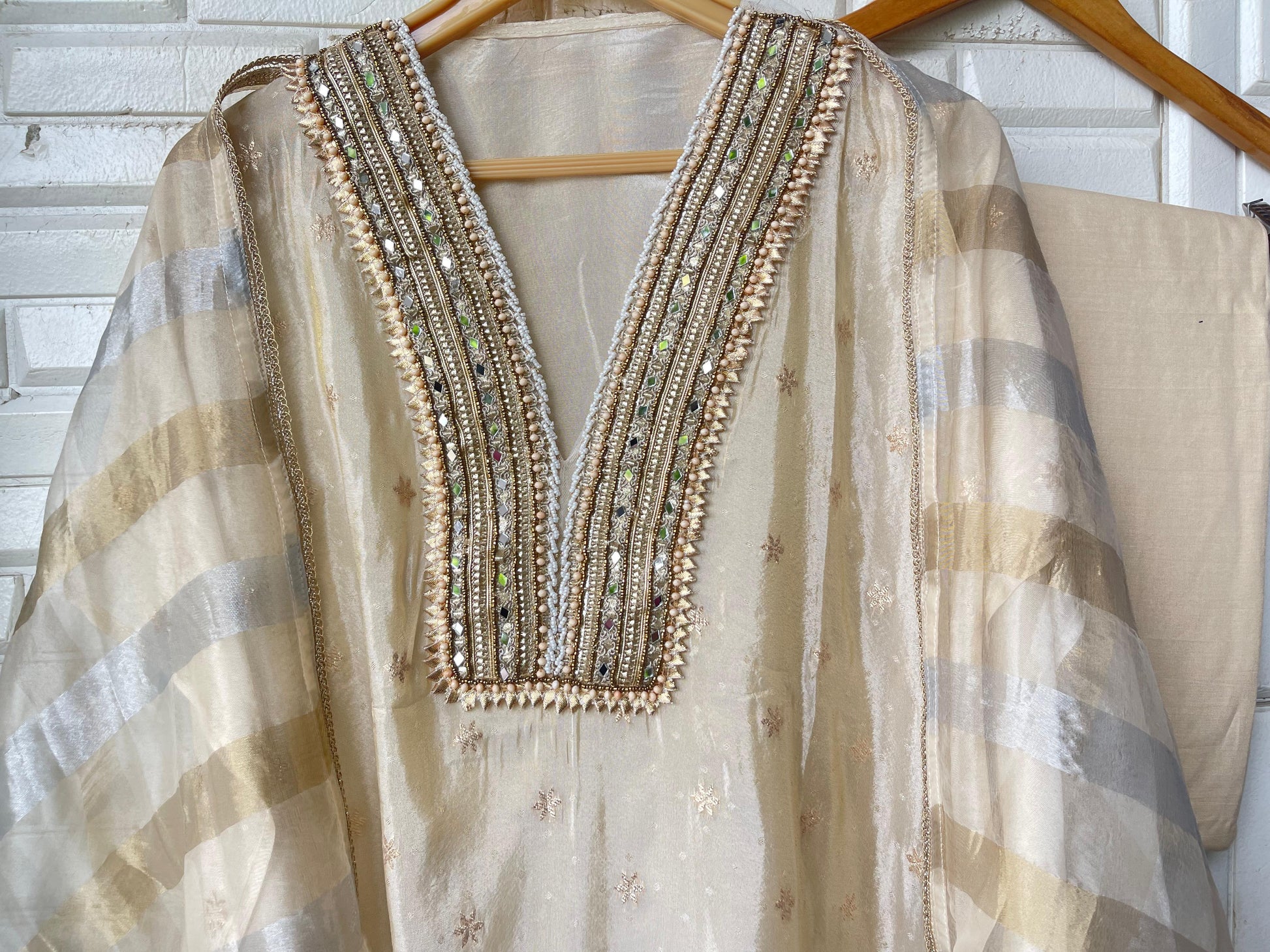 π banarasi shimmer silk fabric unstitched shirt with mirror sequence pearl zari neck lace