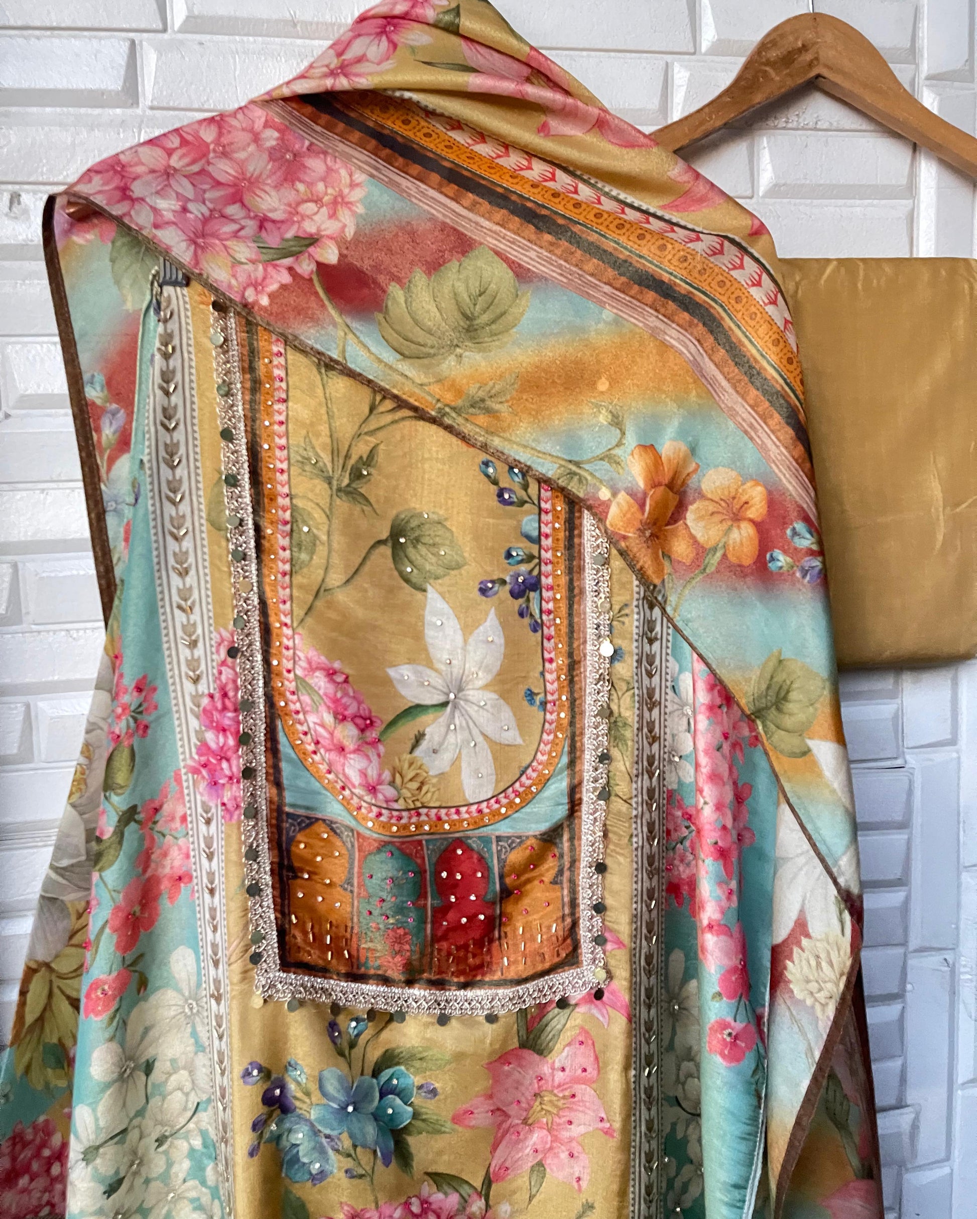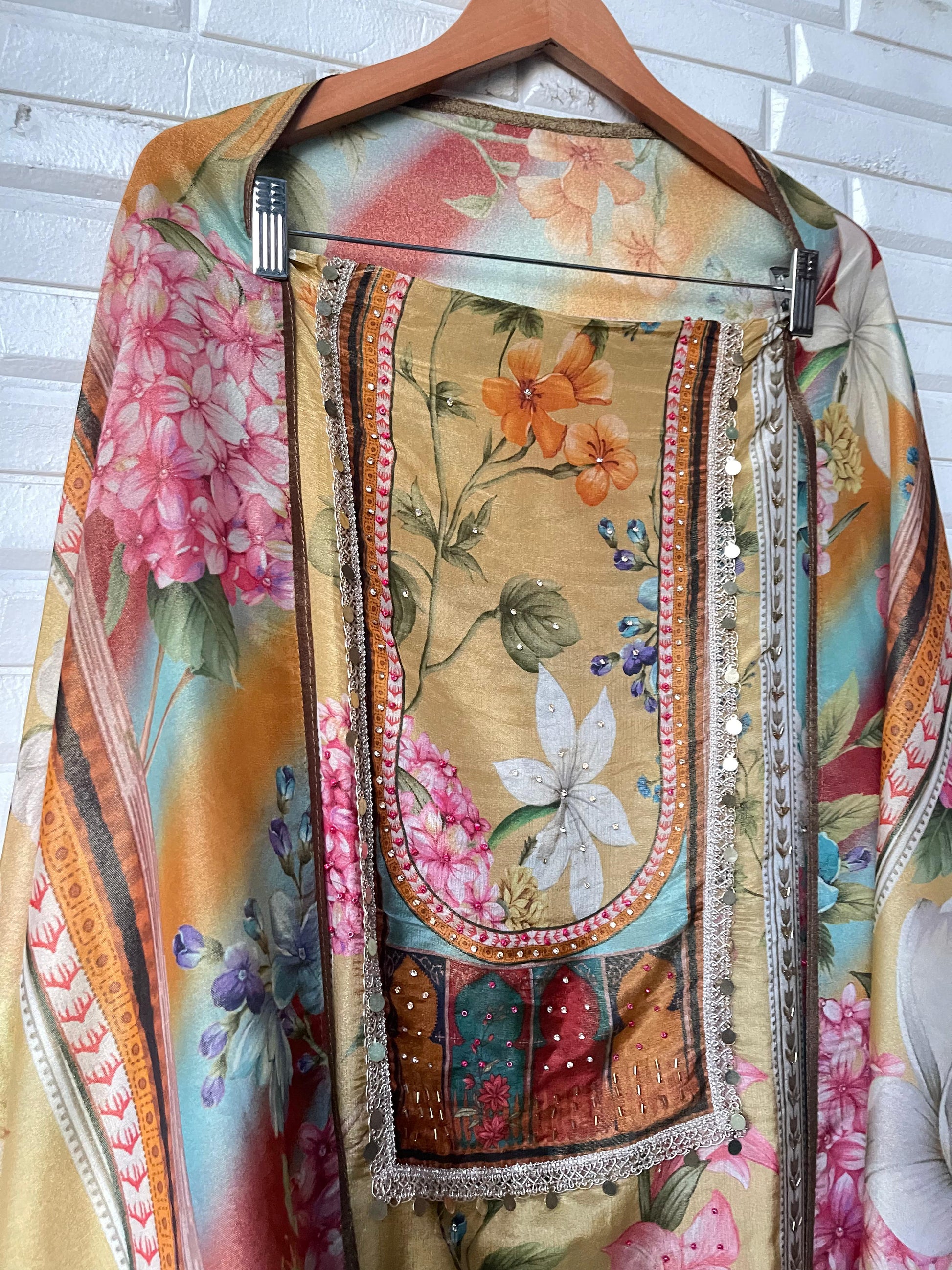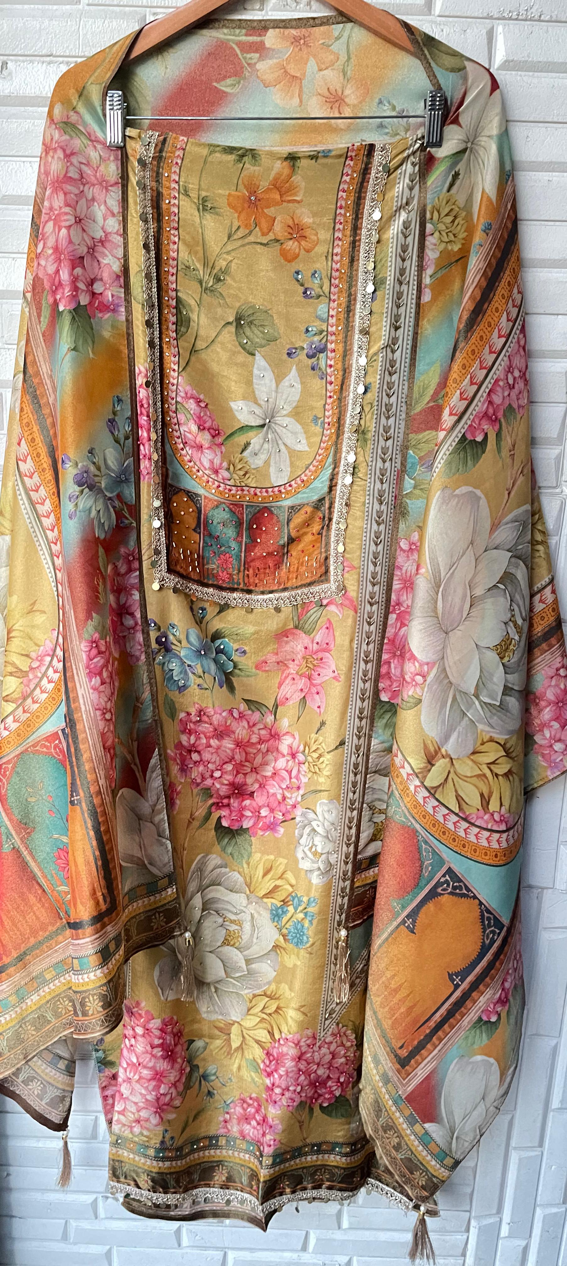 😊 shimmer silk printed fabric unstitched shirt with zari lace on yoke with coin hanging and pearl swarowski kutdanna embroidery