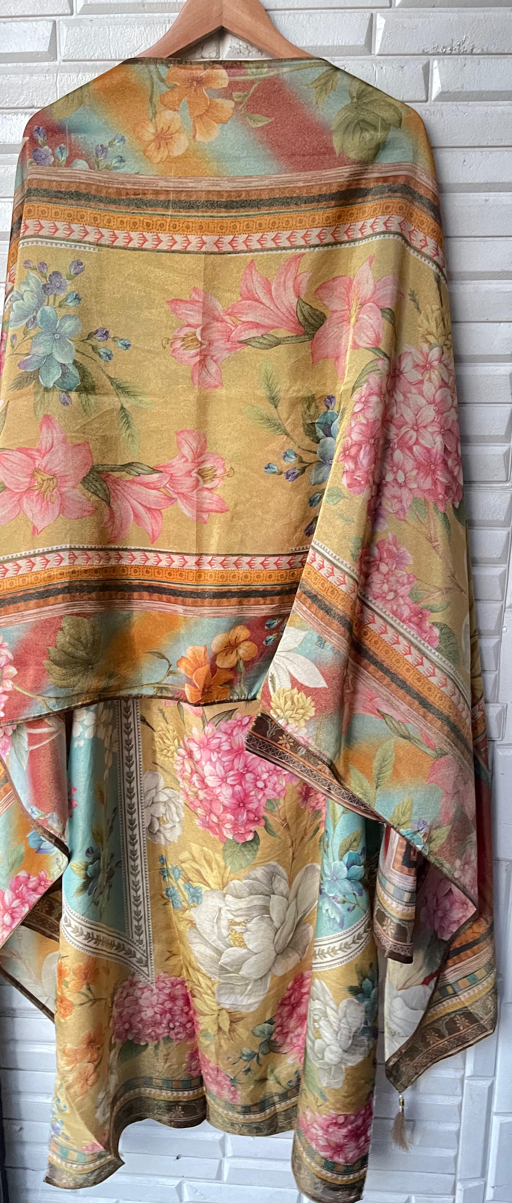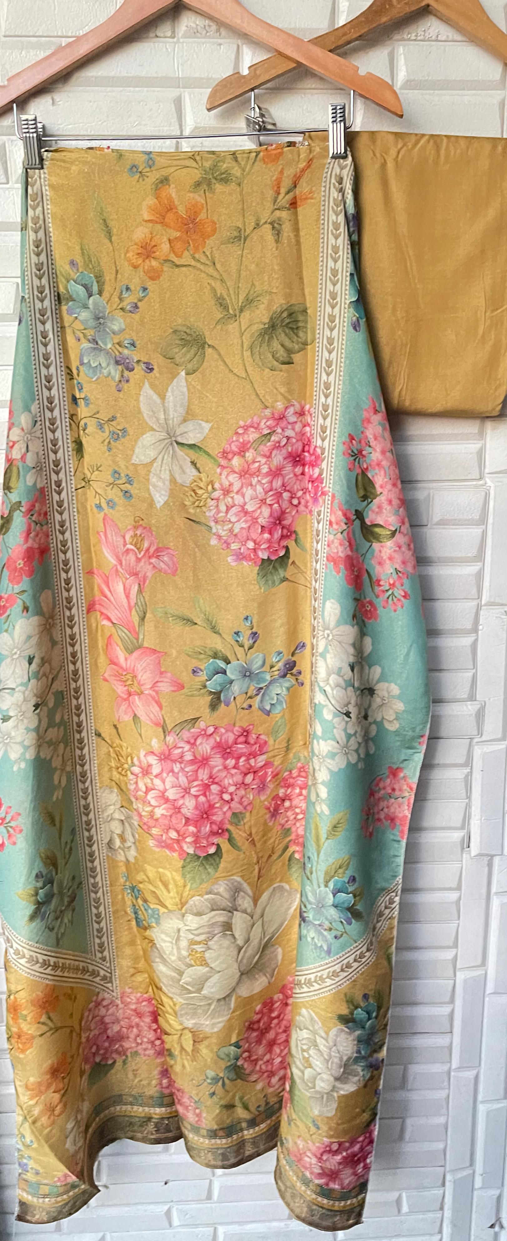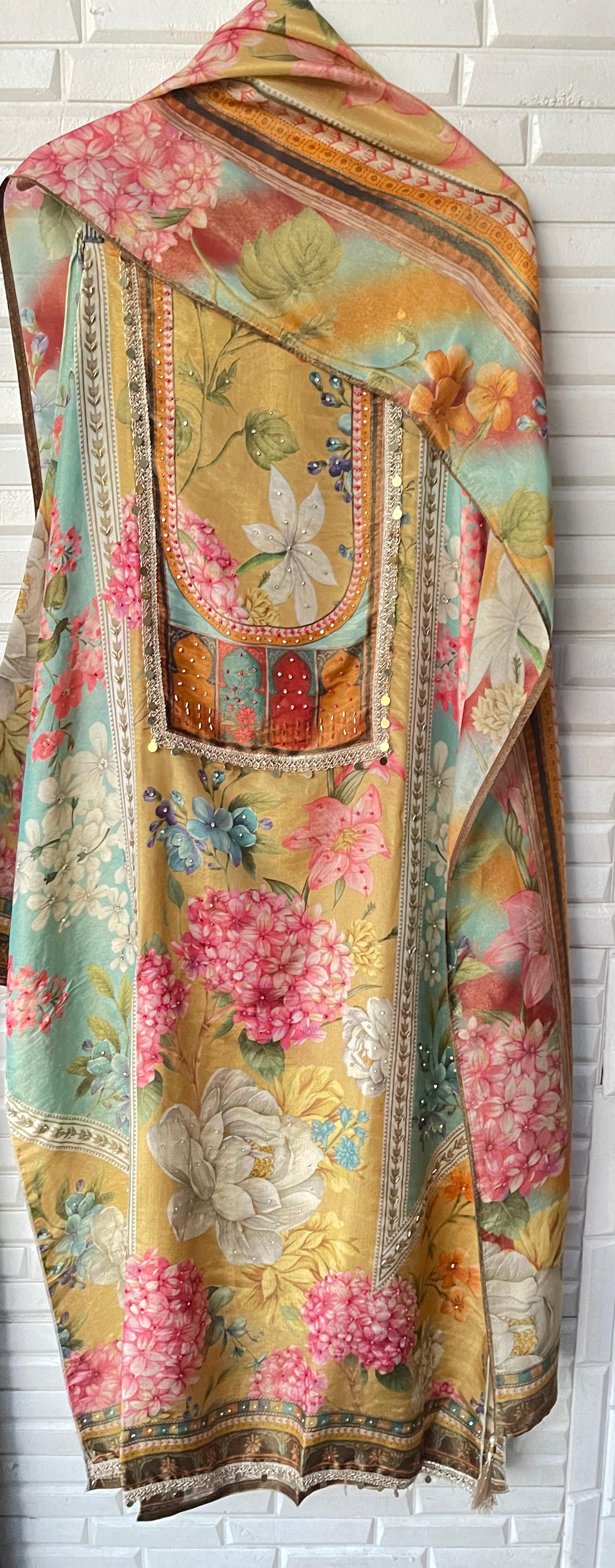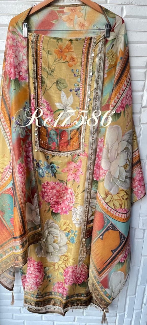 😊 shimmer silk printed fabric unstitched shirt with zari lace on yoke with coin hanging and pearl swarowski kutdanna embroidery