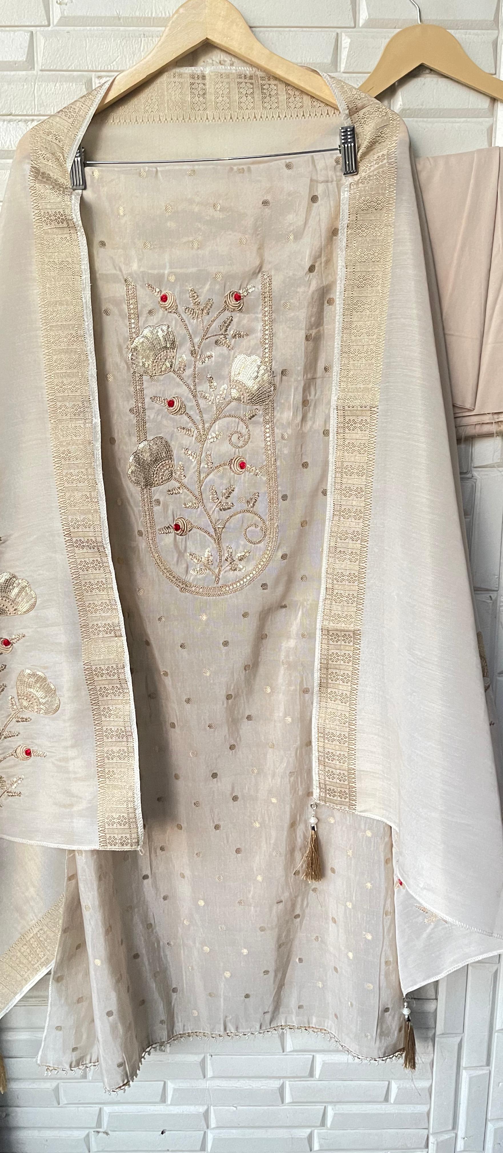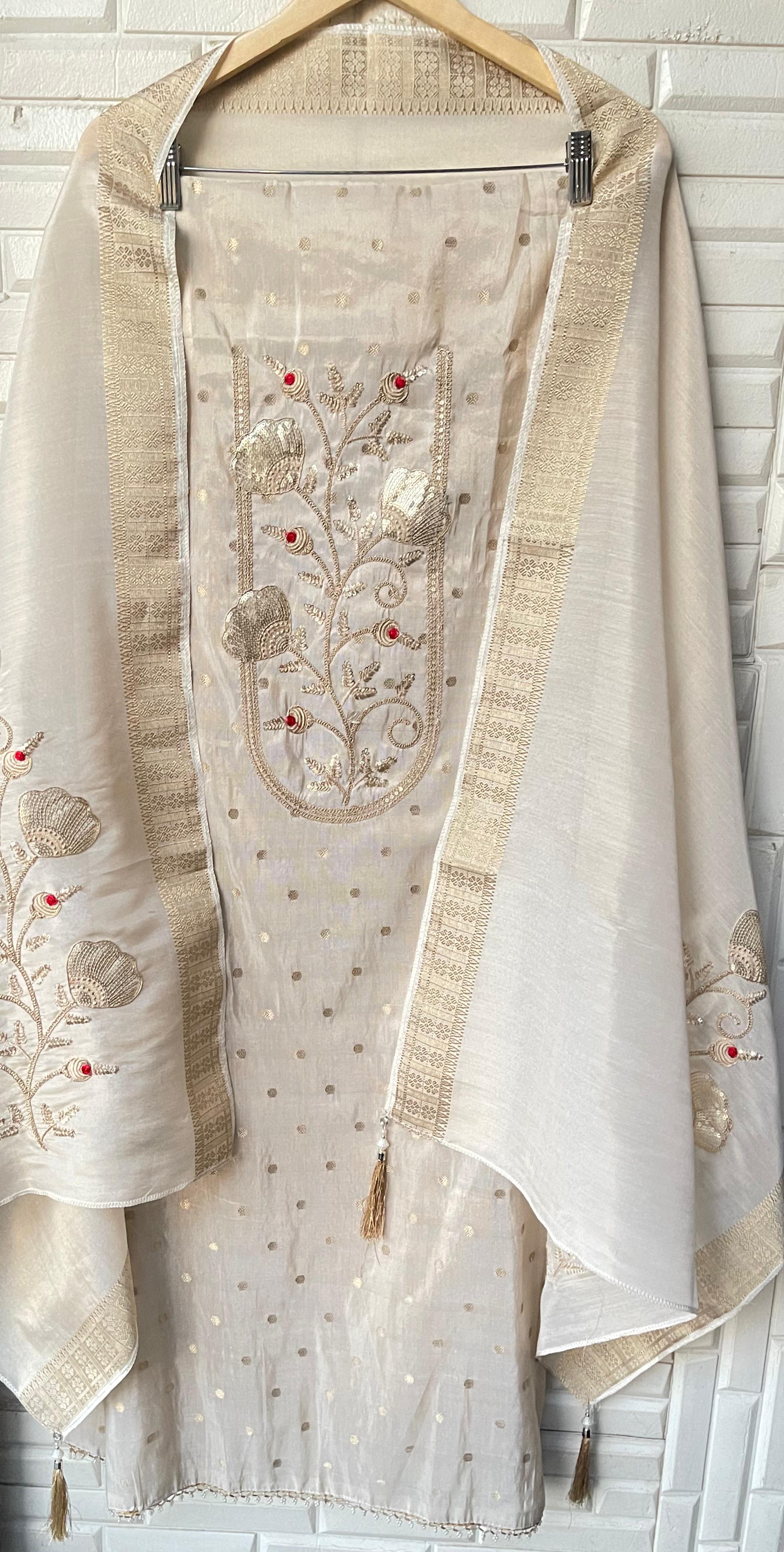 😊 banarasi shimmer silk printed fabric unstitched shirt with zari sequence Resham patchwork and resham embroidery