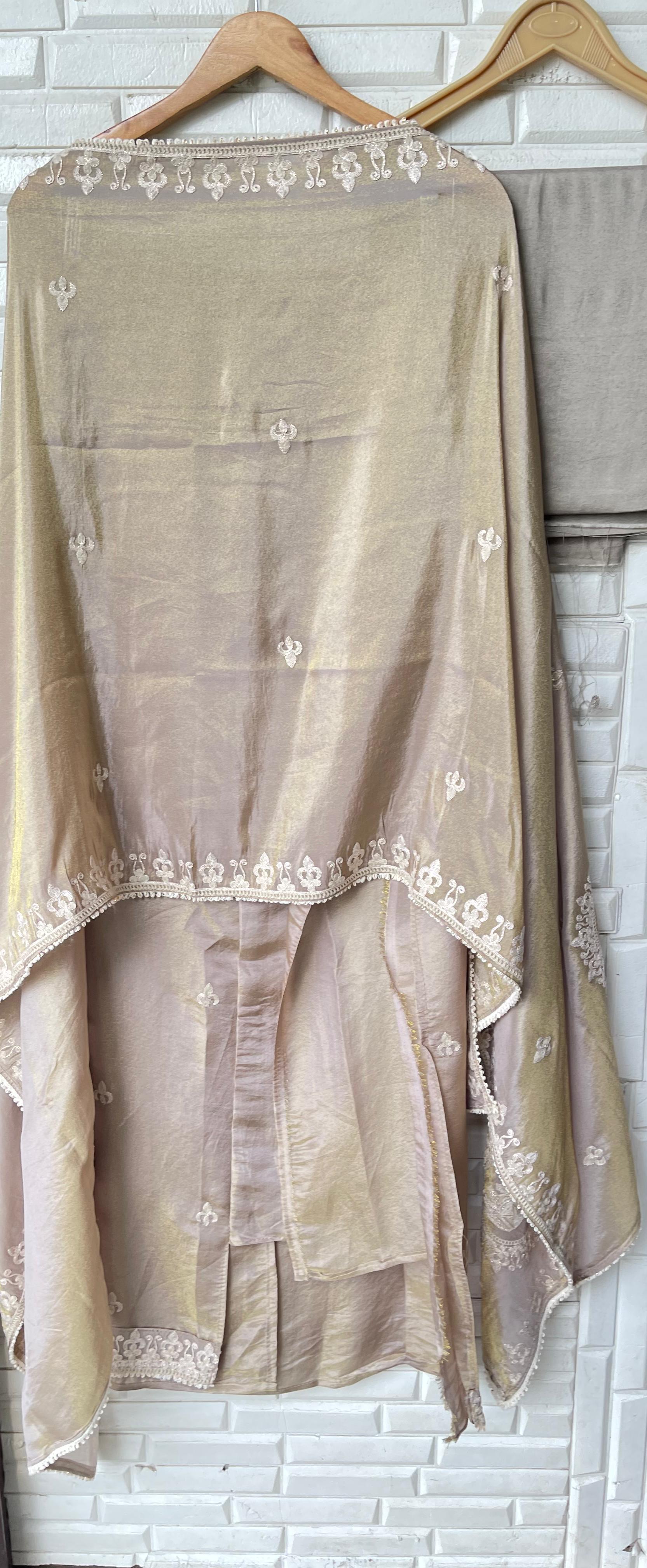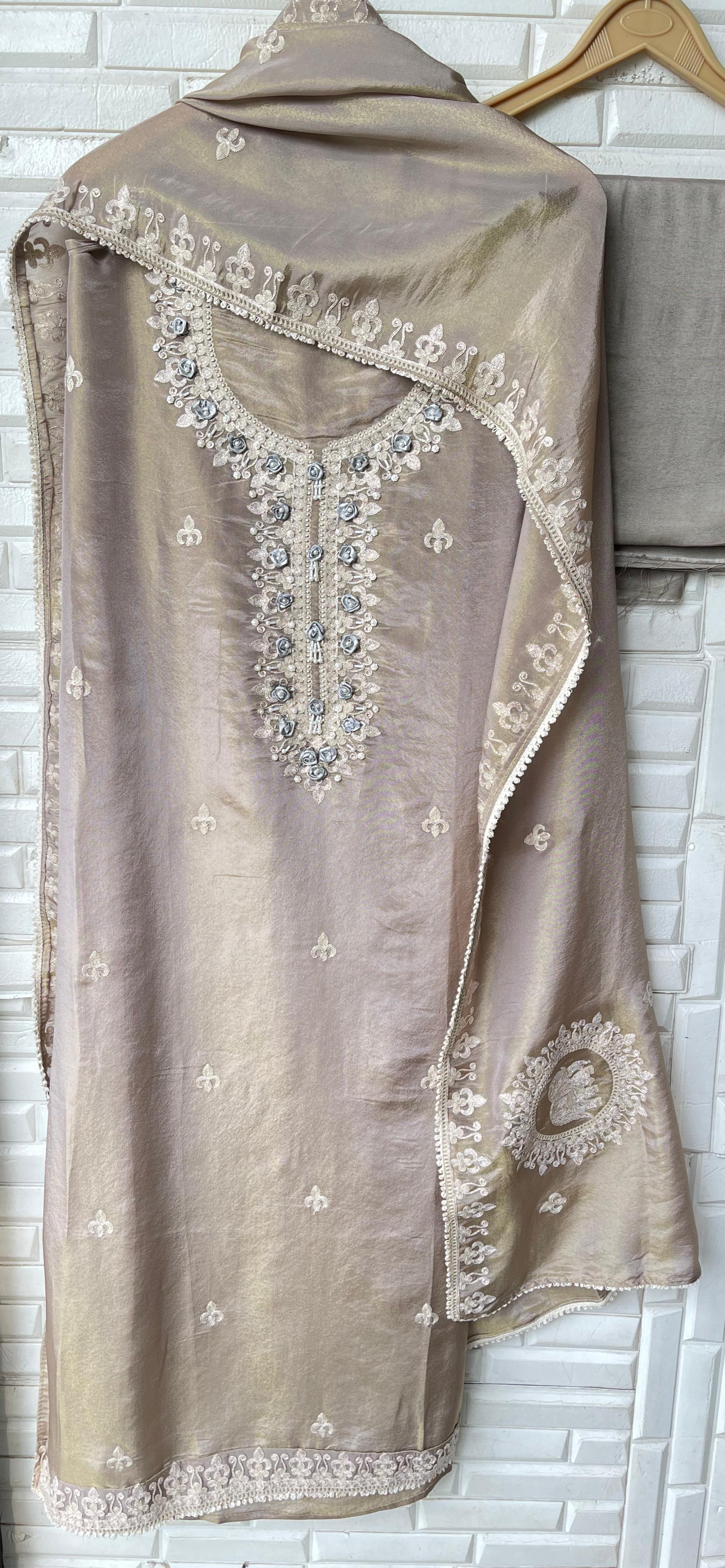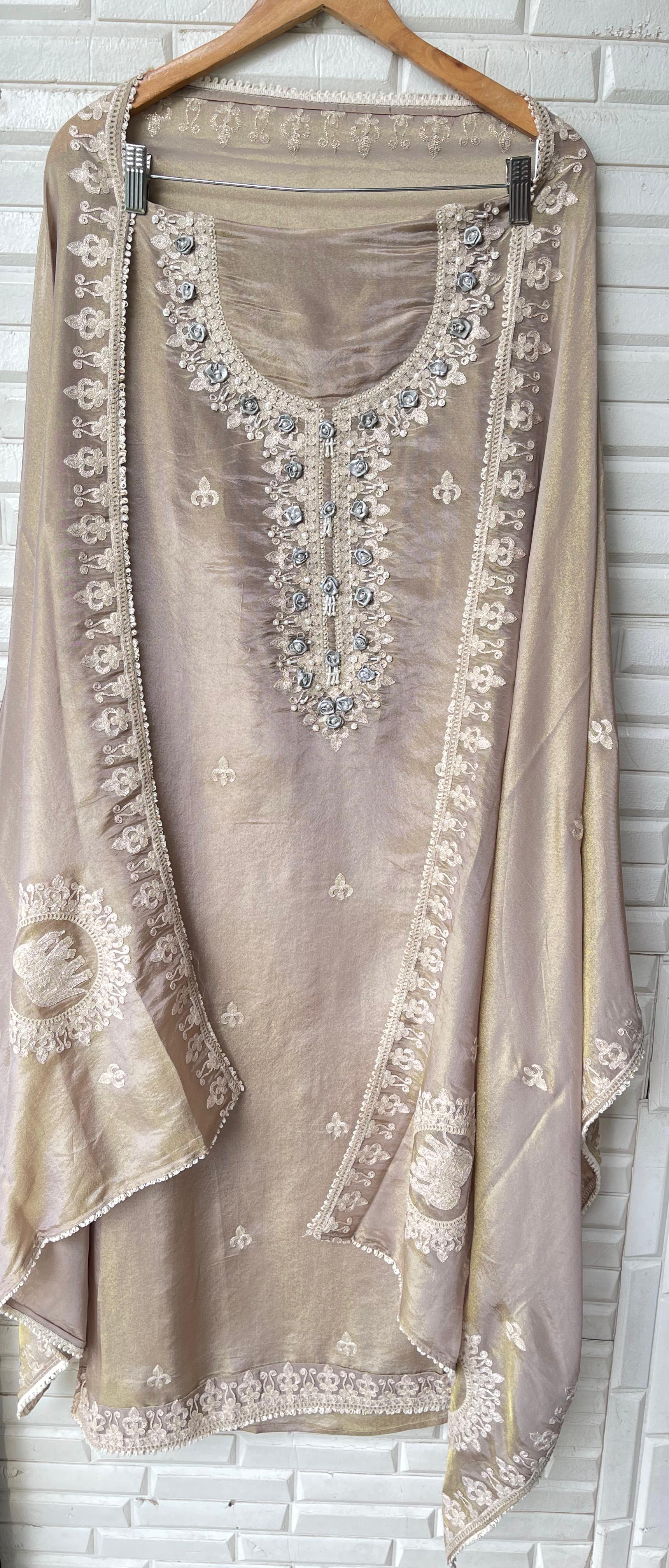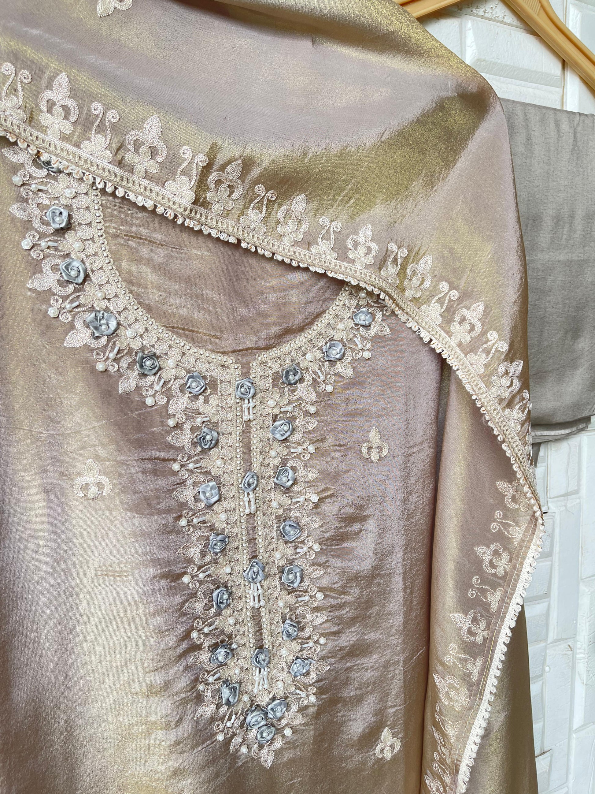π shimmer silk fabric unstitched shirt with resham zari pearl kutdanna neck embroidery and 3D flowers