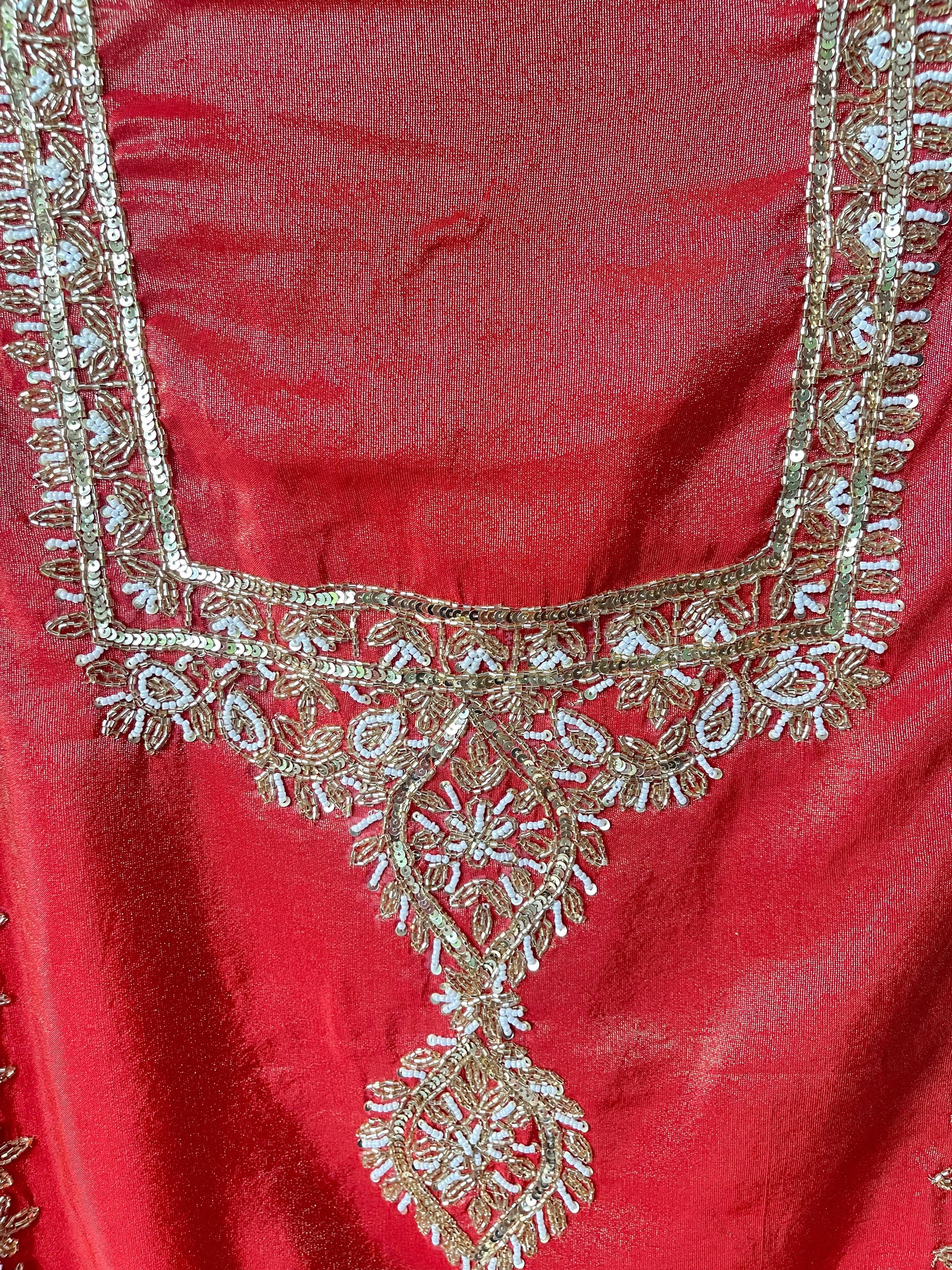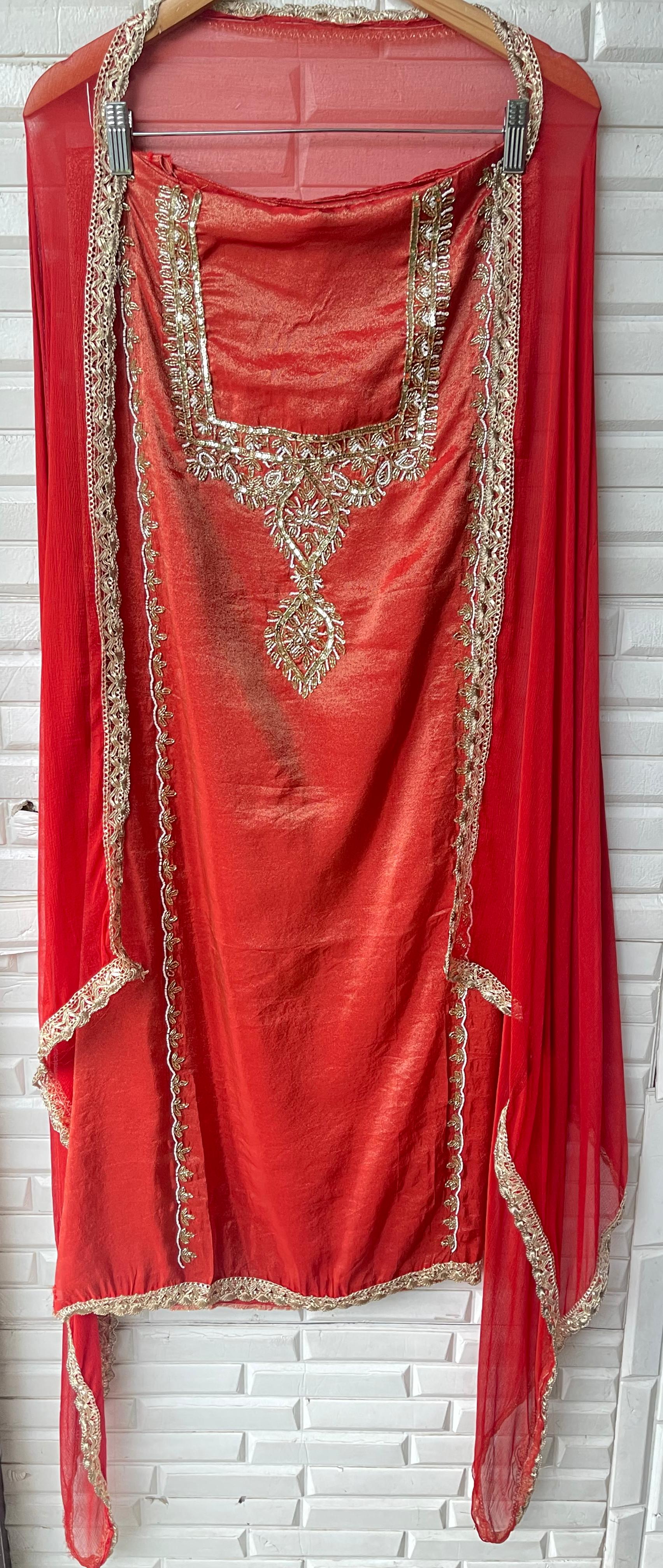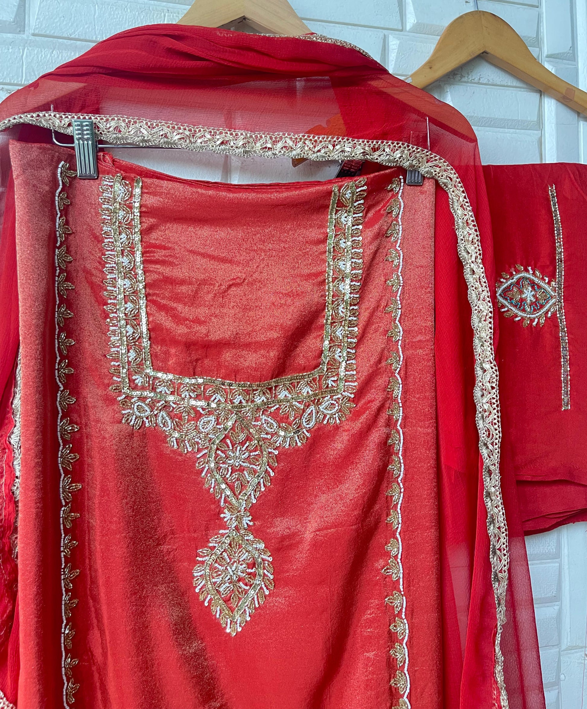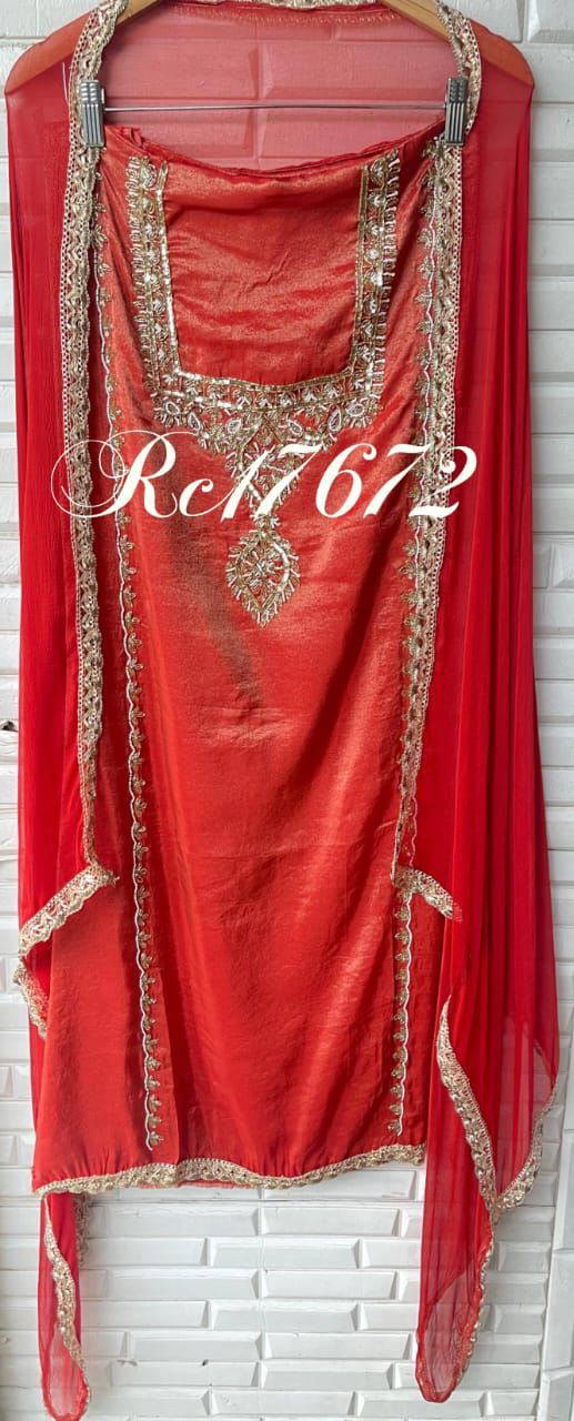 😊 soft n flowy shimmer silk fabric unstitched shirt with zari sequence kutdanna pearl hand embroidery and kingri lace