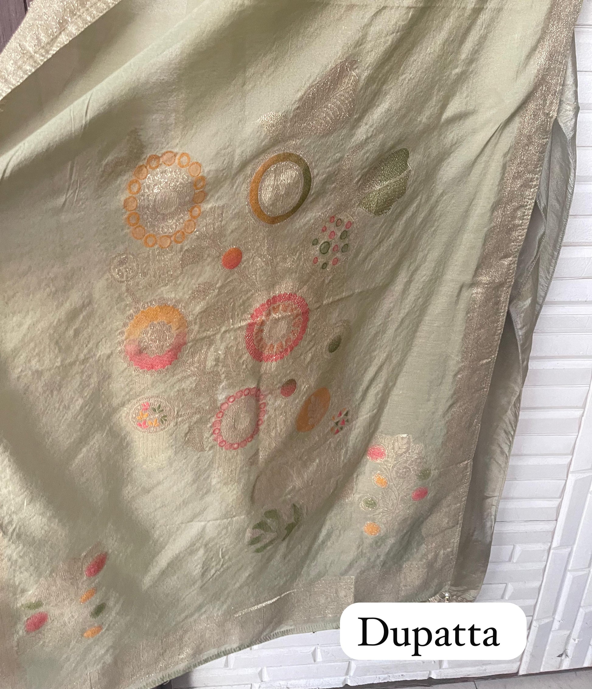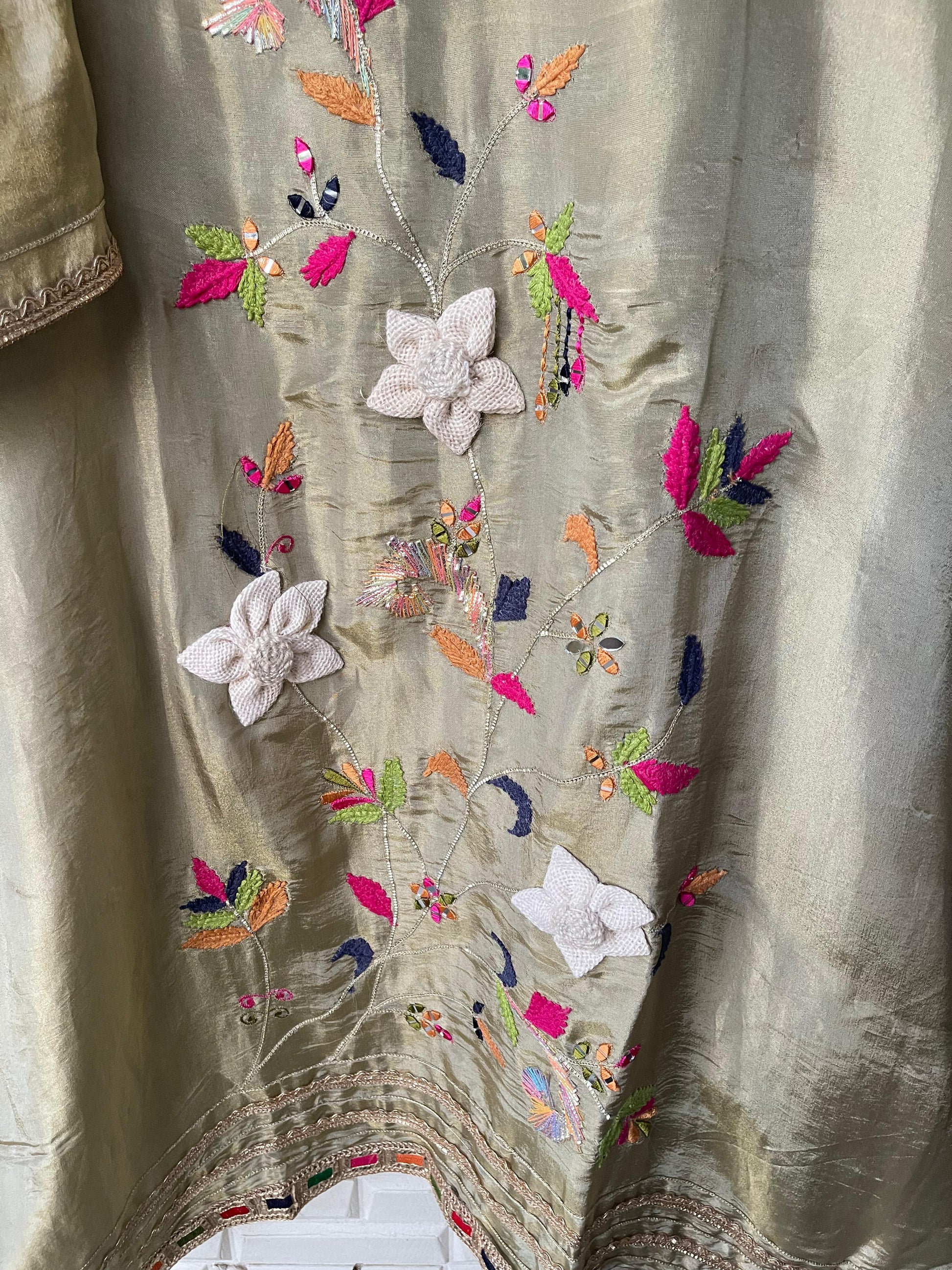 π shimmer silk fabric unstitched shirt with zari resham lace on neck and mirror gotta work resham embroidery ghera lace and 3D flowers