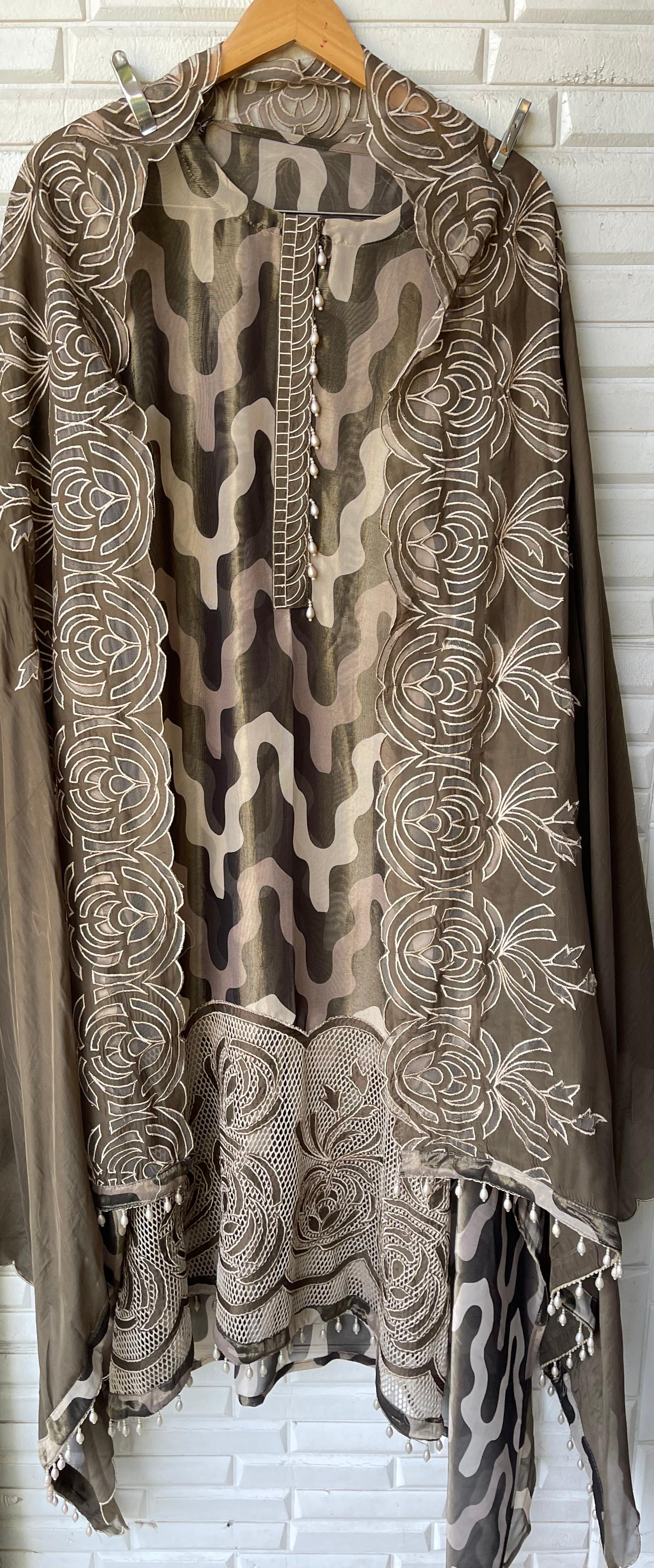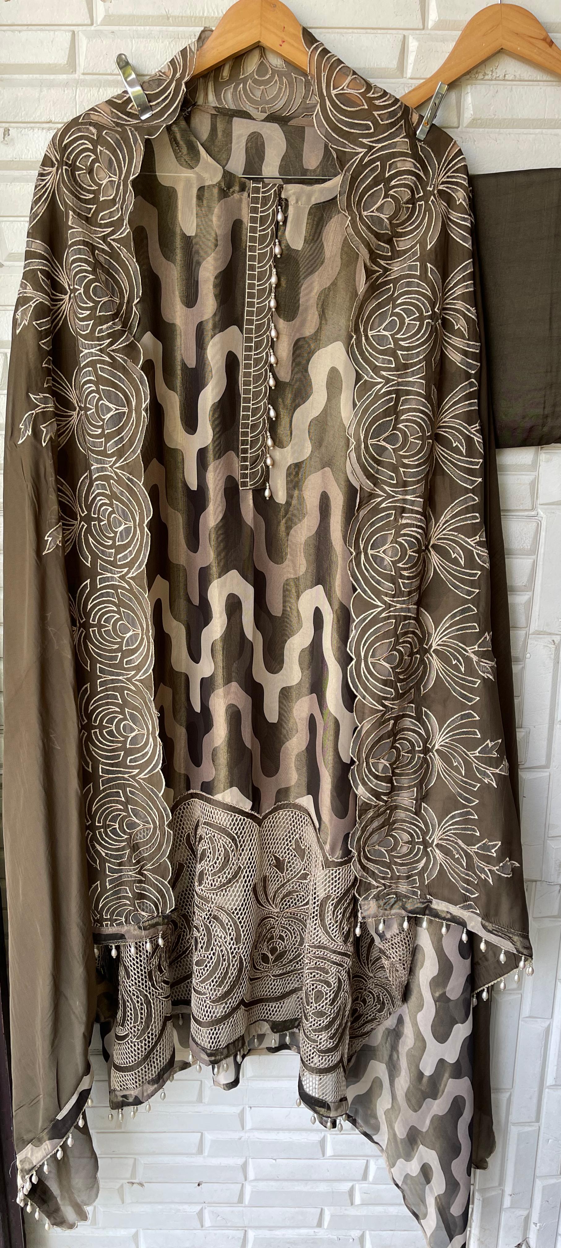 😊 pure soft and flowy shimmer silk printed fabric unstitched shirt with stunning appliqué work on ghera and resham scalping on fabric