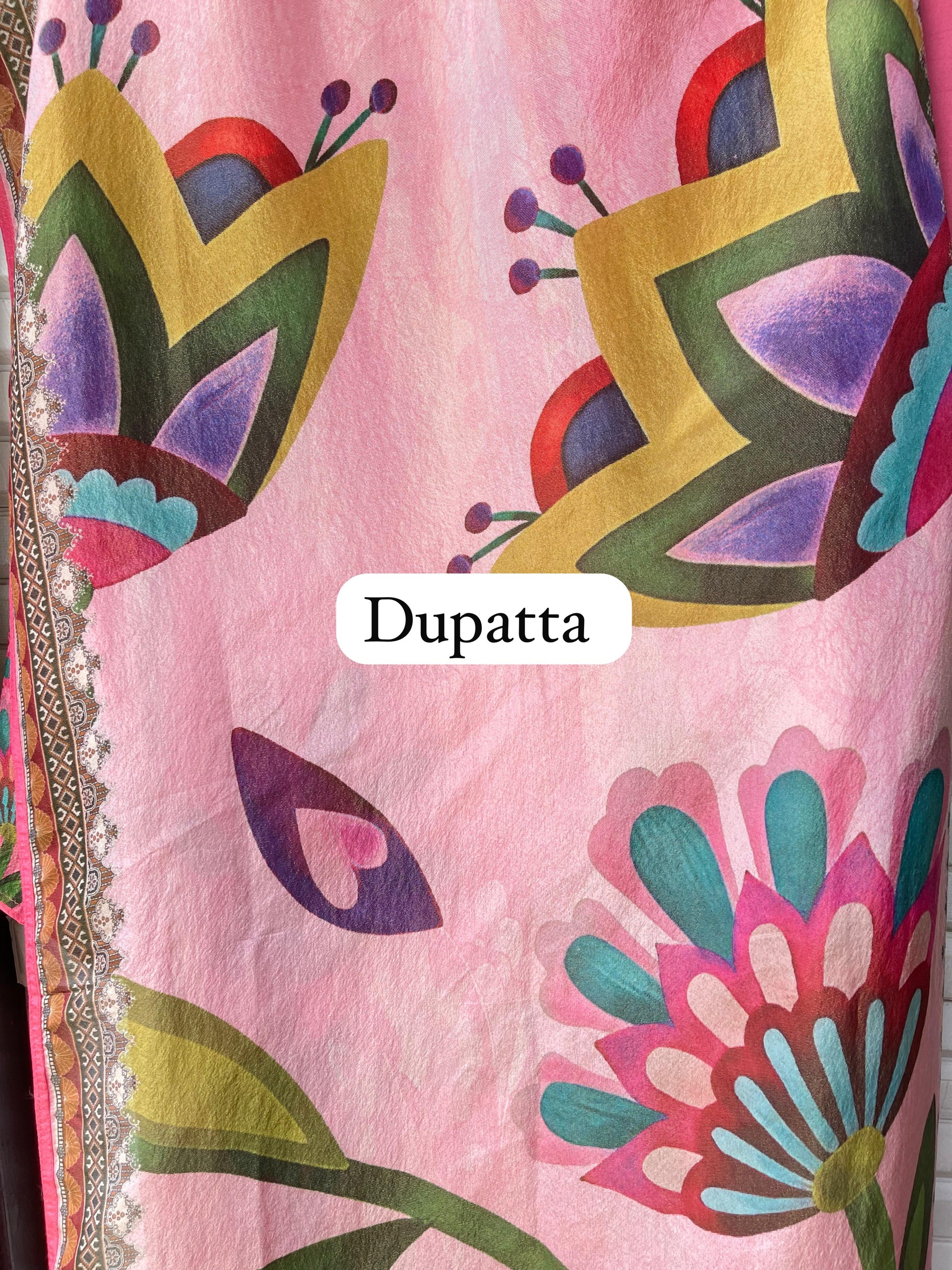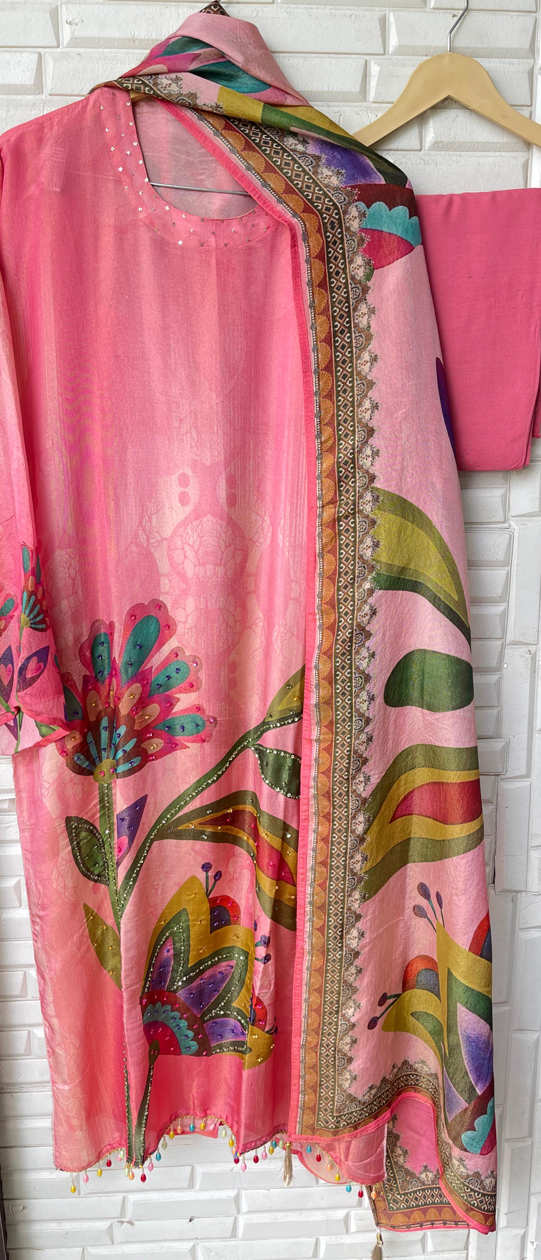 π shimmer silk printed fabric unstitched shirt with swarowski pearl sequence embroidery and ghera pearl work hanging lace