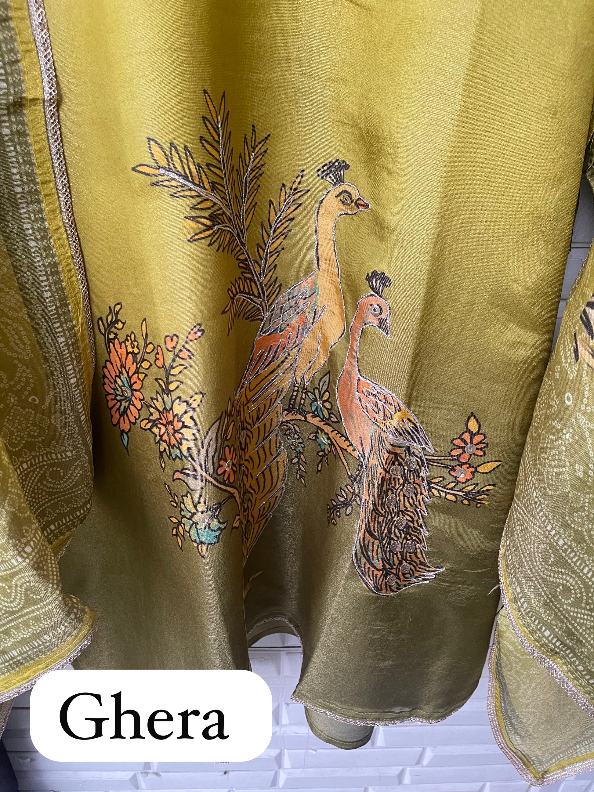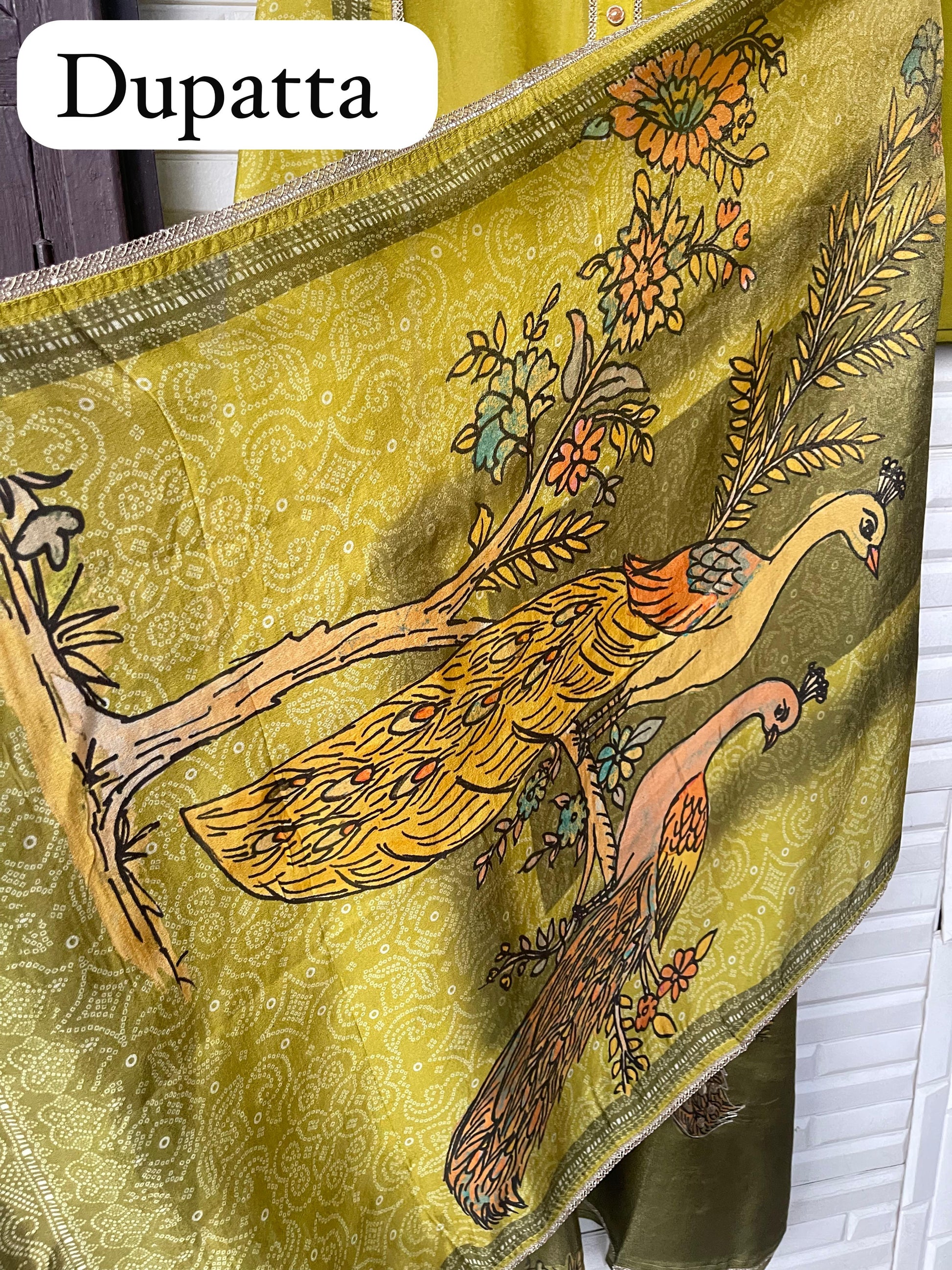 😊 shimmer silk printed fabric unstitched shirt with zari swarowski leather embroidery