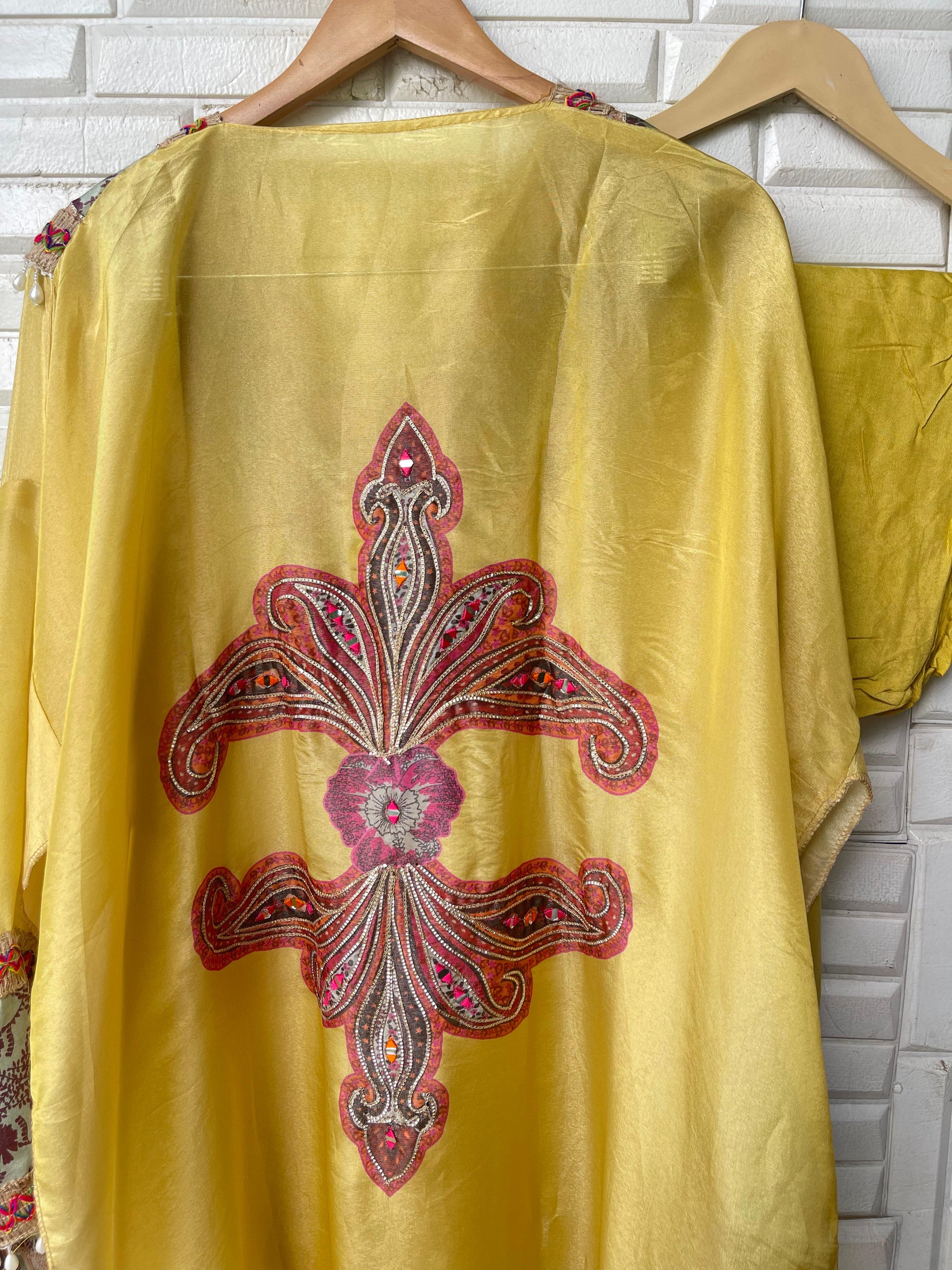 ๐ soft and flowey shimmer silk printed fabric unstitched shirt with actual mirror gotta lace work resham embroidery and jute fabric patched neck work with pearl hanging