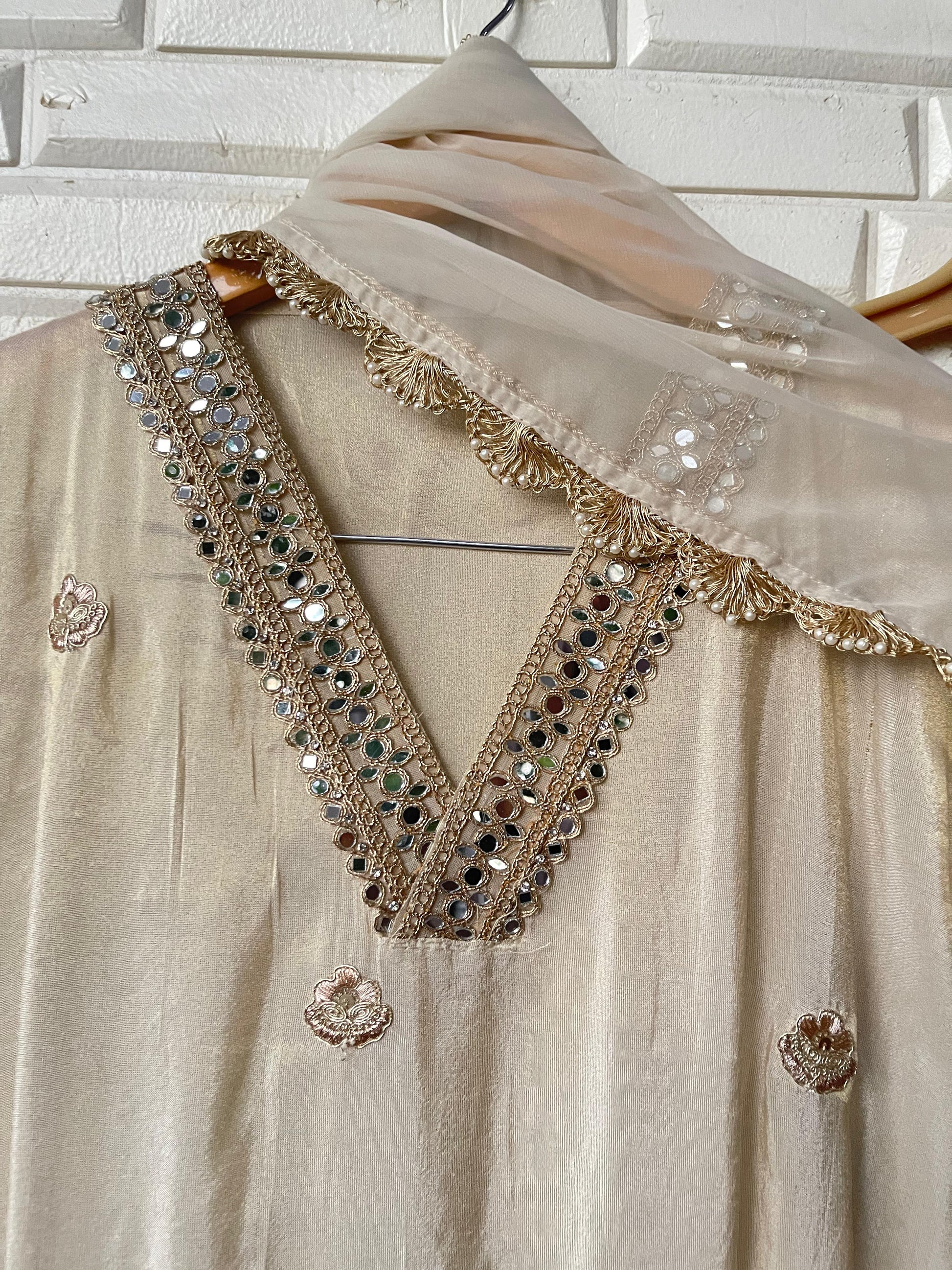 π shimmer silk fabric unstitched shirt with mirror work zari highlighting on neck work and zari sequence embroidery and ghera scalping