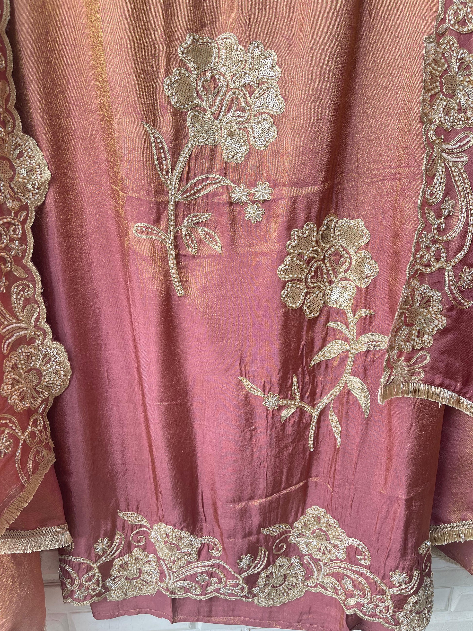 😊 shimmer silk fabric unstitched shirt with resham scalping resham kutdanna pearl zari sequence embroidery